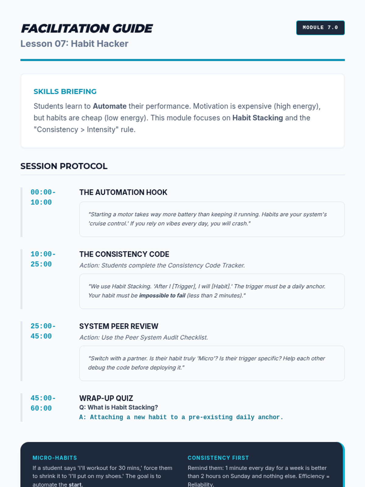 Focuses on the second 'P' (Purpose), guiding students to connect their daily actions to their deeper 'Why' to sustain effort when things get tough.