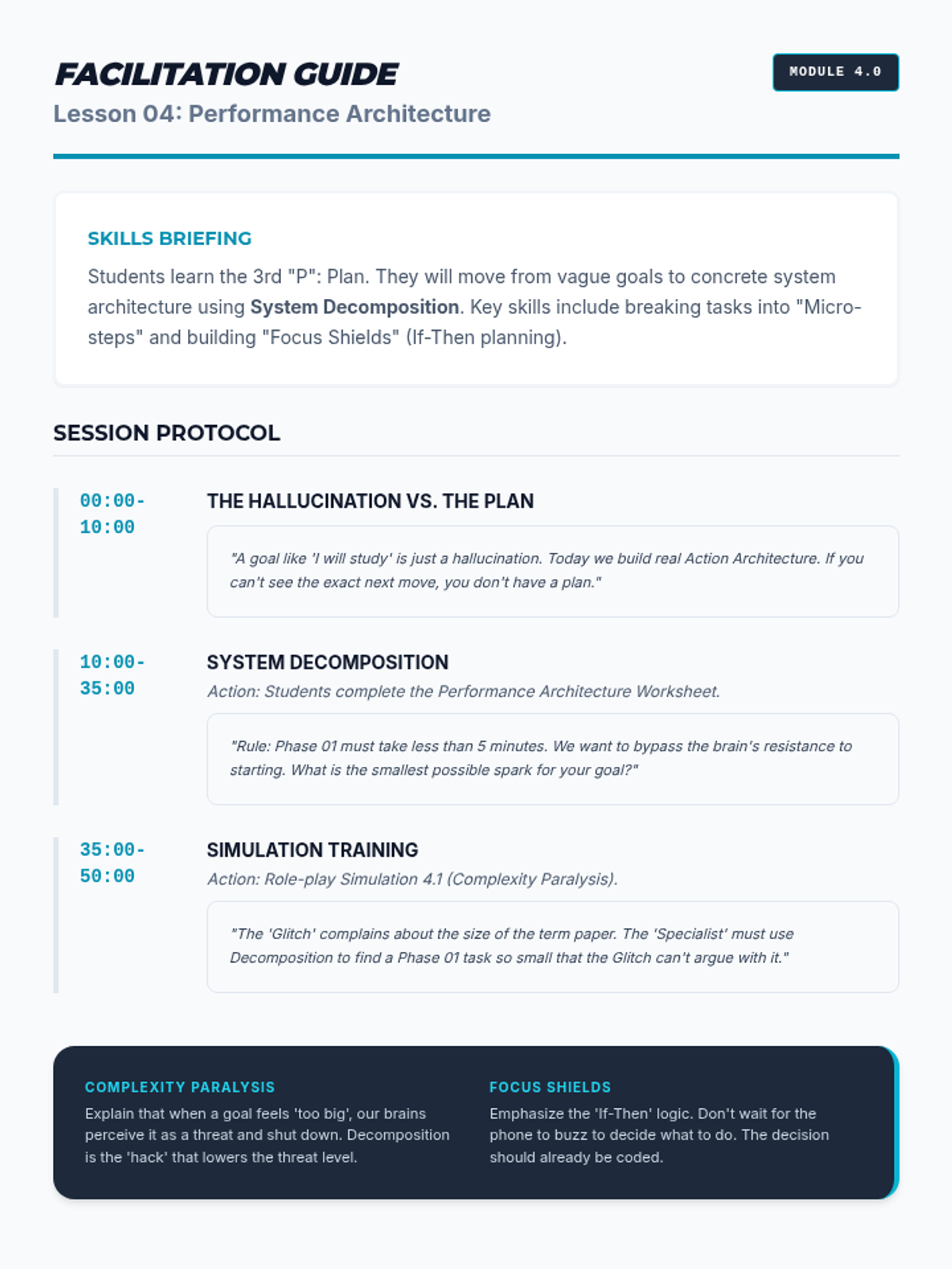 Teaches the third 'P' (Plan), where students turn vague goals into concrete, actionable steps using the Action Plan Builder.