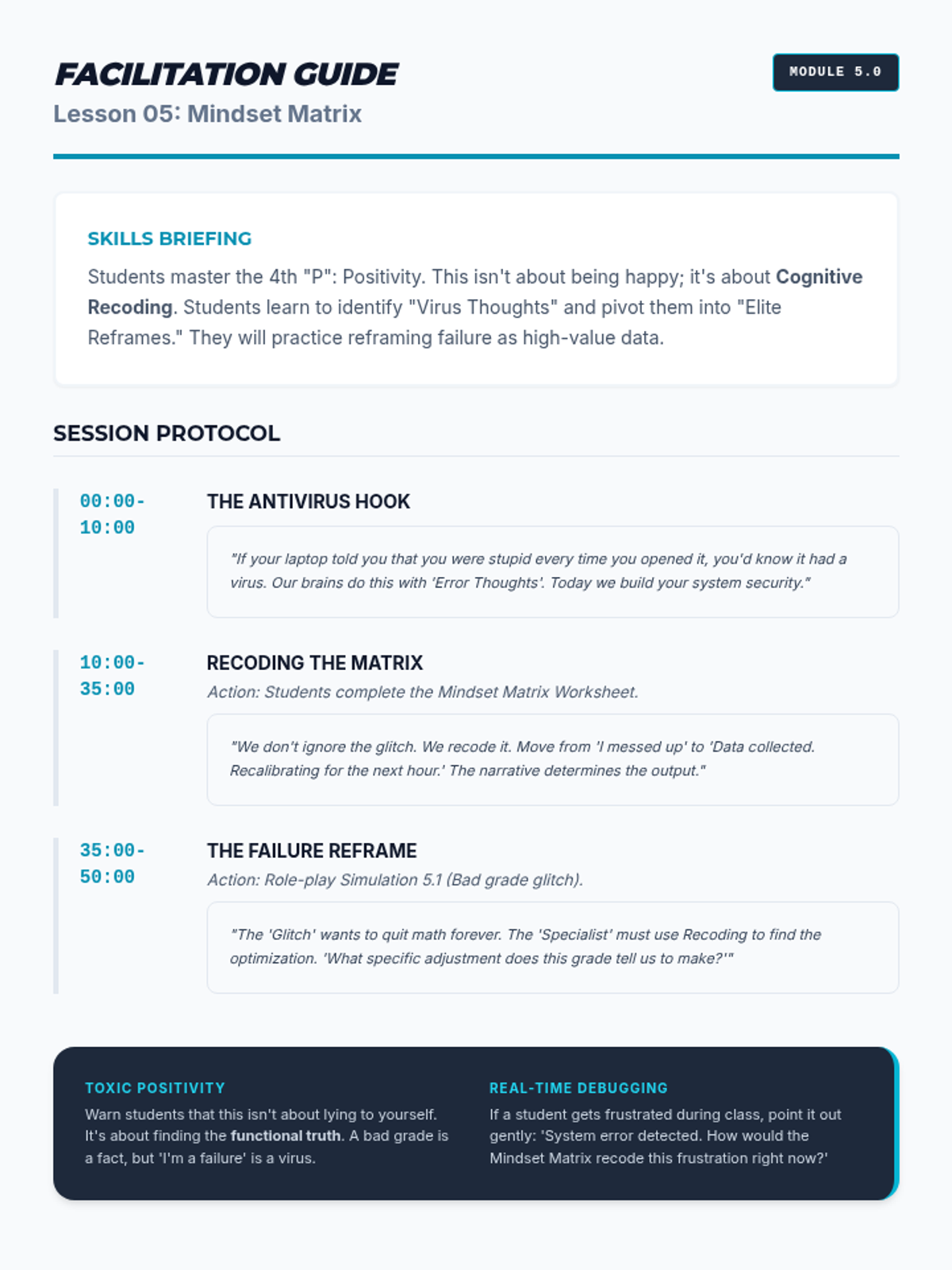 Covers the fourth 'P' (Positivity), teaching students to reframe negative thoughts and maintain a growth mindset during setbacks.