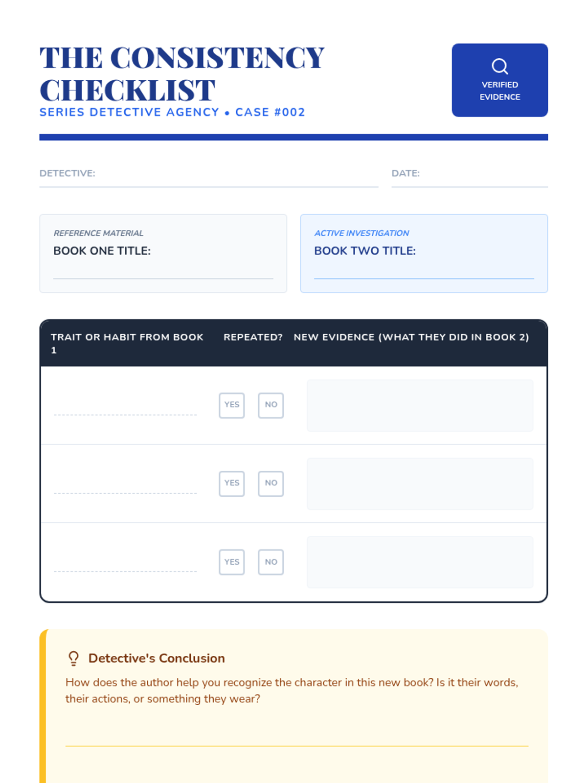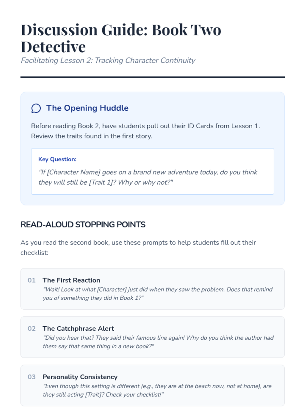 Students track recurring traits in a second book from the same series to identify continuity and author patterns.