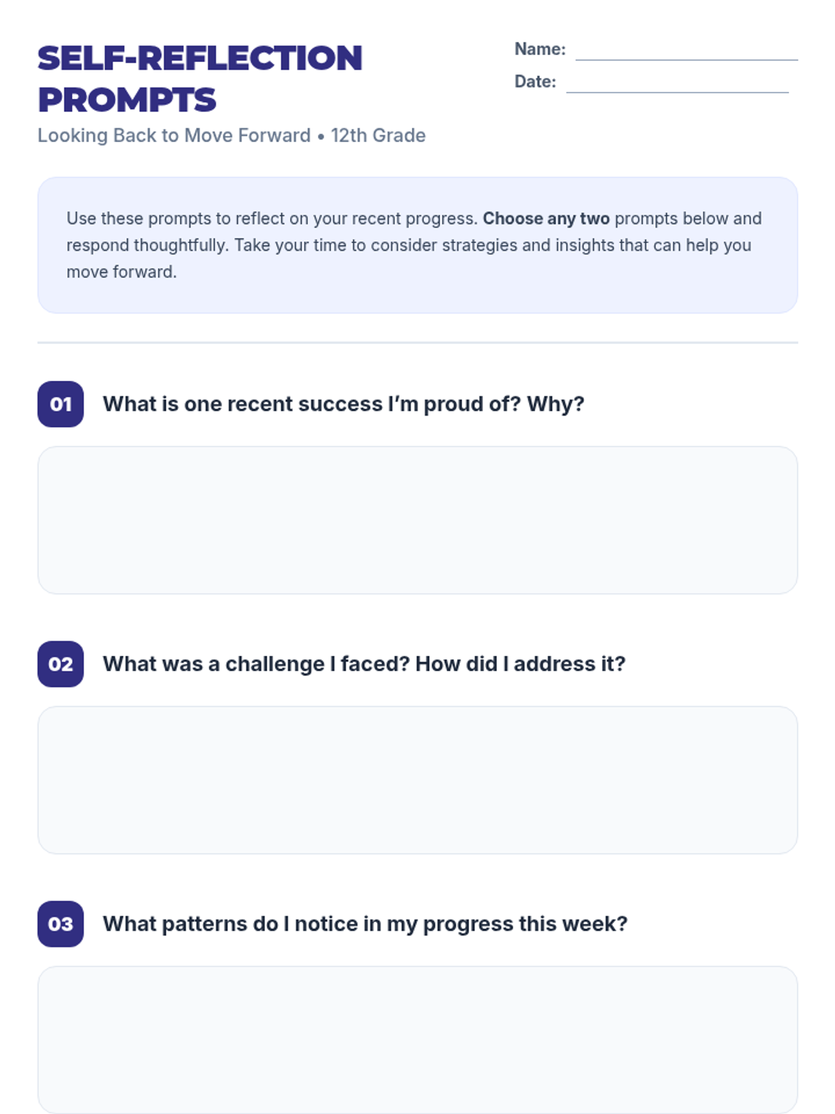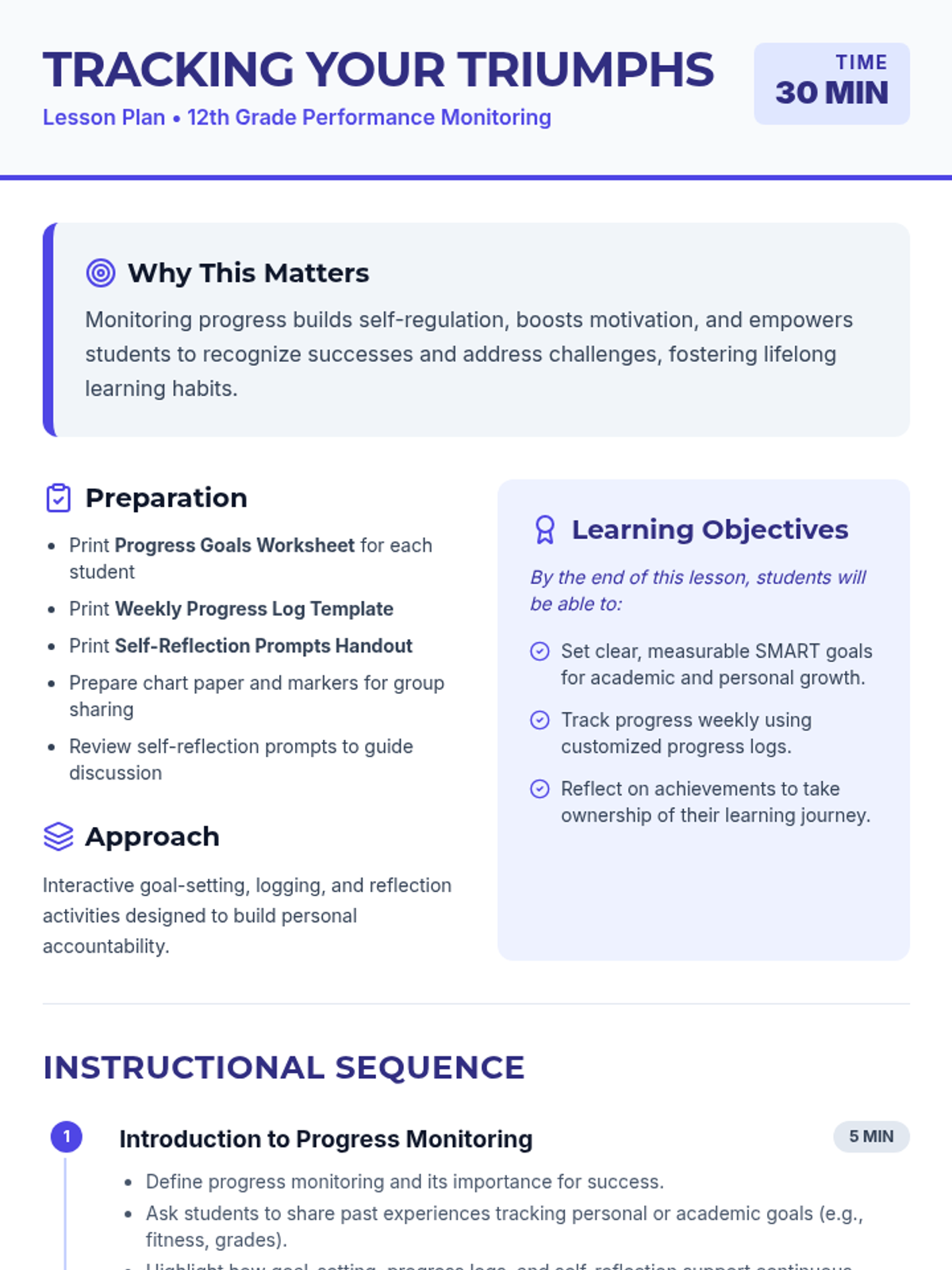 A 30-minute lesson for 12th graders on monitoring academic and personal progress through SMART goal-setting, progress logging, and self-reflection to build self-regulation and celebrate achievements.