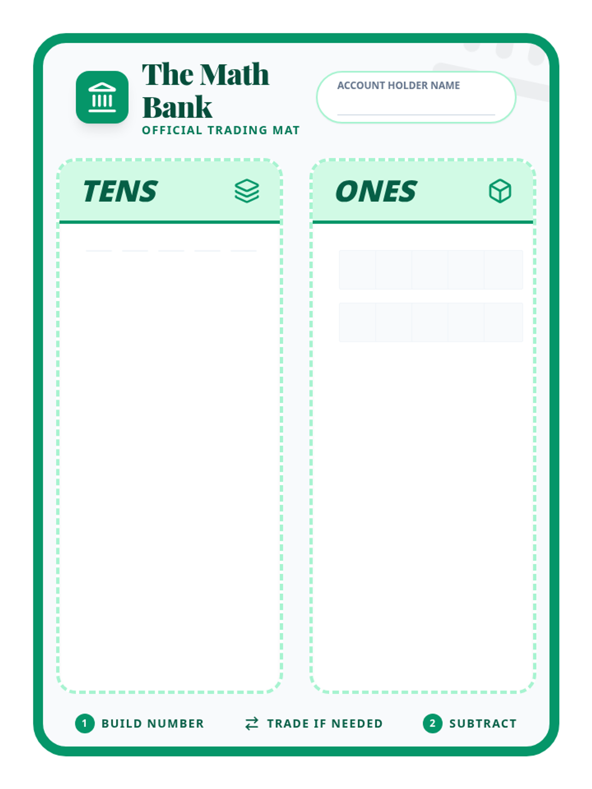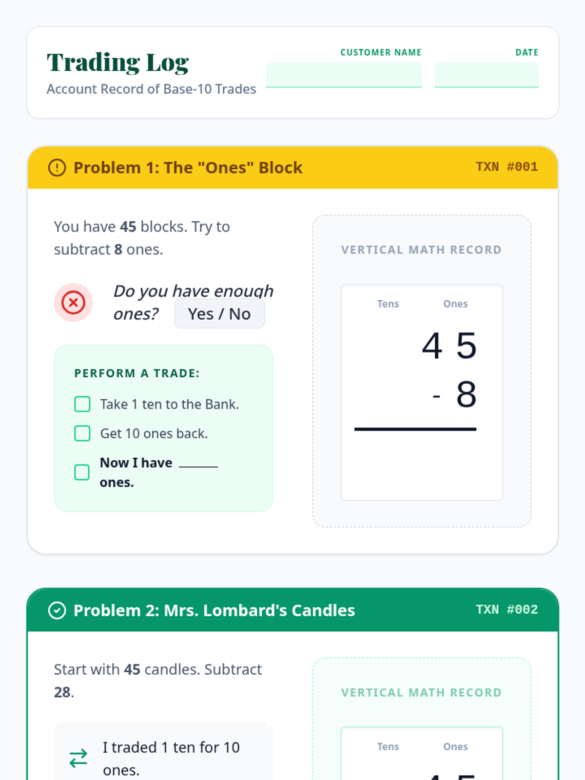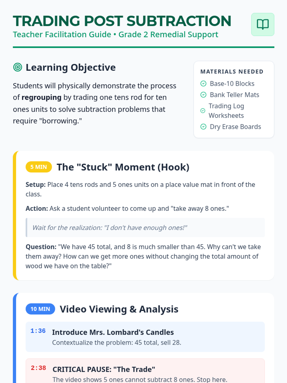 A hands-on remedial lesson for 2nd graders focusing on subtraction with regrouping. Students use a 'Bank' metaphor to physically trade tens rods for ones units, mirroring the vertical subtraction process.