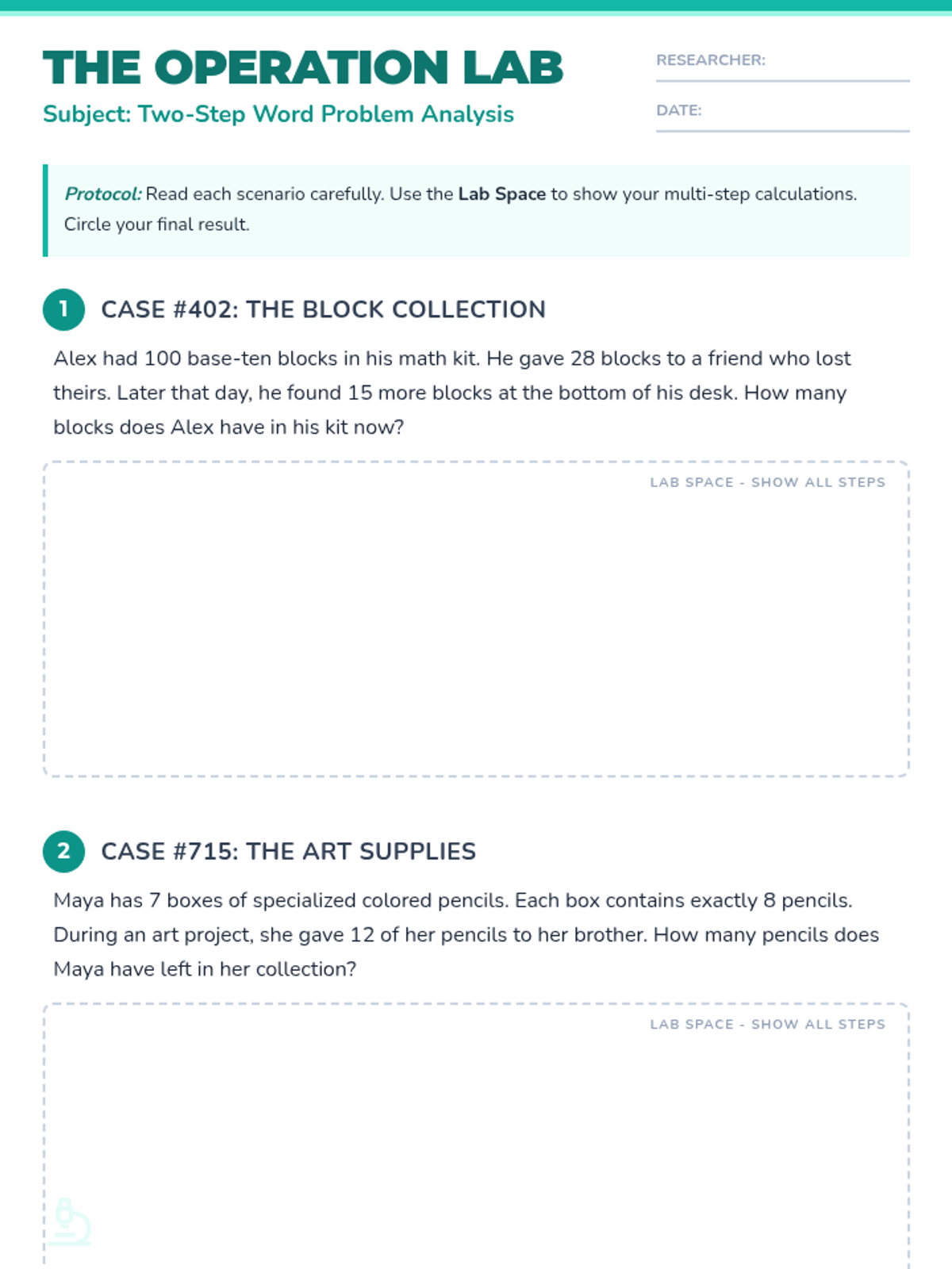 A lesson focused on solving two-step word problems involving addition, subtraction, multiplication, and division. Students practice breaking down complex problems and showing their mathematical thinking in a structured workspace.