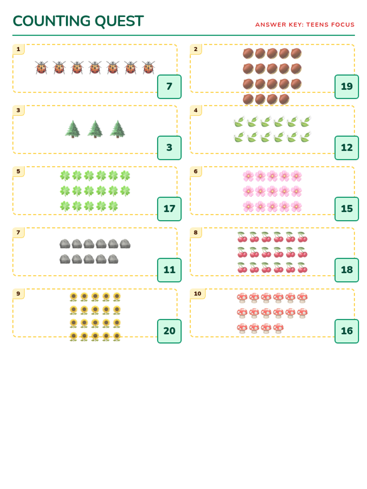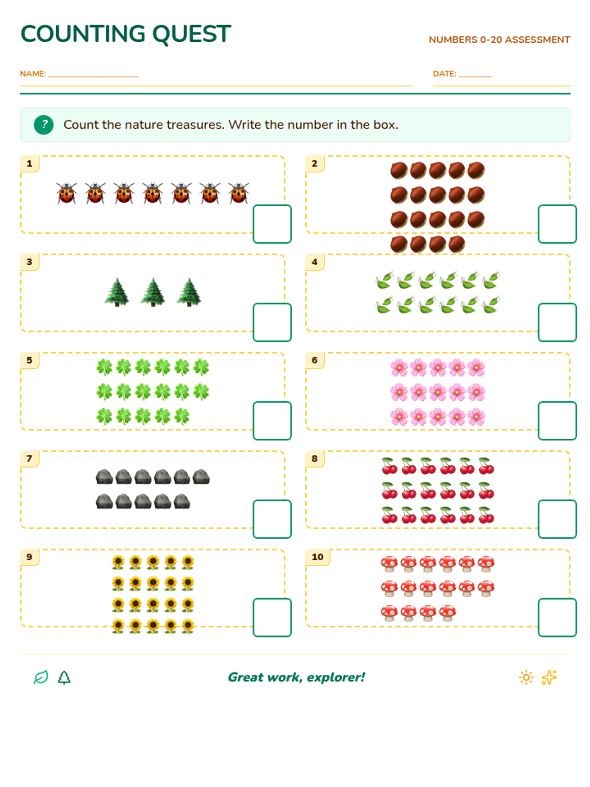 Students will practice counting groups of objects and writing the corresponding numeral from 0 to 20 in a nature-themed assessment.
