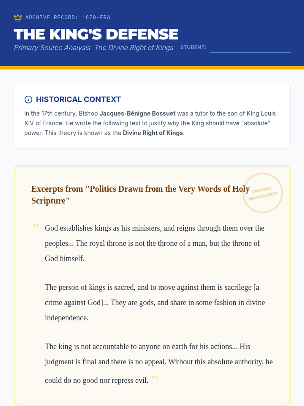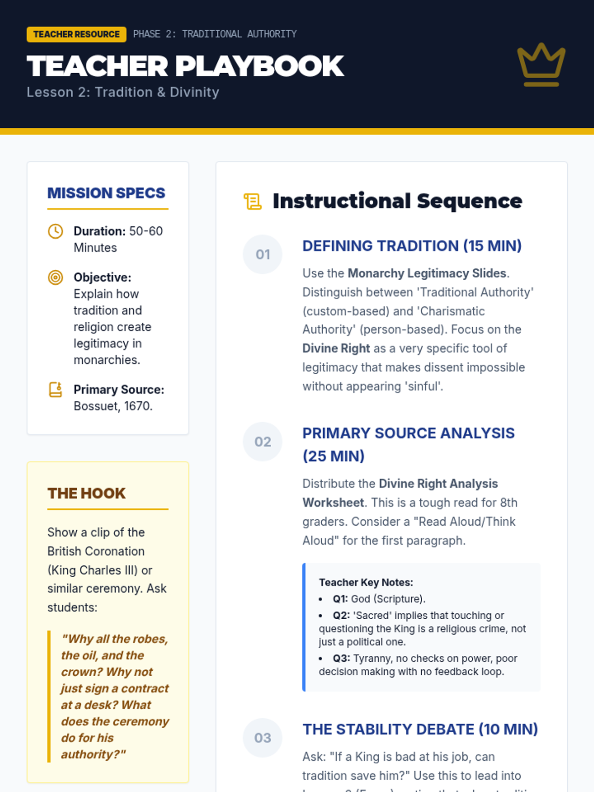 This lesson explores how historical monarchies established legitimacy through tradition and religious endorsement, specifically the Divine Right of Kings.