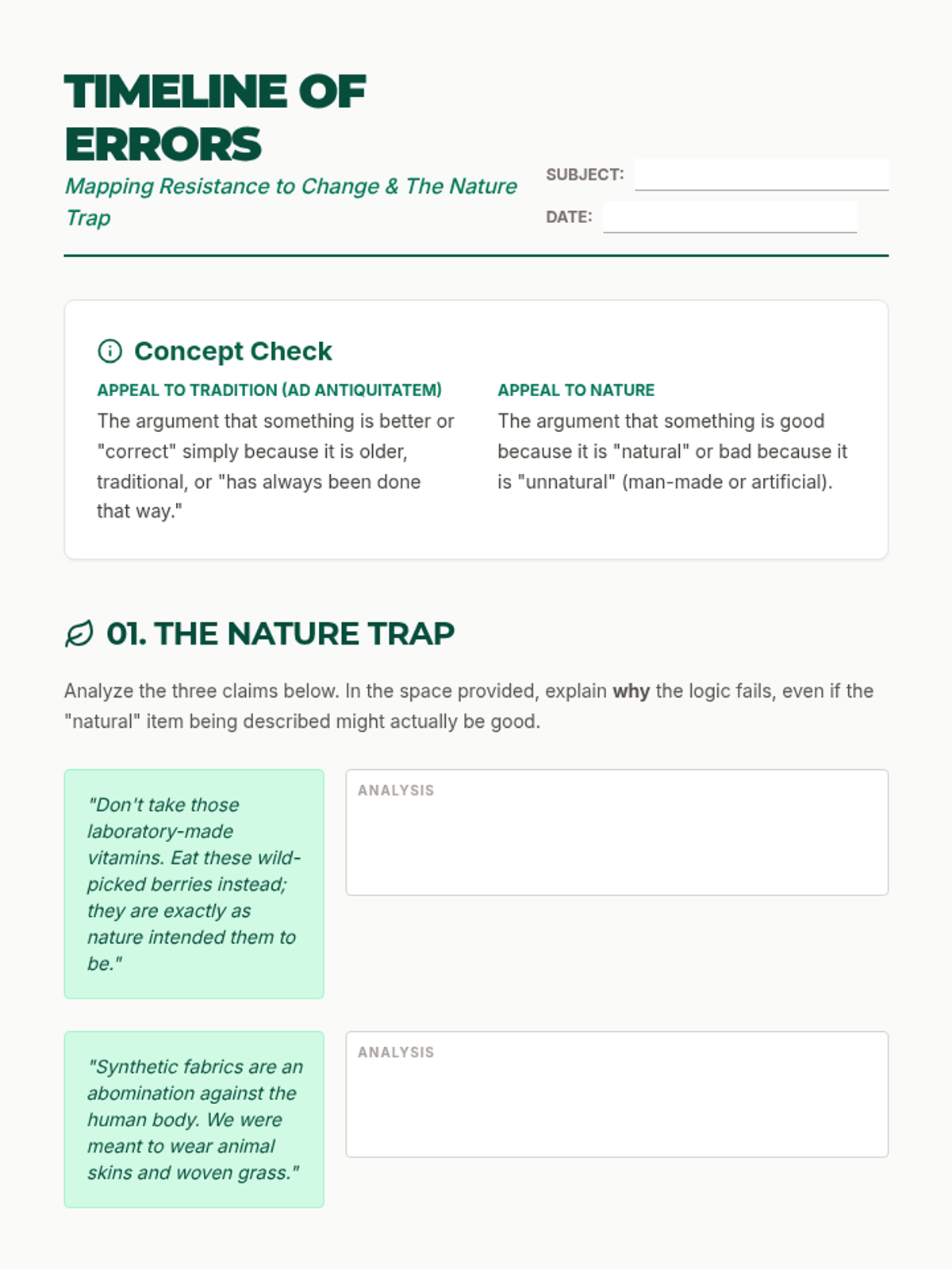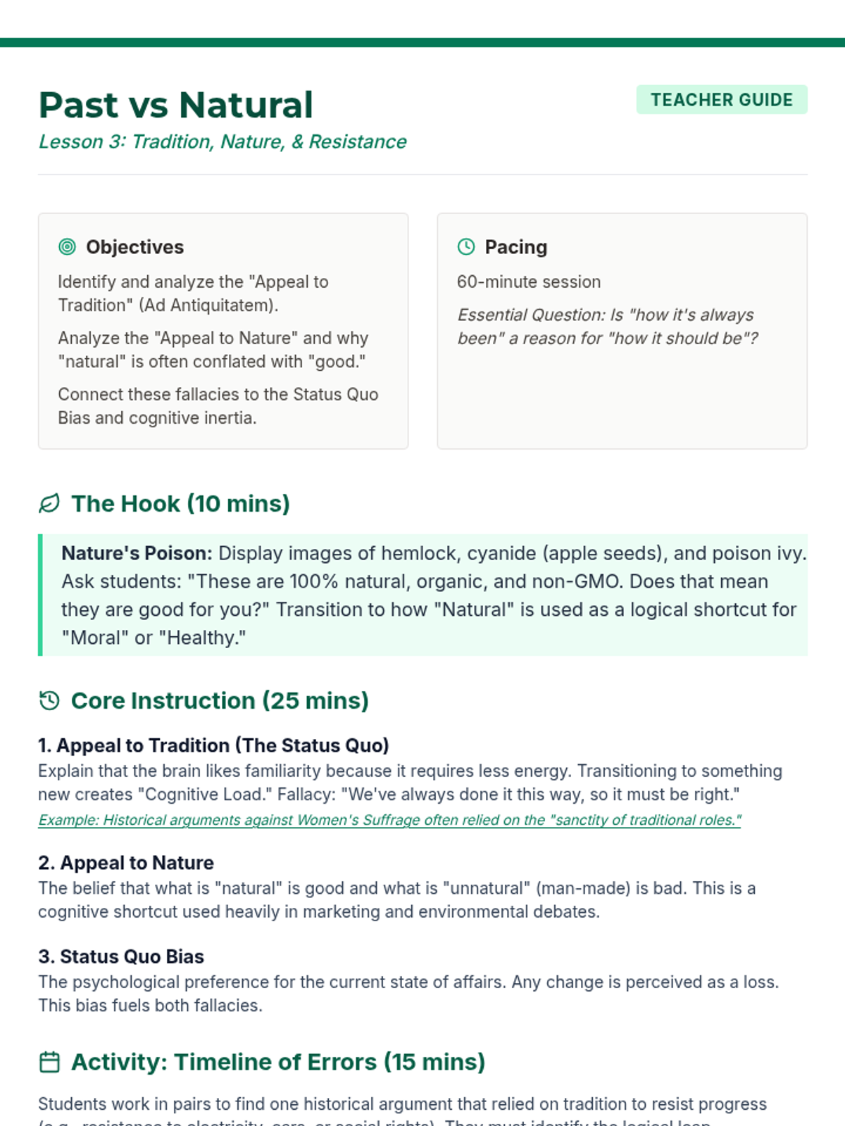 Analyzes the 'Appeal to Tradition' and 'Appeal to Nature' fallacies, examining how resistance to change fuels illogical arguments throughout history.