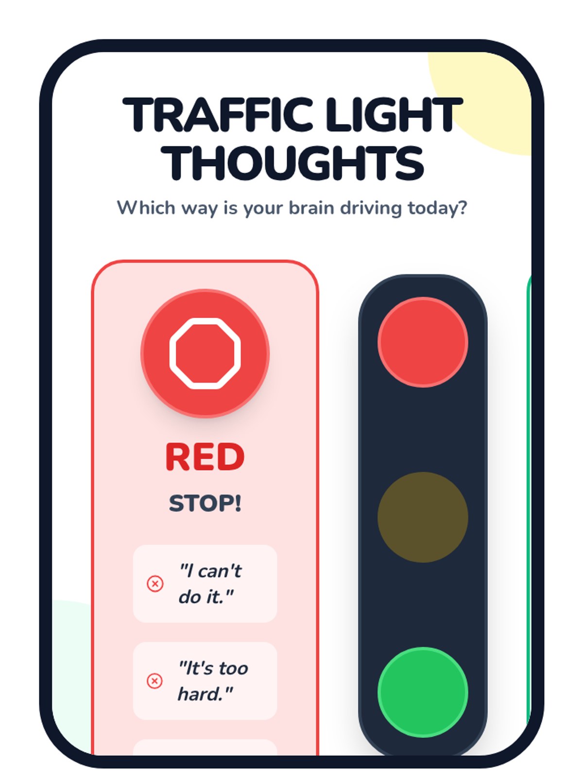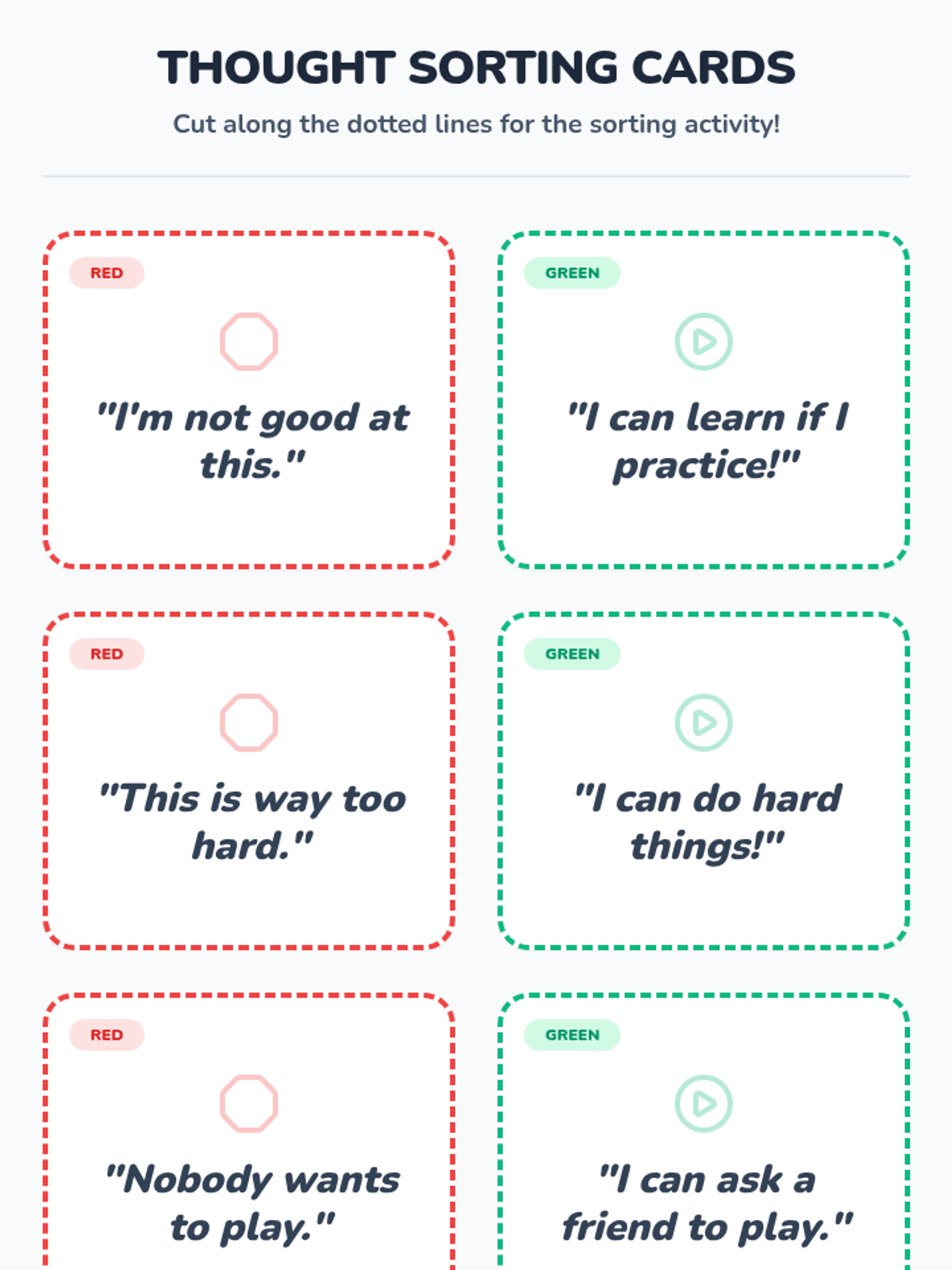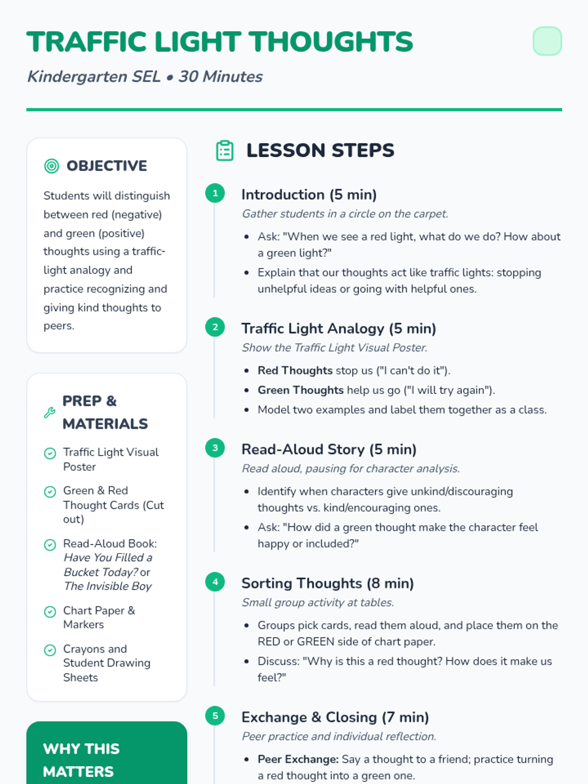 A foundational SEL lesson for Kindergarten students using a traffic-light analogy to identify and manage 'red' (negative) and 'green' (positive) thoughts. Students will learn self-awareness and emotional regulation through sorting activities and a read-aloud.