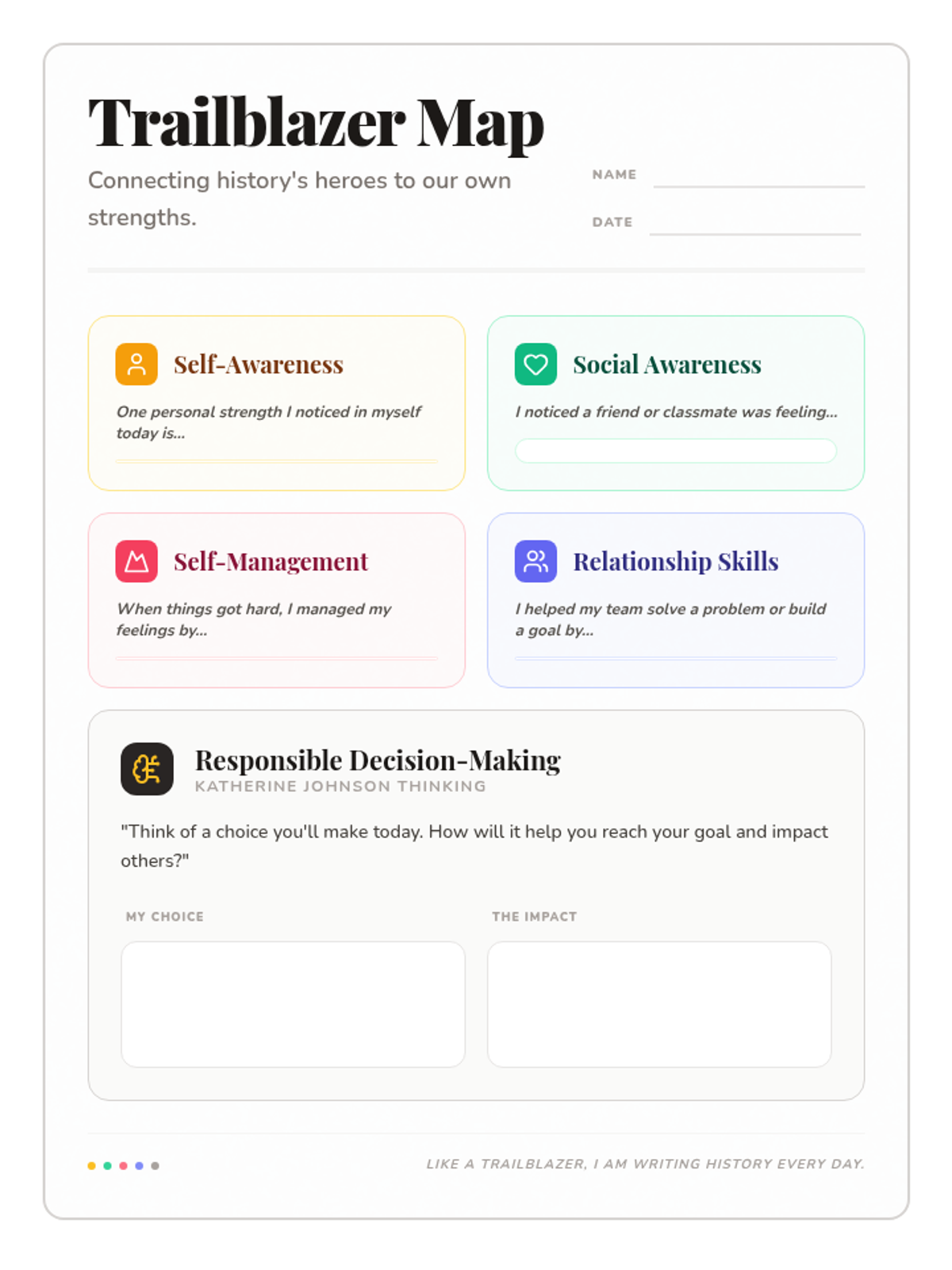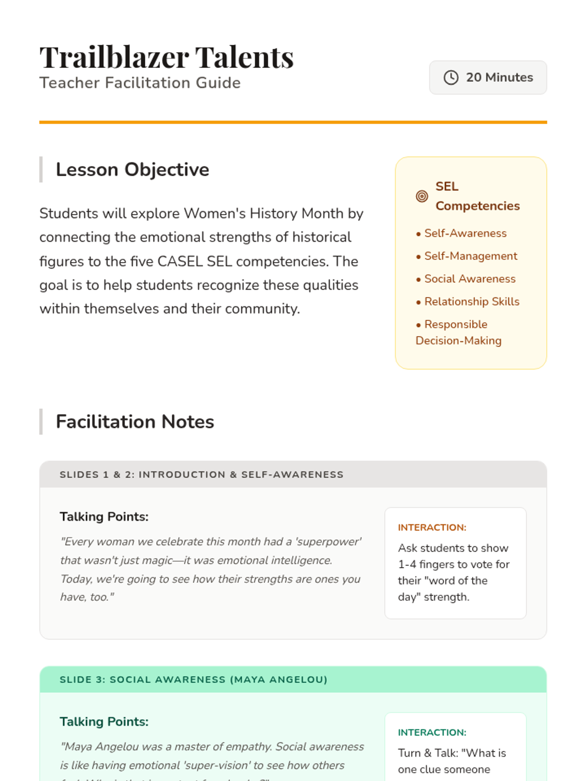 A 20-minute interactive SEL lesson exploring Women's History Month through the lens of the five CASEL competencies. Students will identify their own strengths while learning about the emotional intelligence of historical trailblazers.