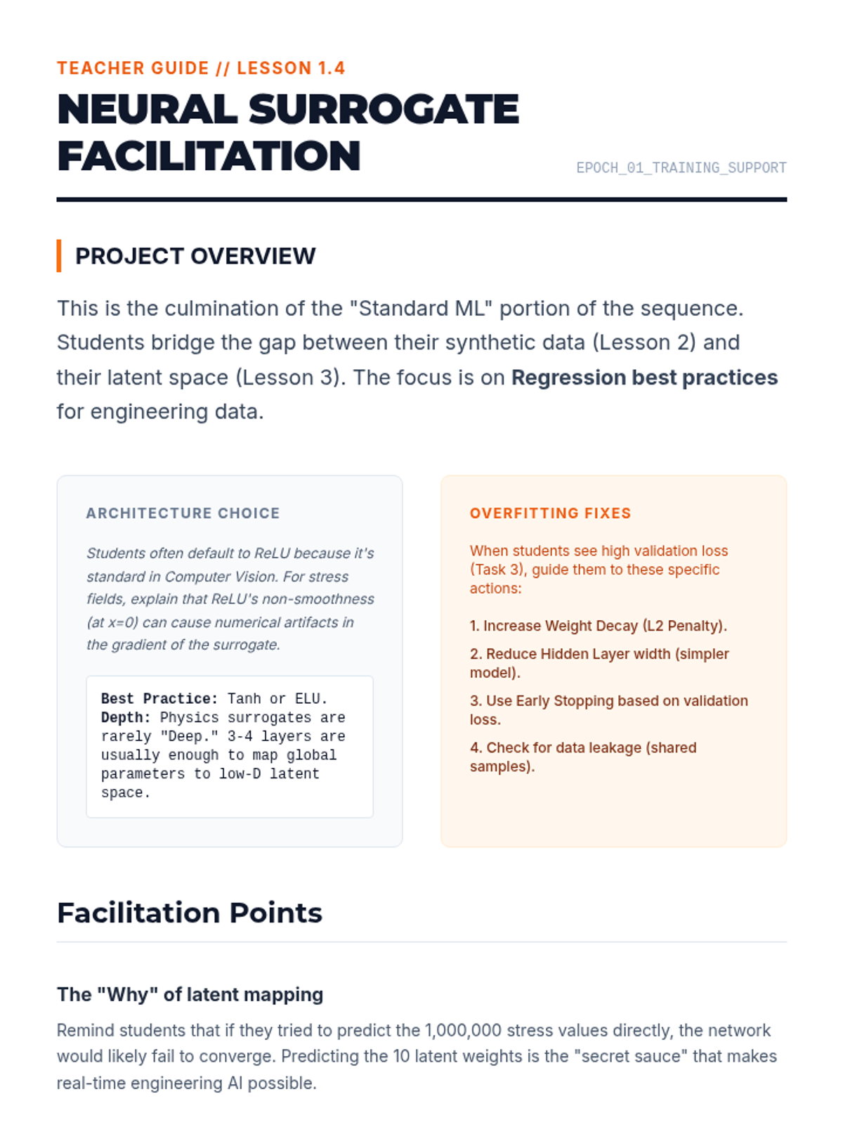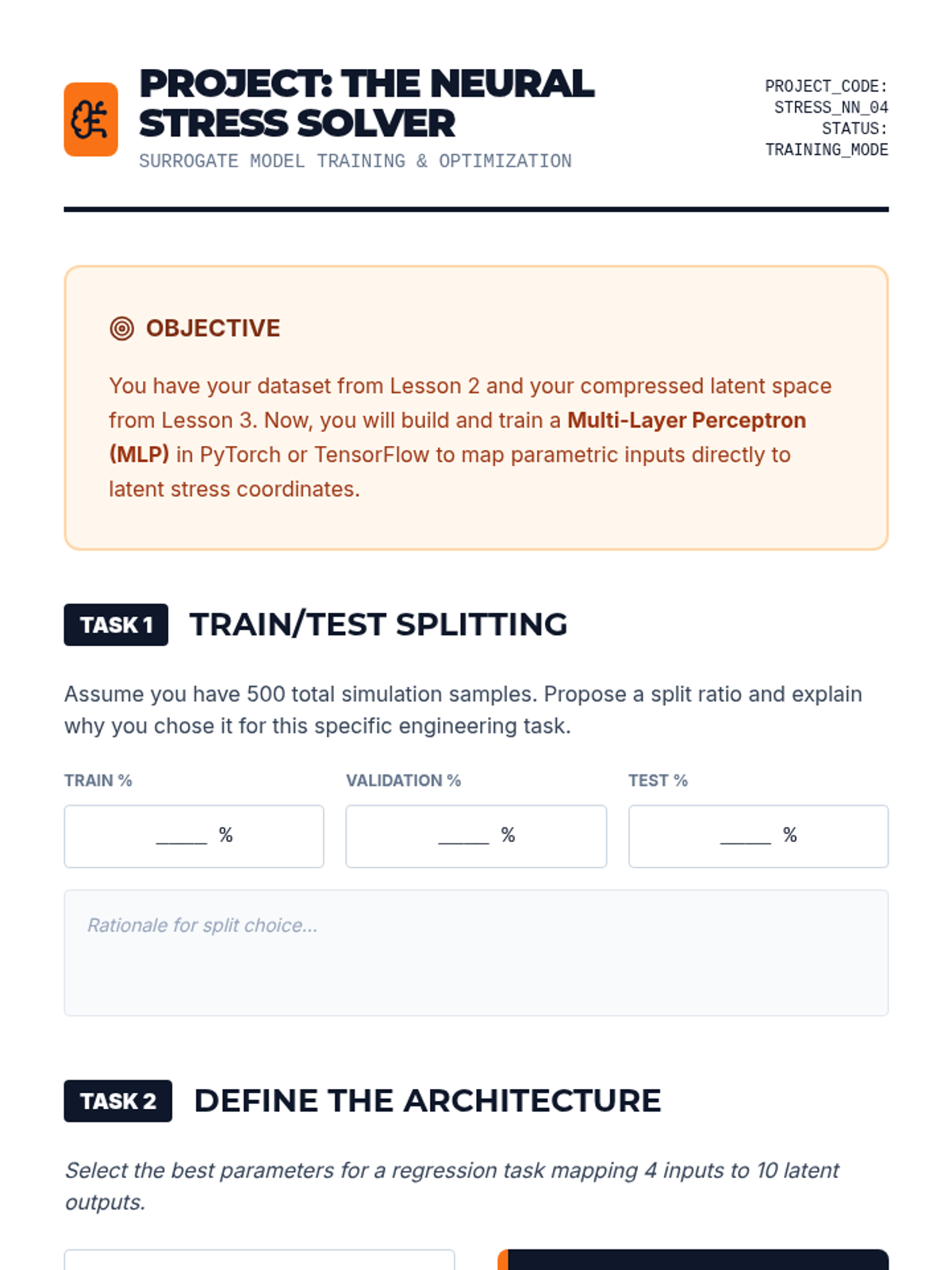 Students train neural networks to map input parameters to compressed stress representations, exploring hyperparameter tuning and regression for physical domains.