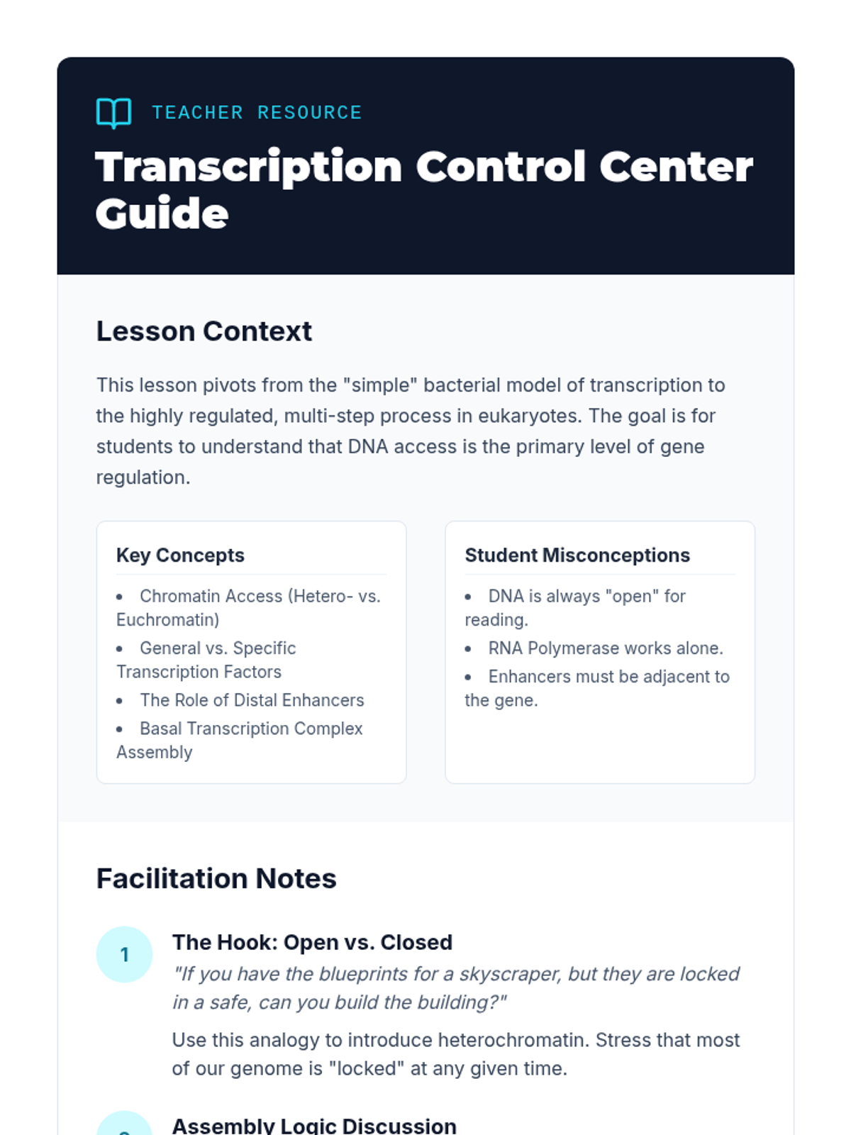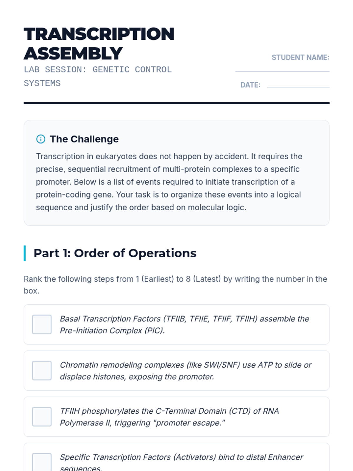 Students explore the eukaryotes' transcription initiation complex, focusing on promoters, enhancers, and the role of transcription factors in differential gene expression.
