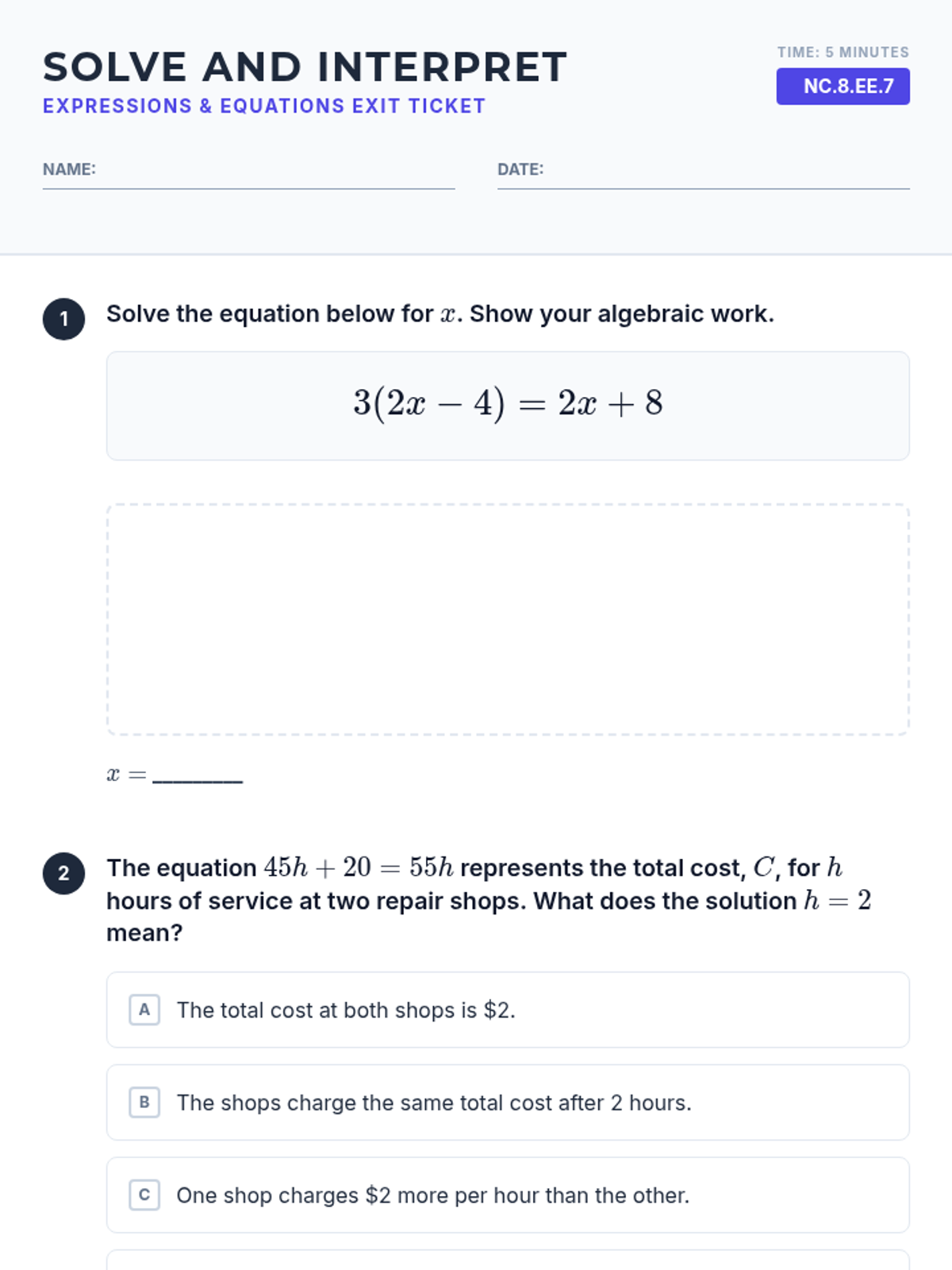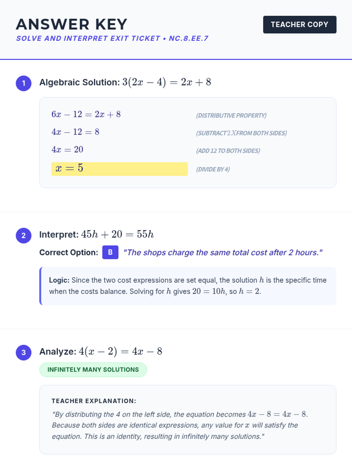 A Grade 8 math lesson focusing on mastery of multi-step equations and interpreting solutions in context, aligned with NC standard NC.8.EE.7.