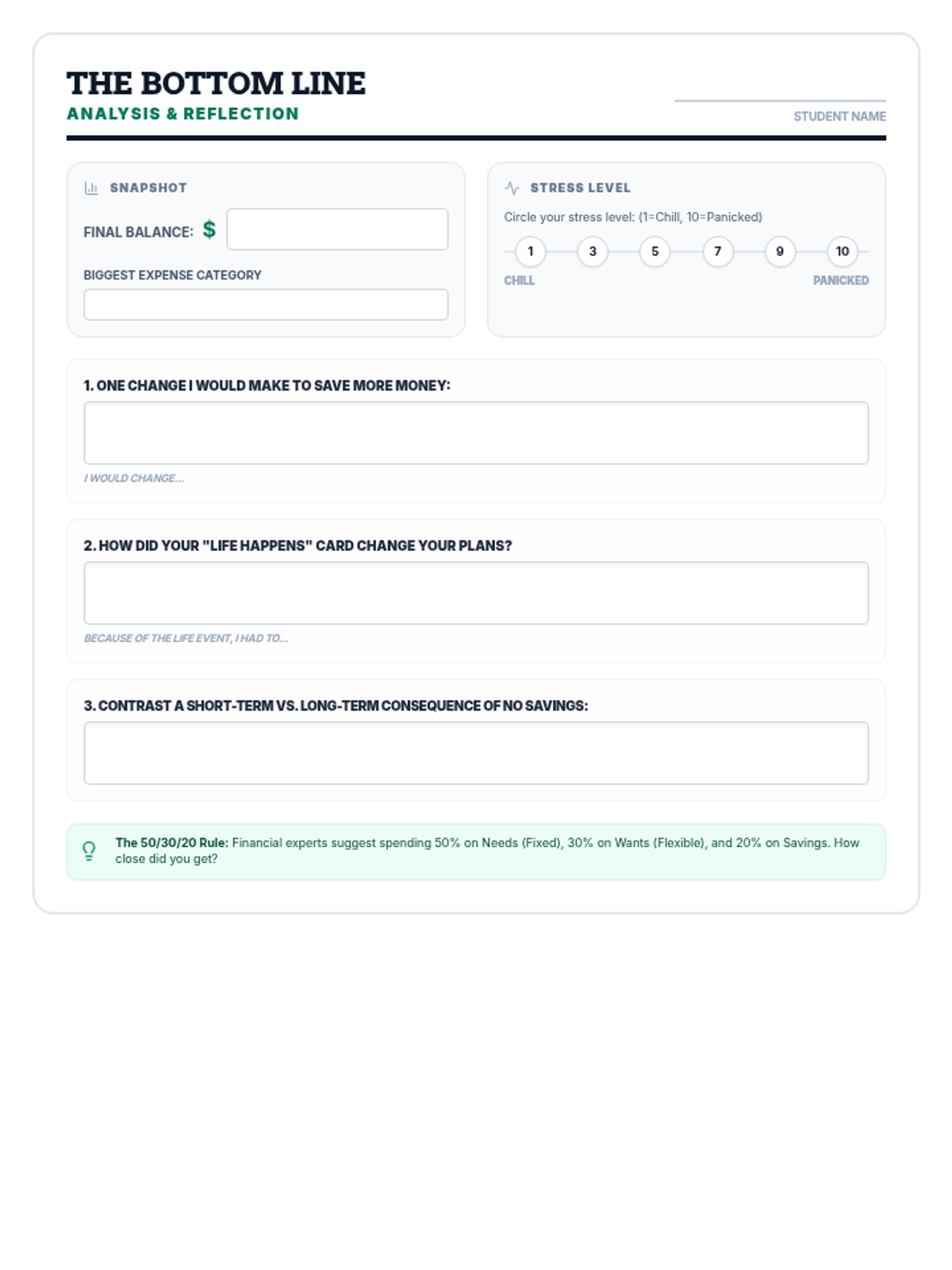 A high-energy, 30-minute simulation where students pick a career, calculate monthly take-home pay, and navigate adult expenses using a color-coded budget template designed for diverse learners.