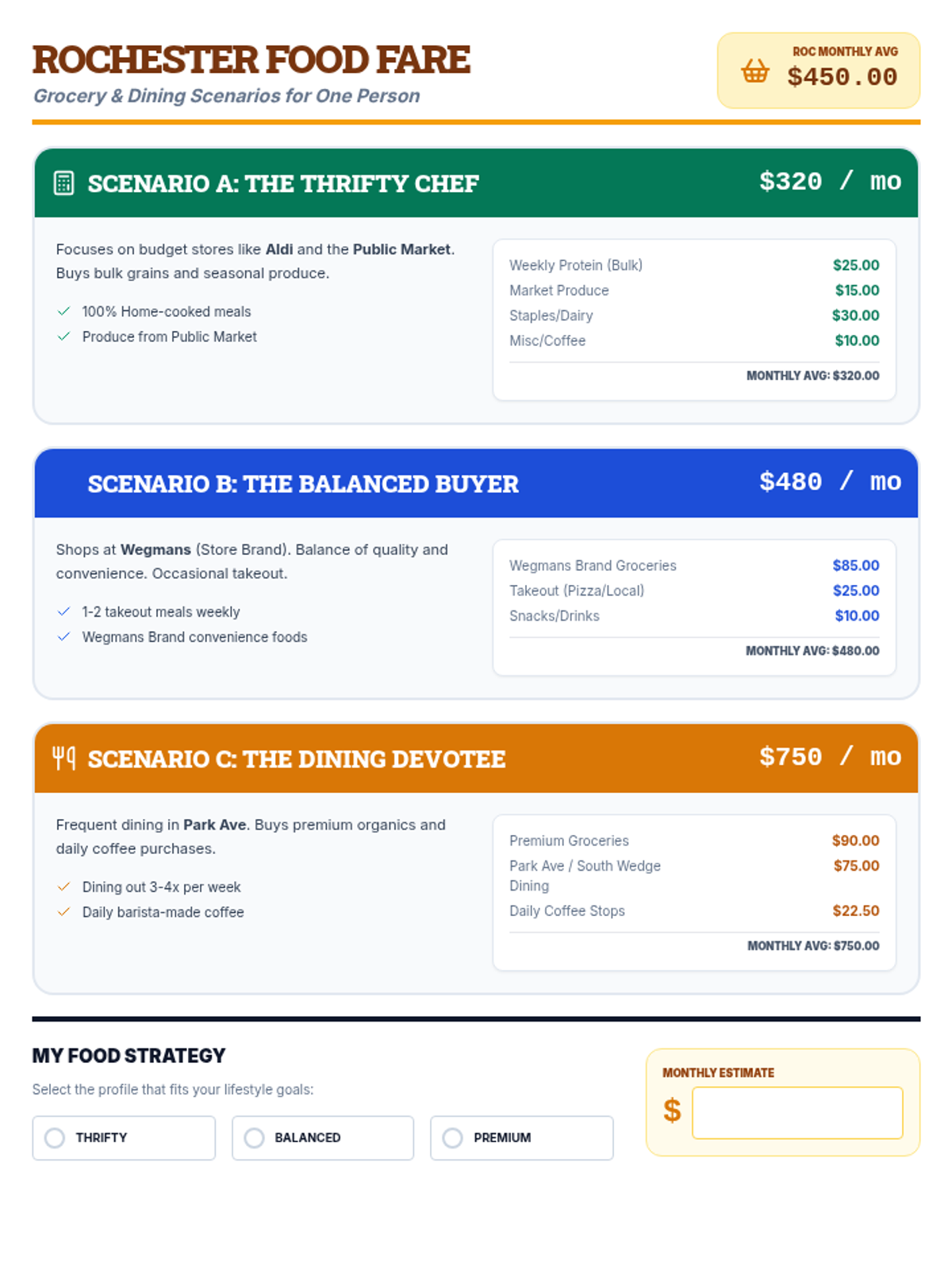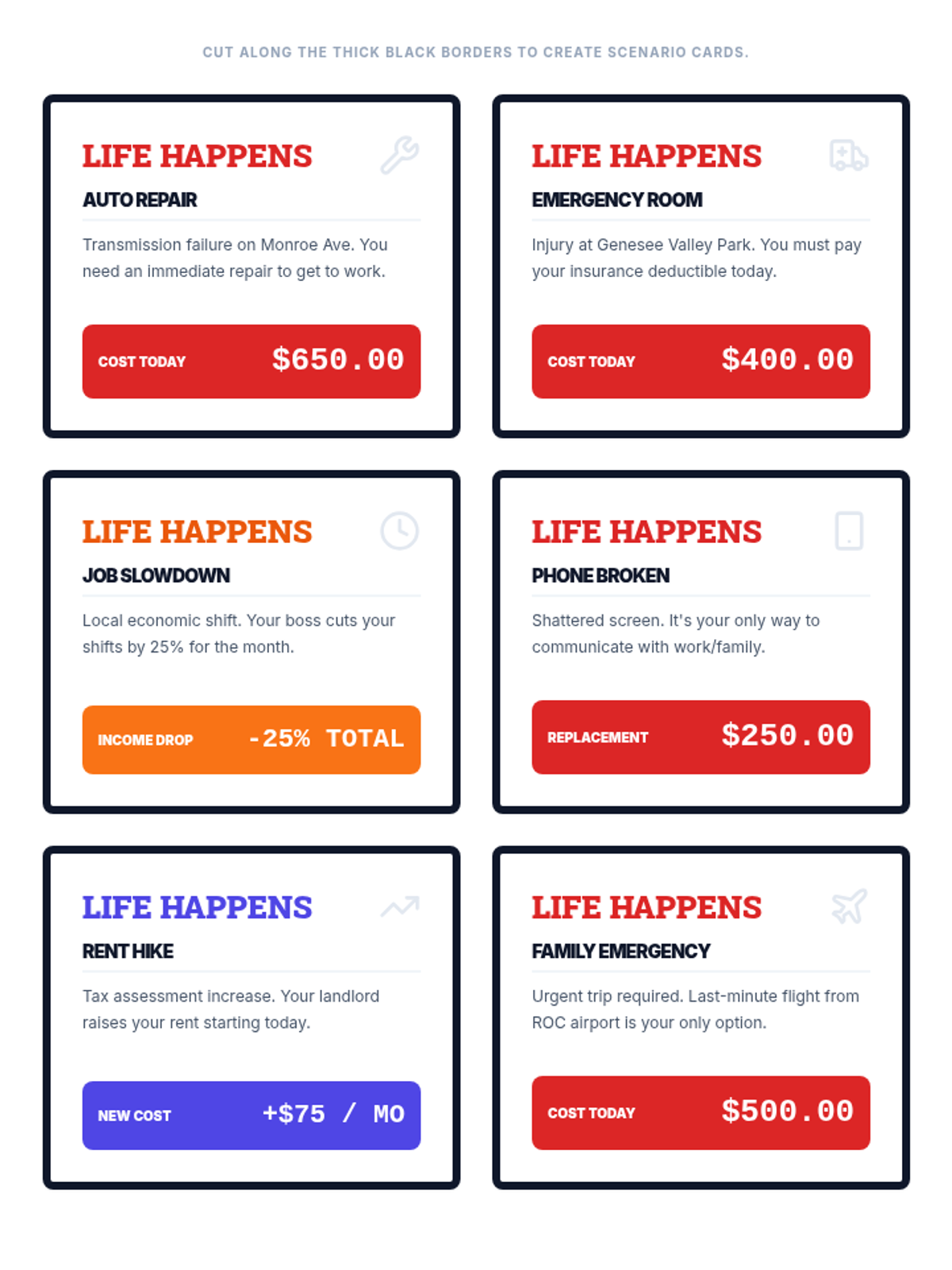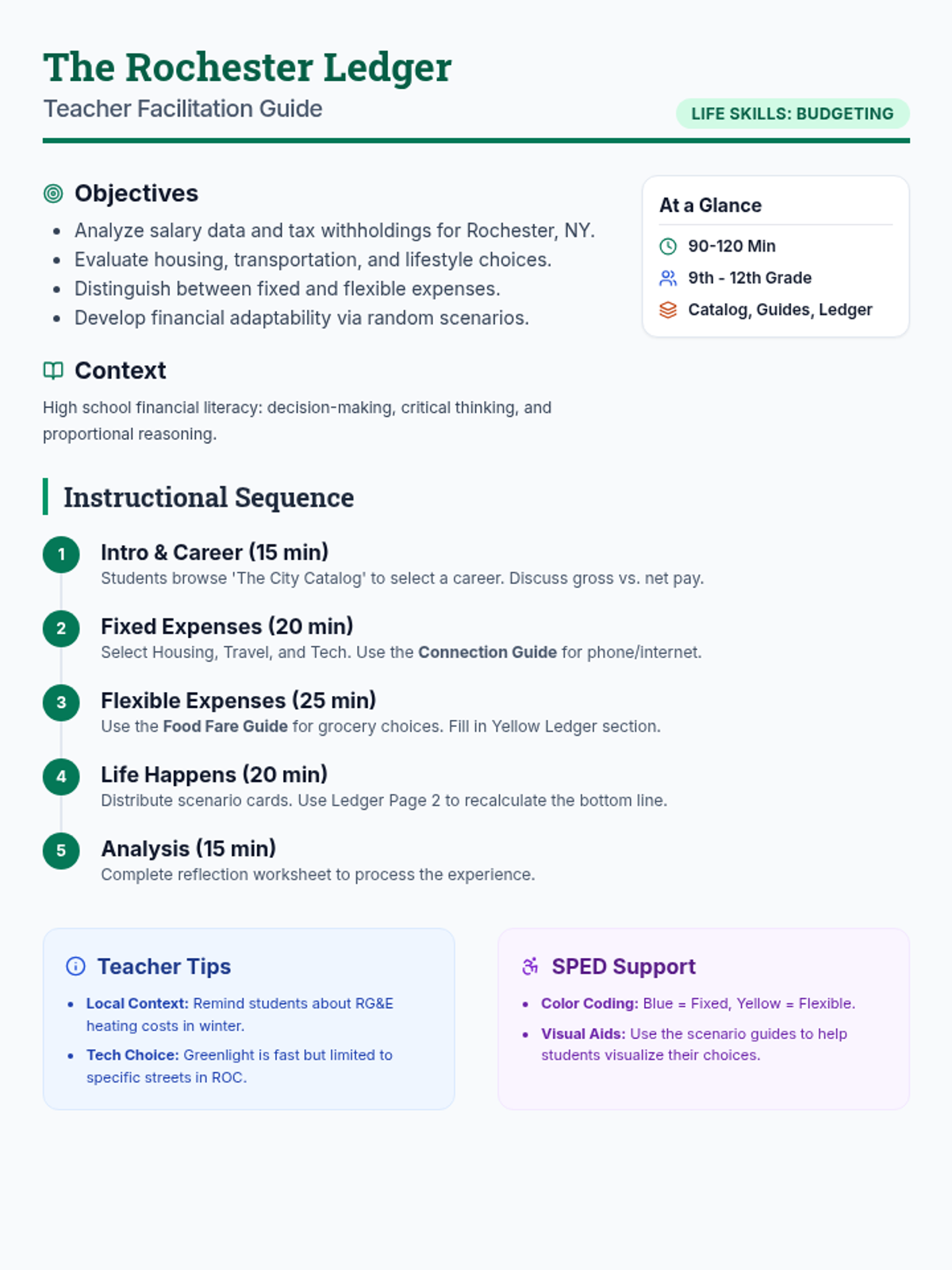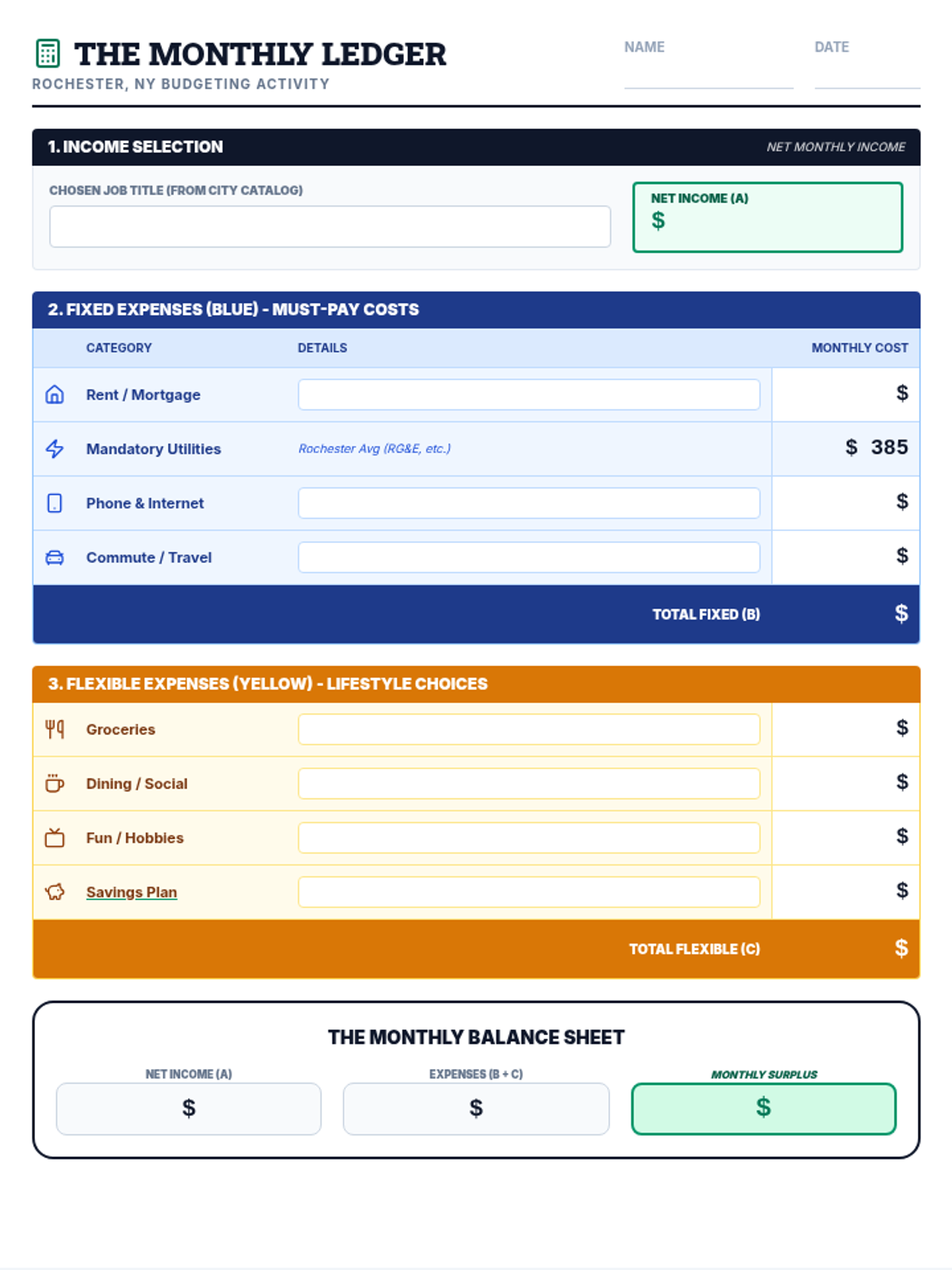 A comprehensive high school life skills lesson on budgeting within the Rochester, NY economy, featuring realistic job data, housing costs, and unexpected life scenarios.