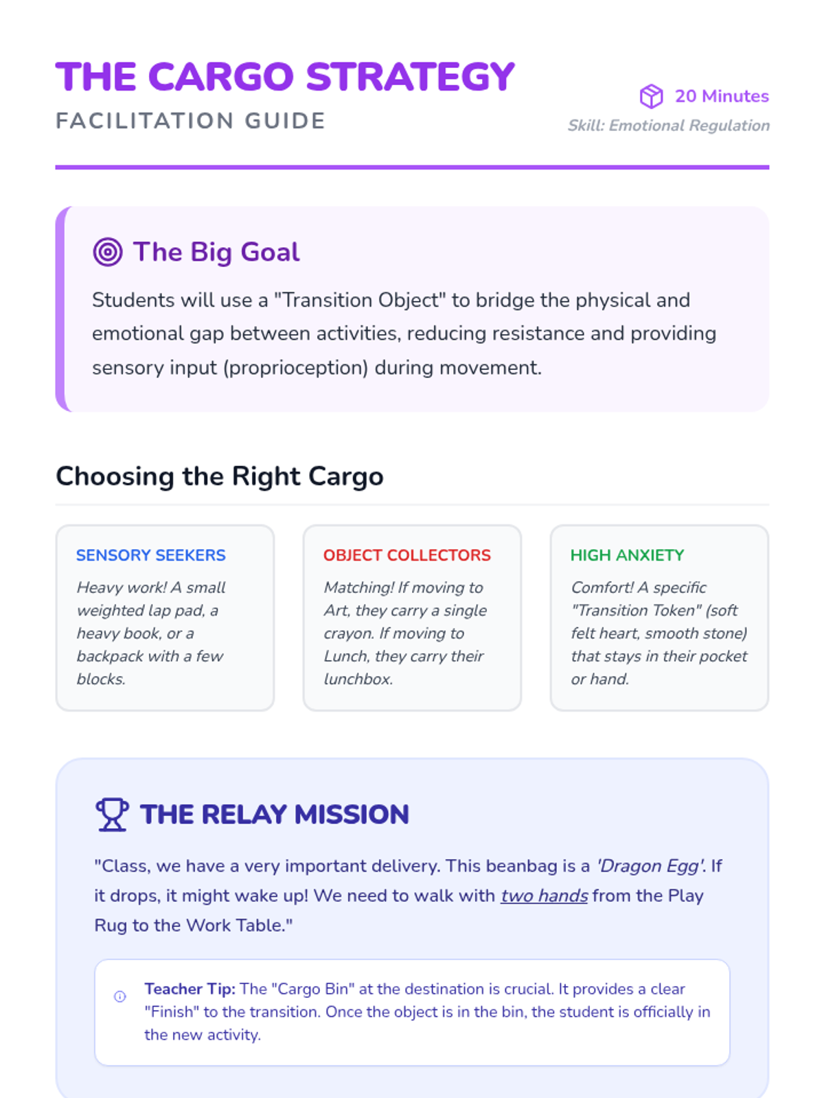 Introduces 'transition objects' to help students bridge the gap between activities, practicing carrying a specific item to the next station.