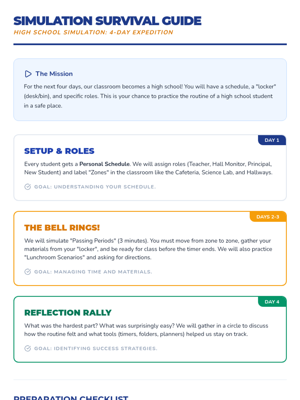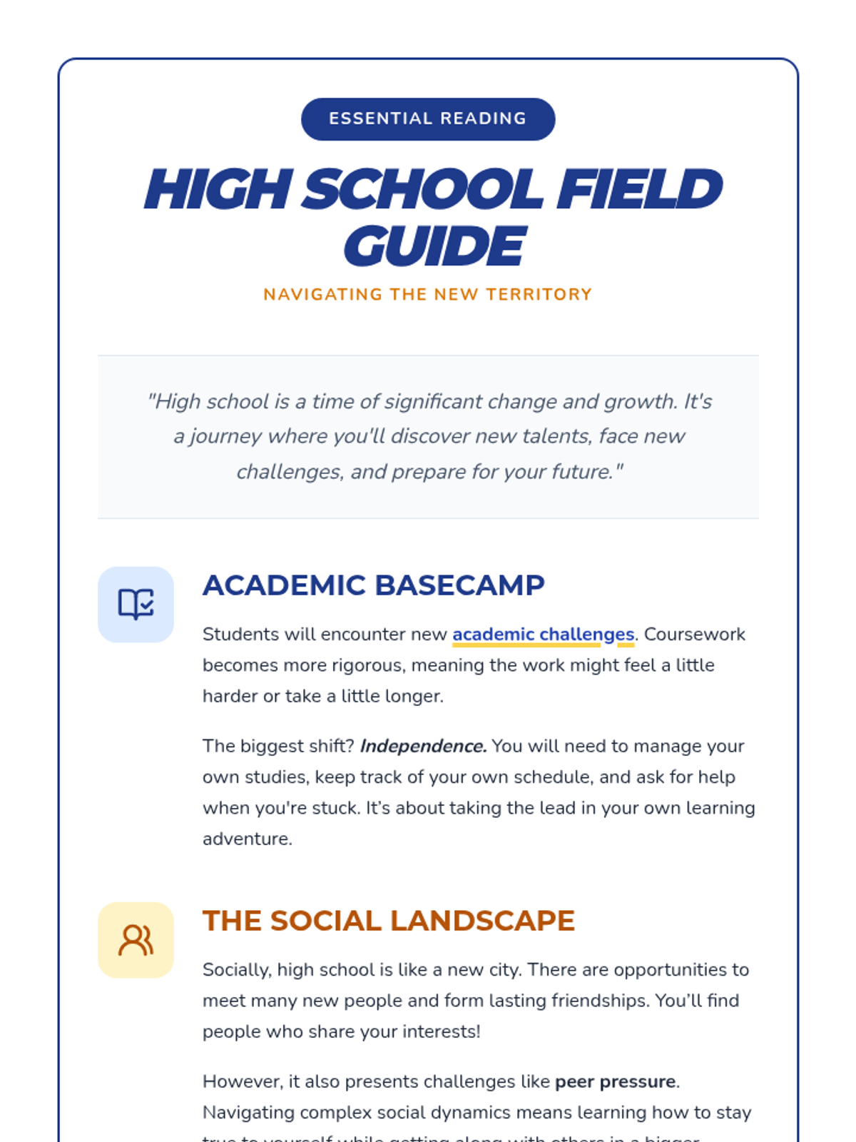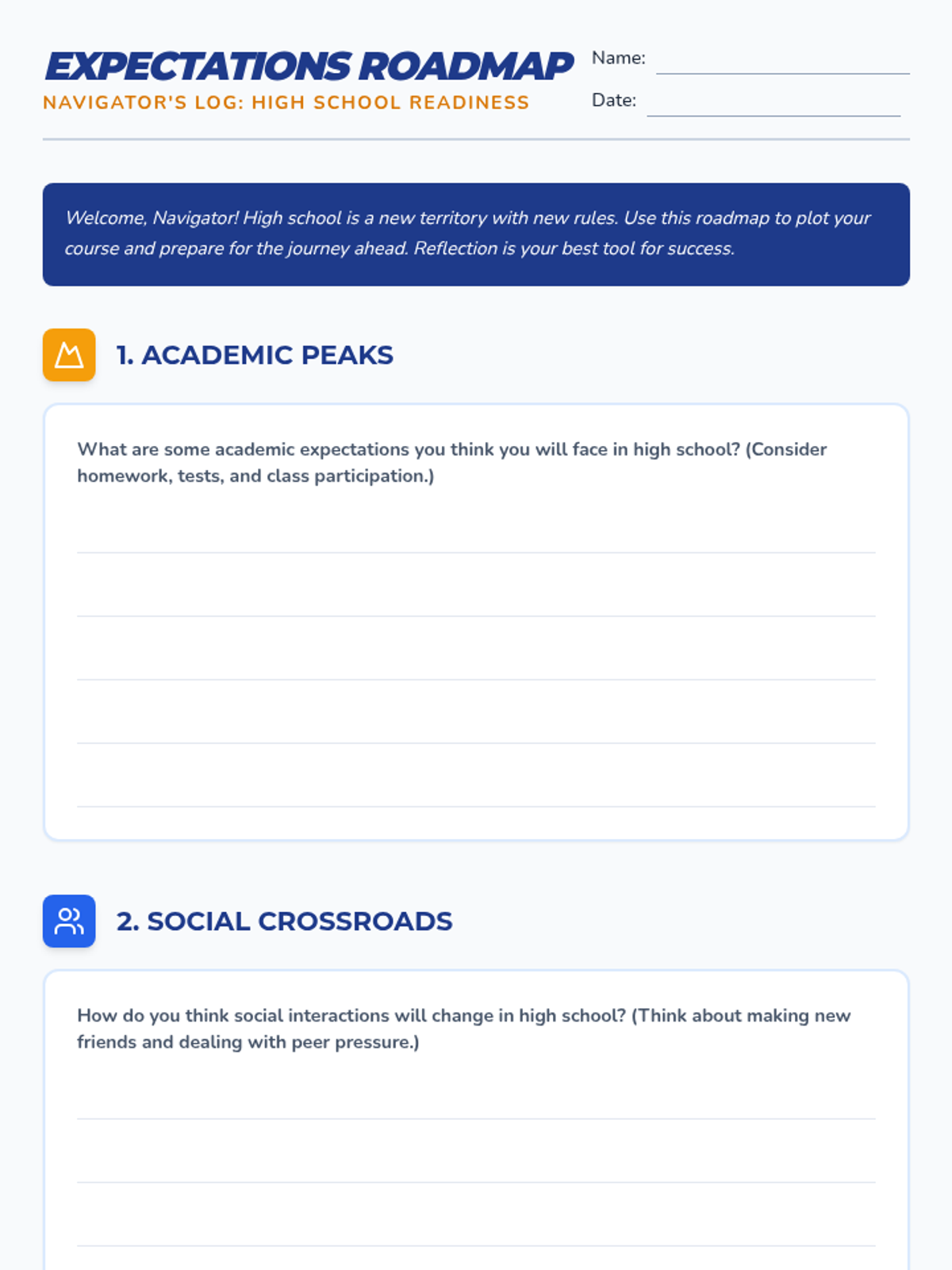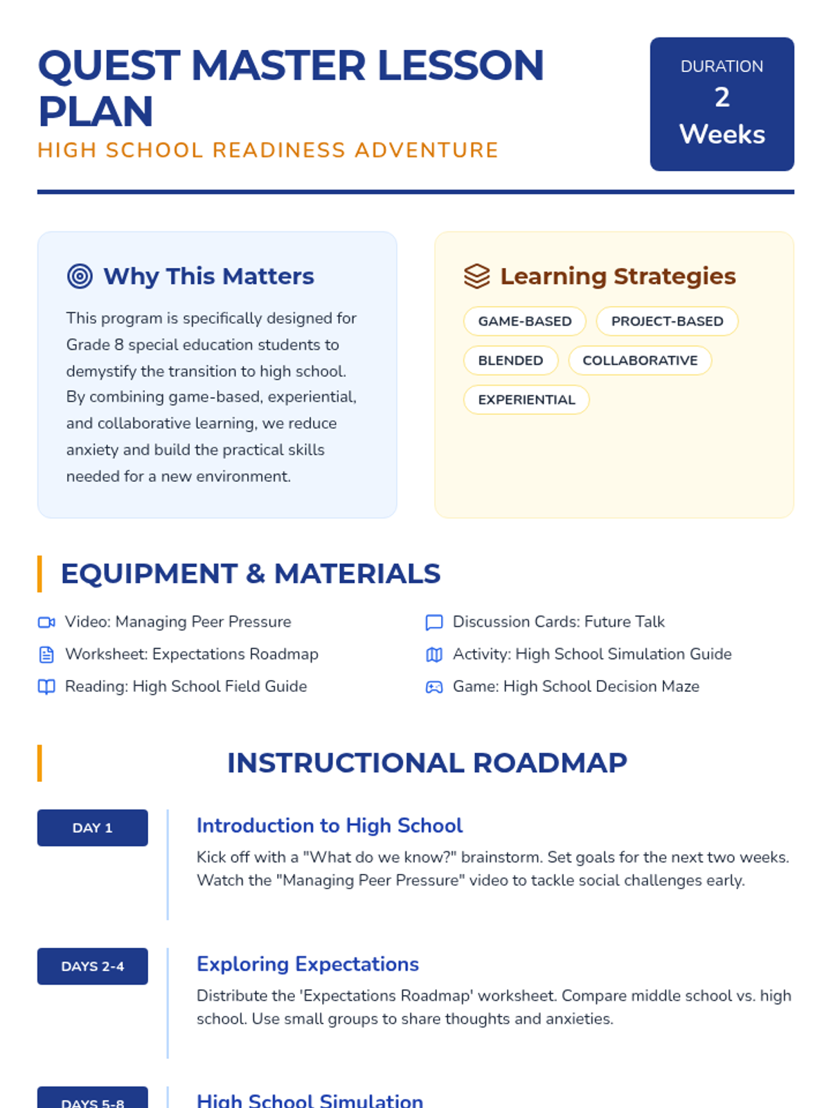 This lesson guides students through the transition from middle school to high school, covering academic expectations, social dynamics, and personal goal-setting over a two-week period.