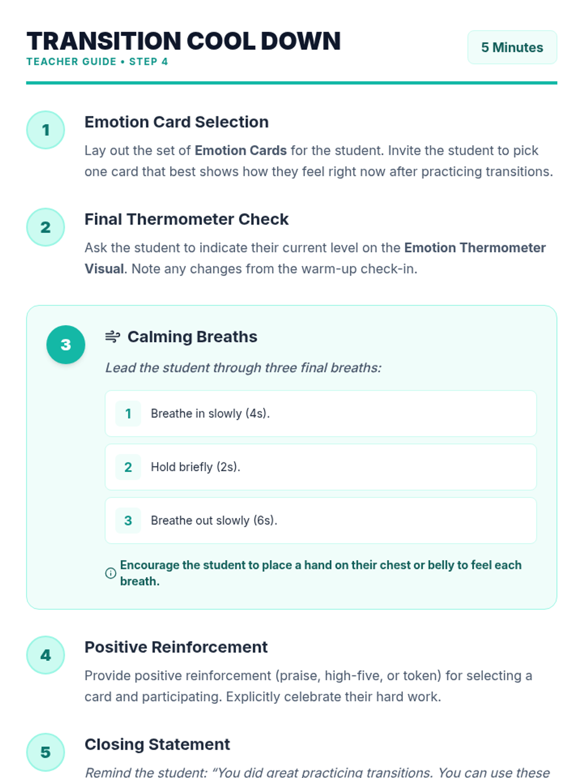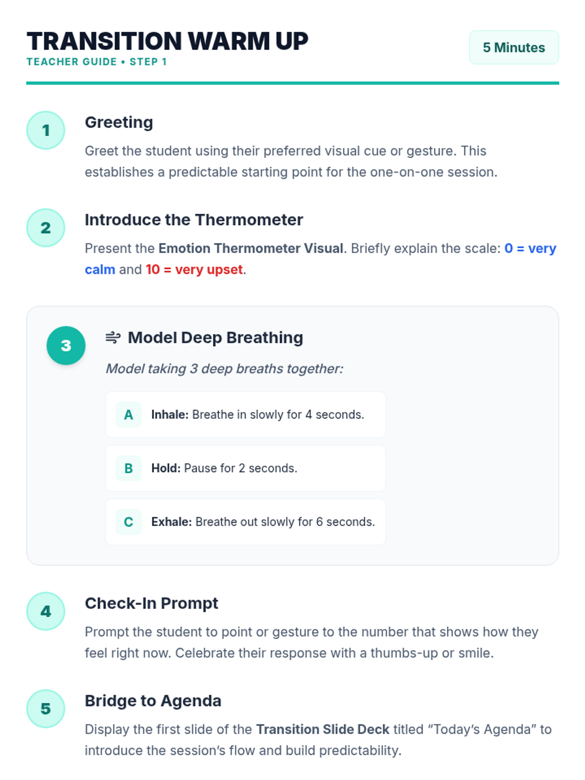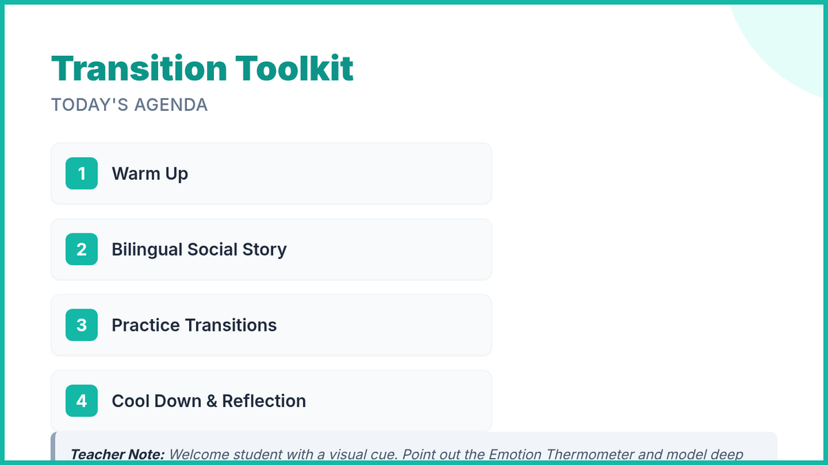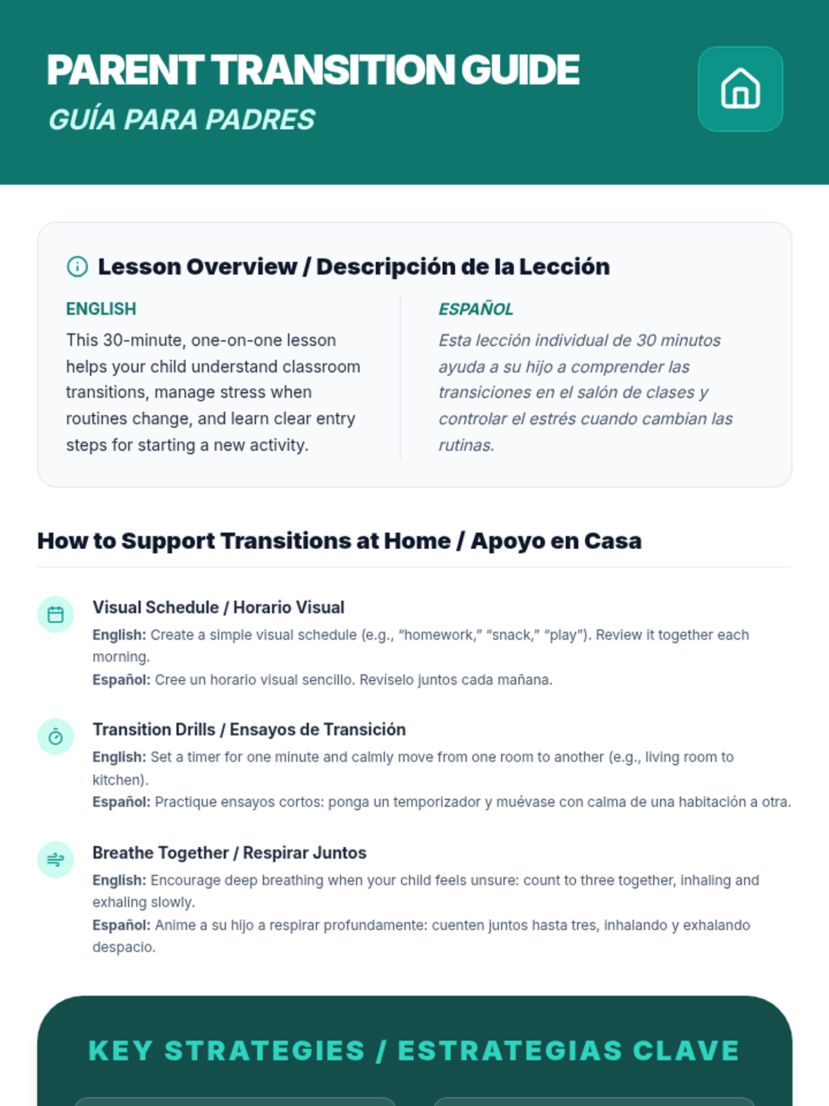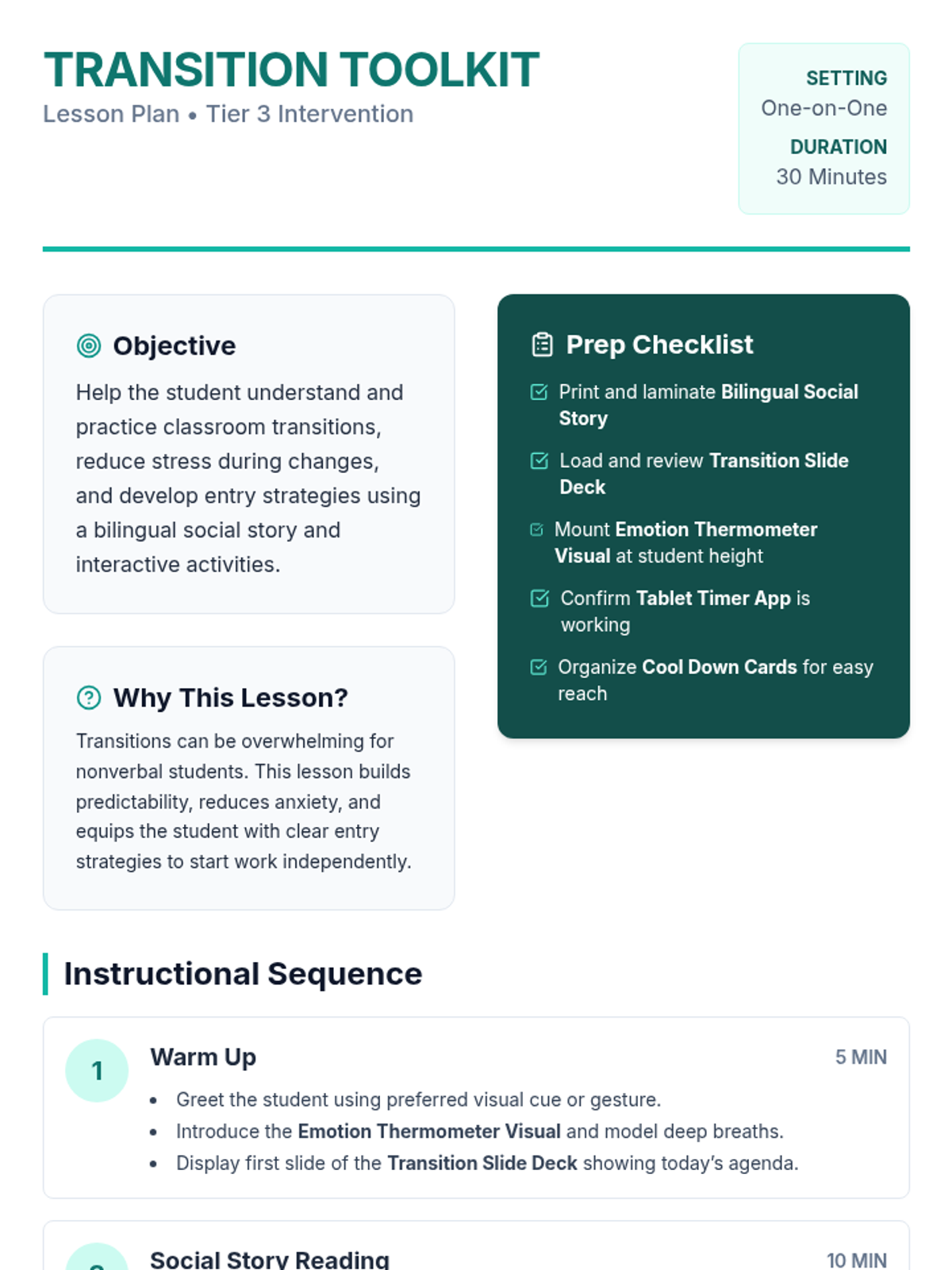 A 30-minute, one-on-one Tier 3 lesson designed for an 8th-grade nonverbal student to master classroom transitions using bilingual social stories and visual supports.