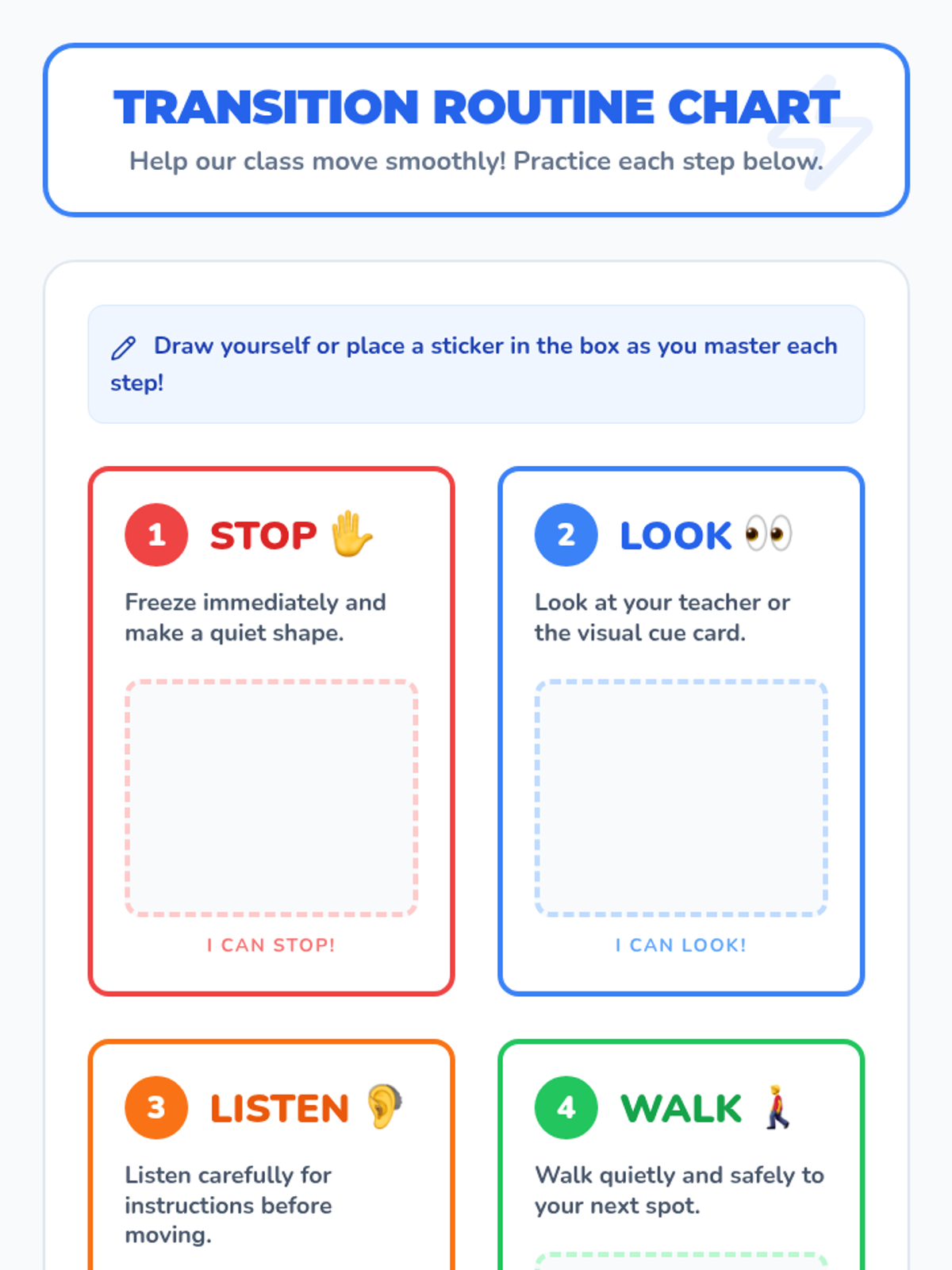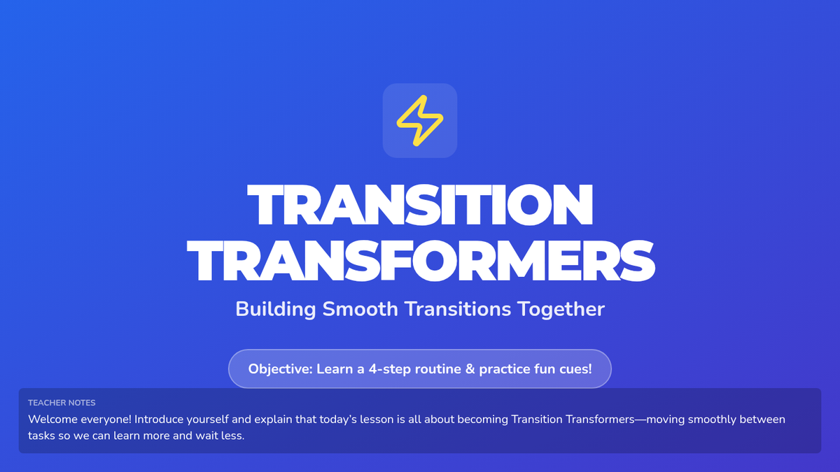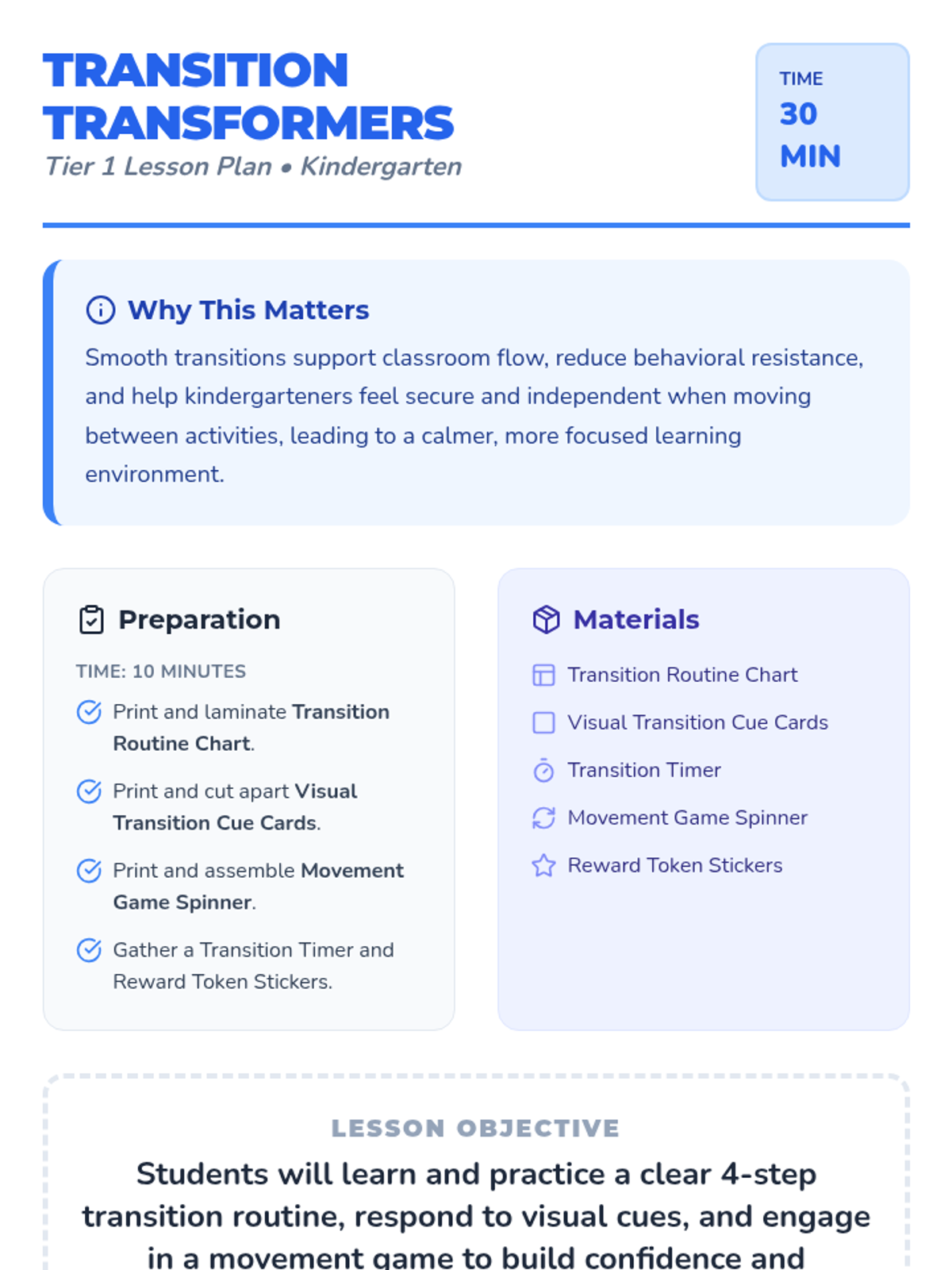 A 30-minute Tier 1 lesson for kindergarteners to master classroom transitions through routines, visual cues, and movement games, fostering independence and a calm classroom environment.