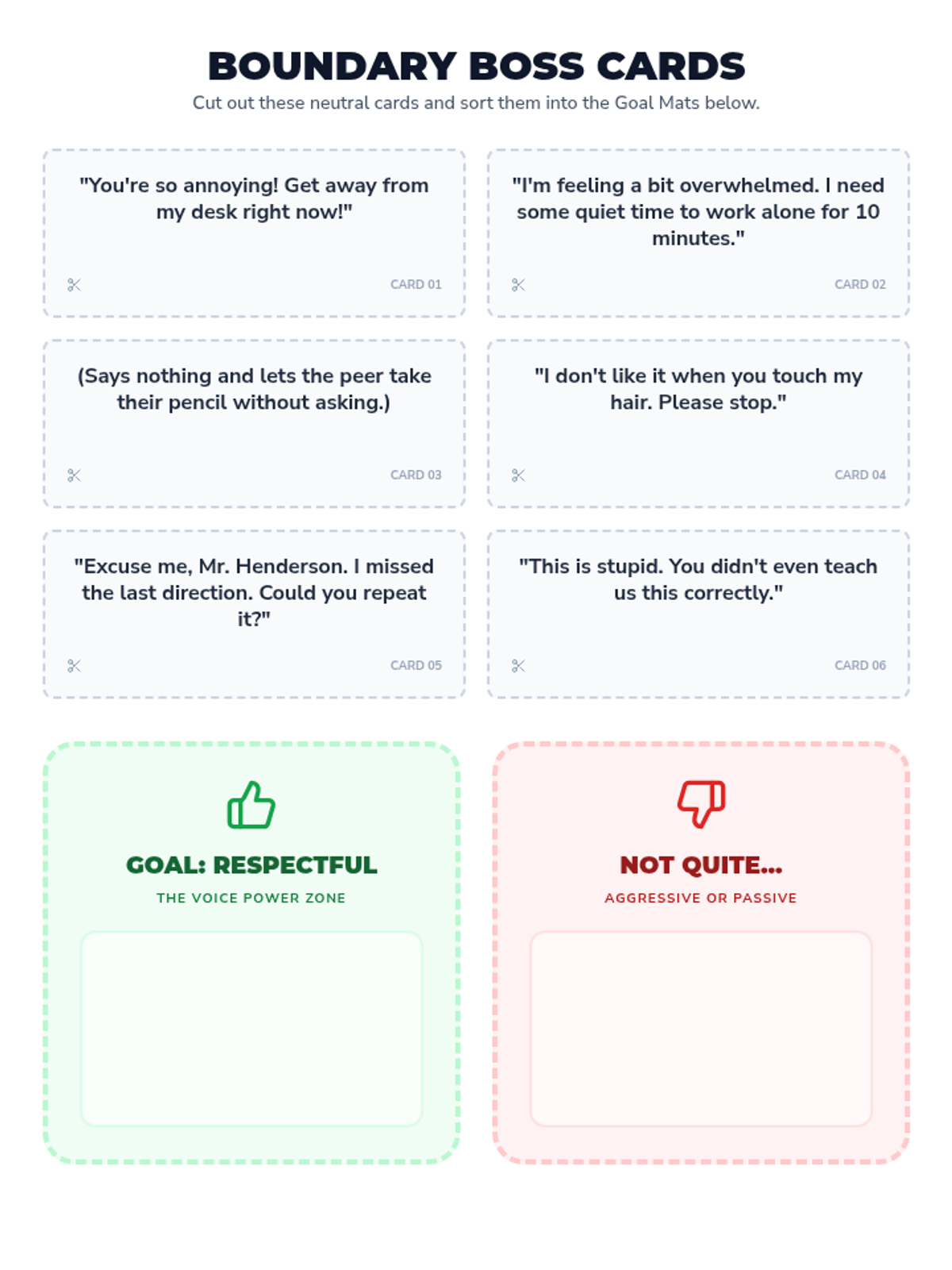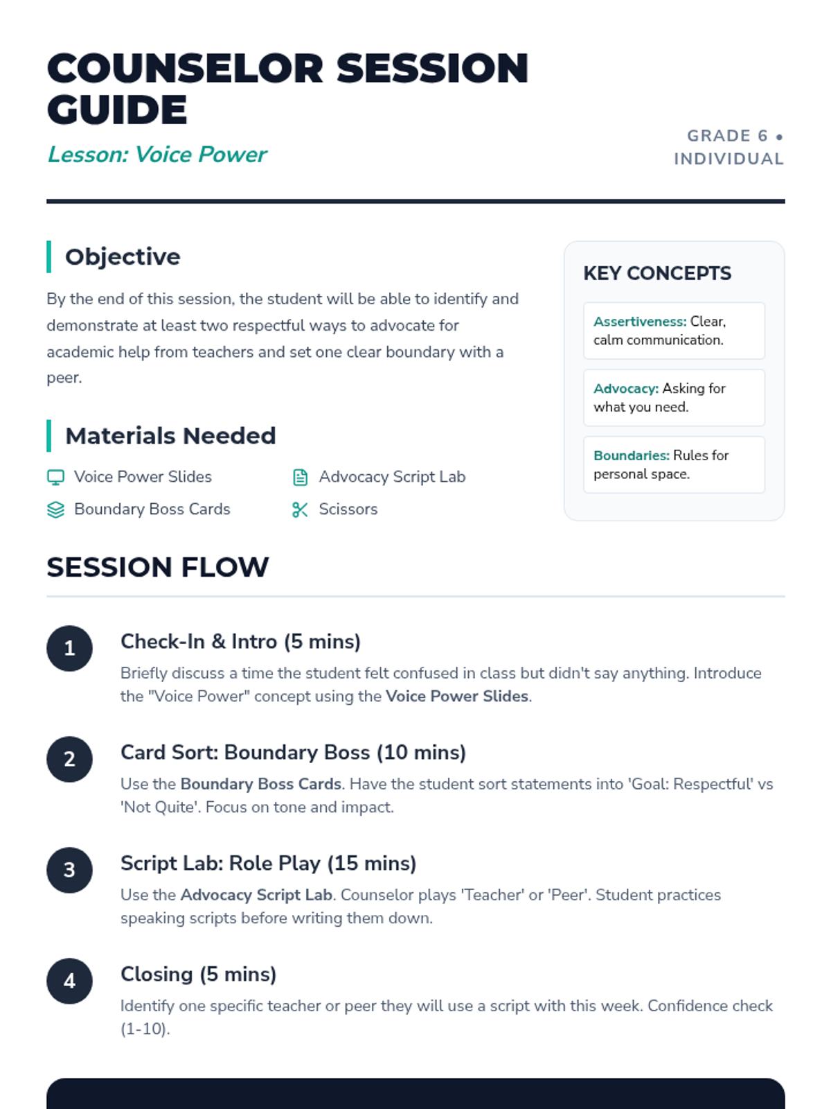 A grade 6 individual counseling lesson focused on teaching students how to respectfully advocate for their academic needs with teachers and set healthy boundaries with peers.
