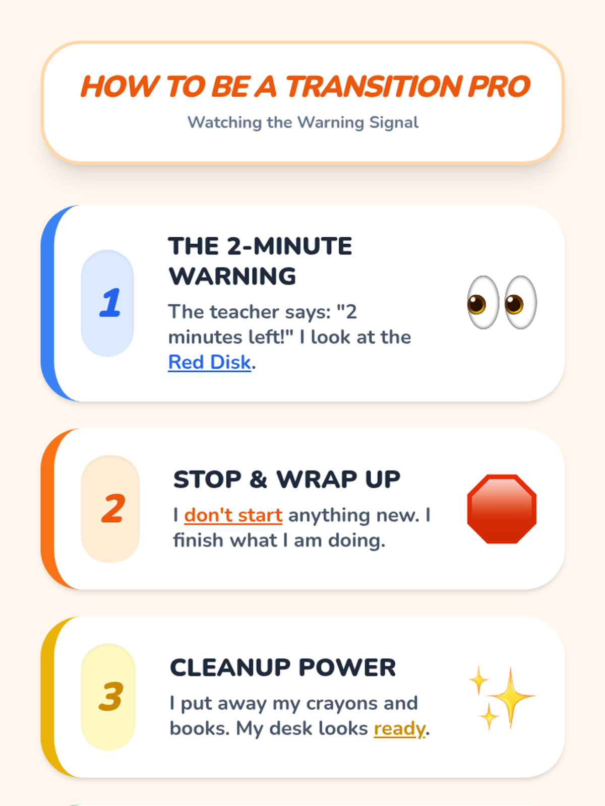 Students learn to use the timer as a warning signal for cleanup, practicing how to wrap up activities effectively before a transition.