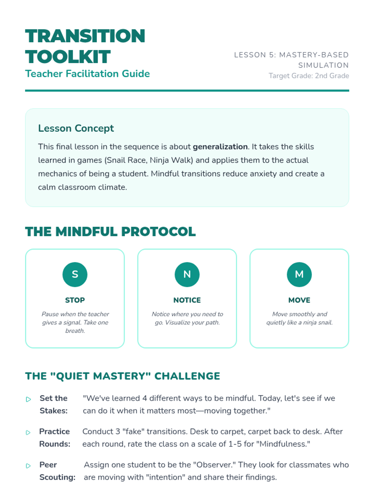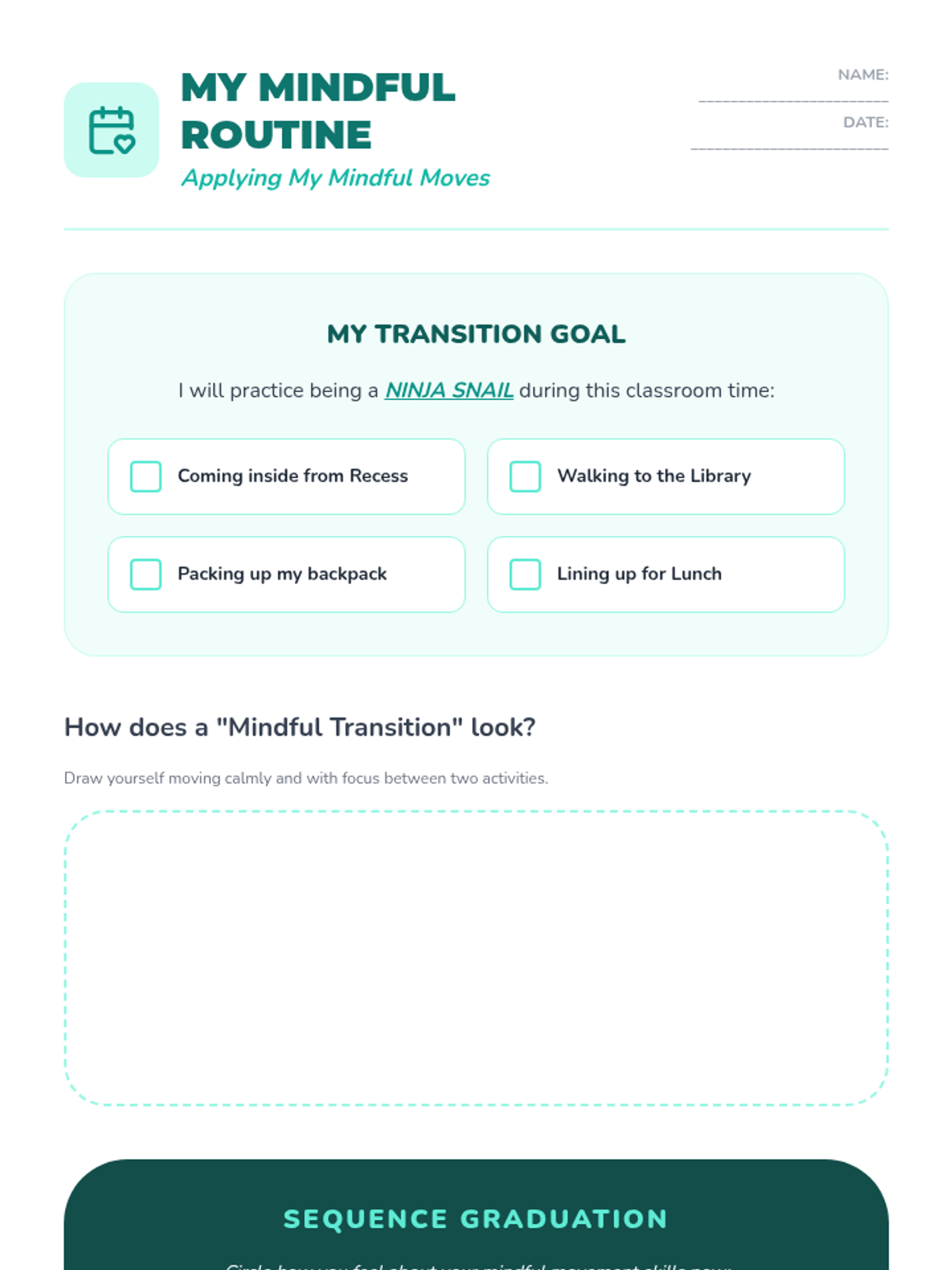 Students apply mindful movement techniques to everyday classroom transitions, moving with intention from desks to carpet.