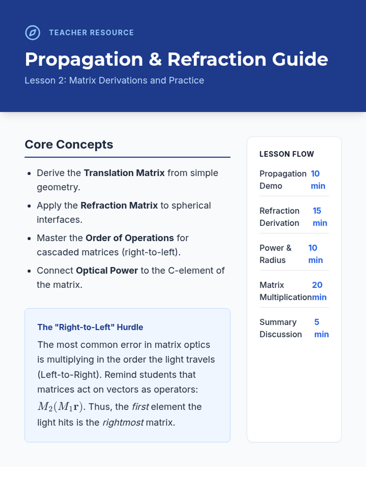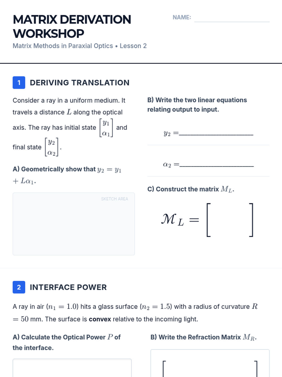 Derivation and application of the translation matrix for free space and the refraction matrix for spherical interfaces.