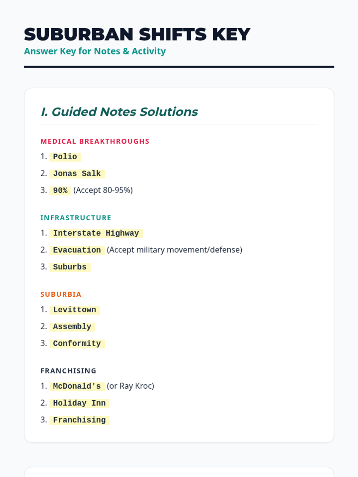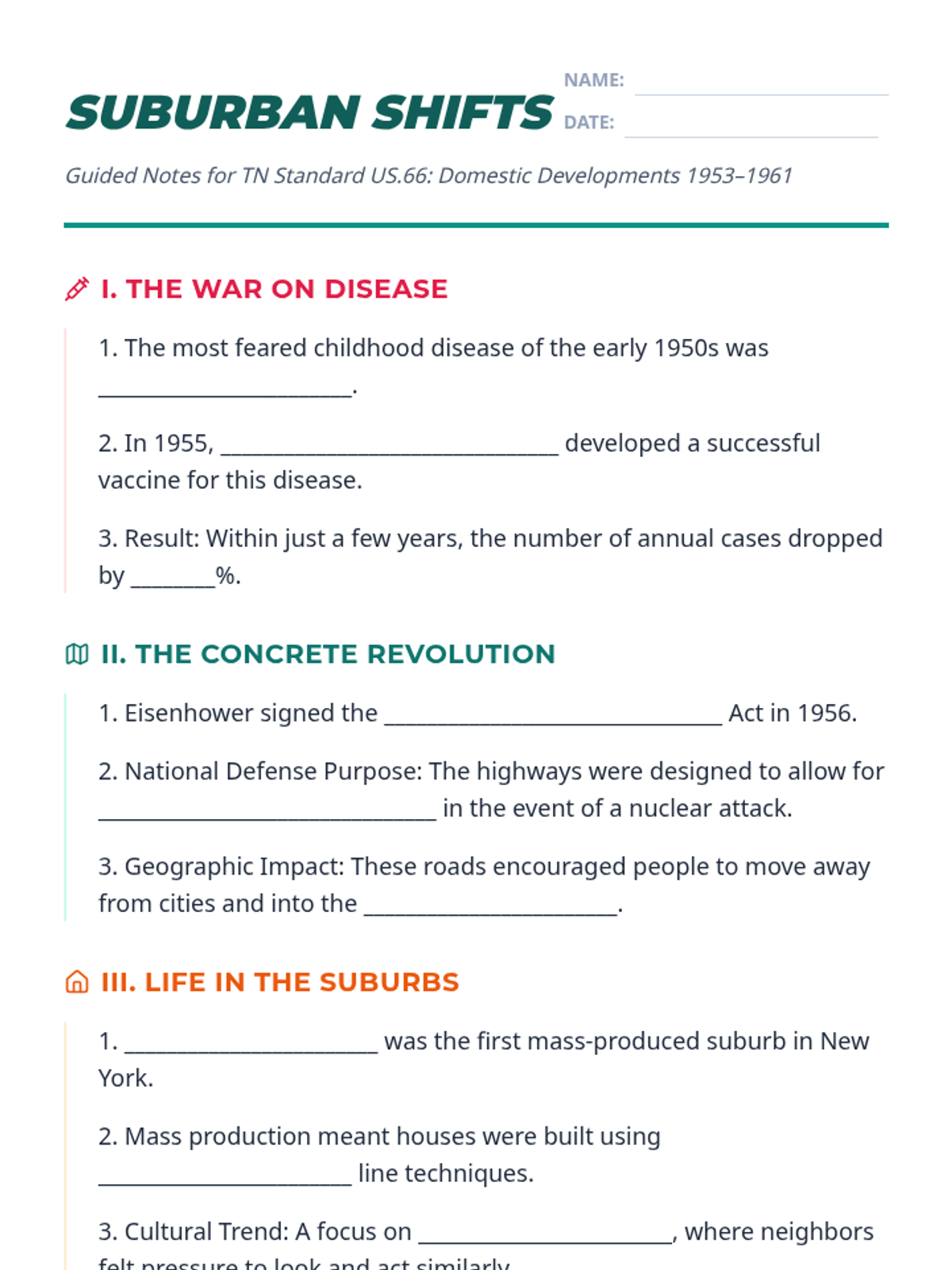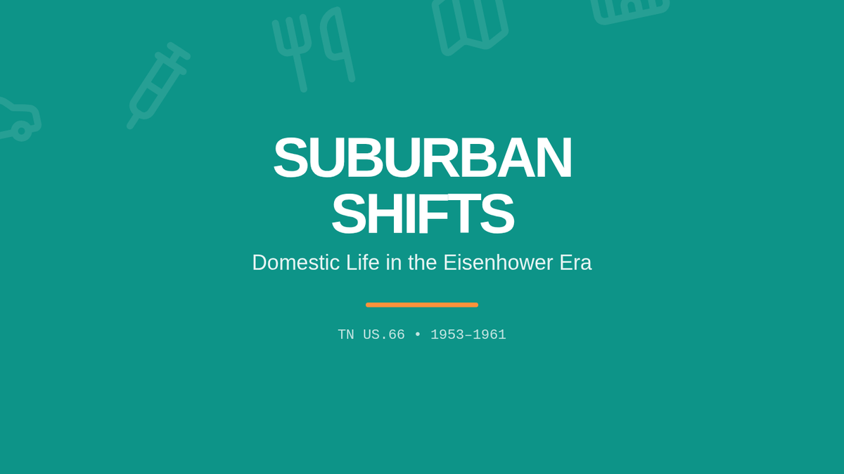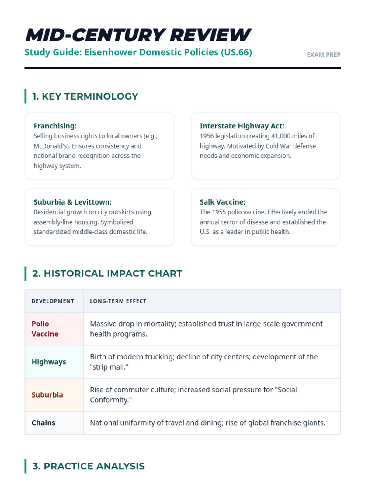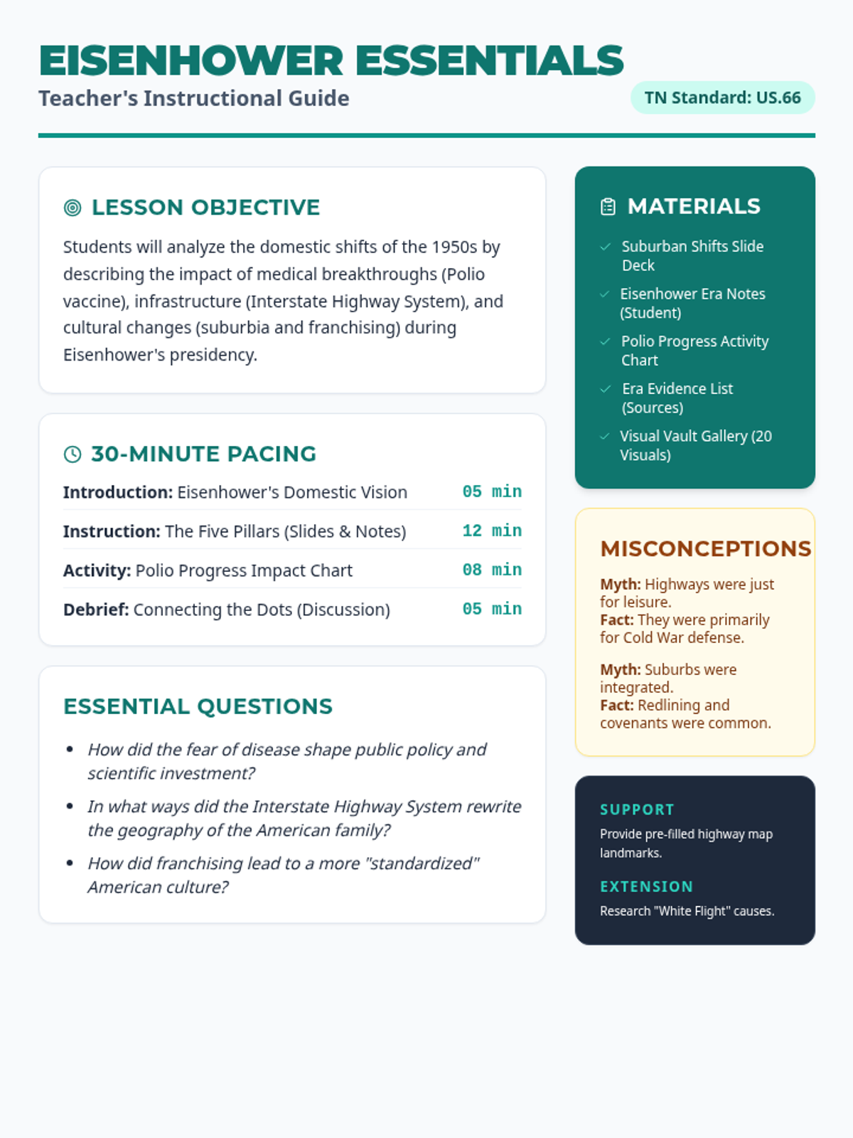 A comprehensive 30-minute lesson on domestic developments during the Eisenhower administration, covering the polio vaccine, interstate highways, suburbia, and the rise of franchising.