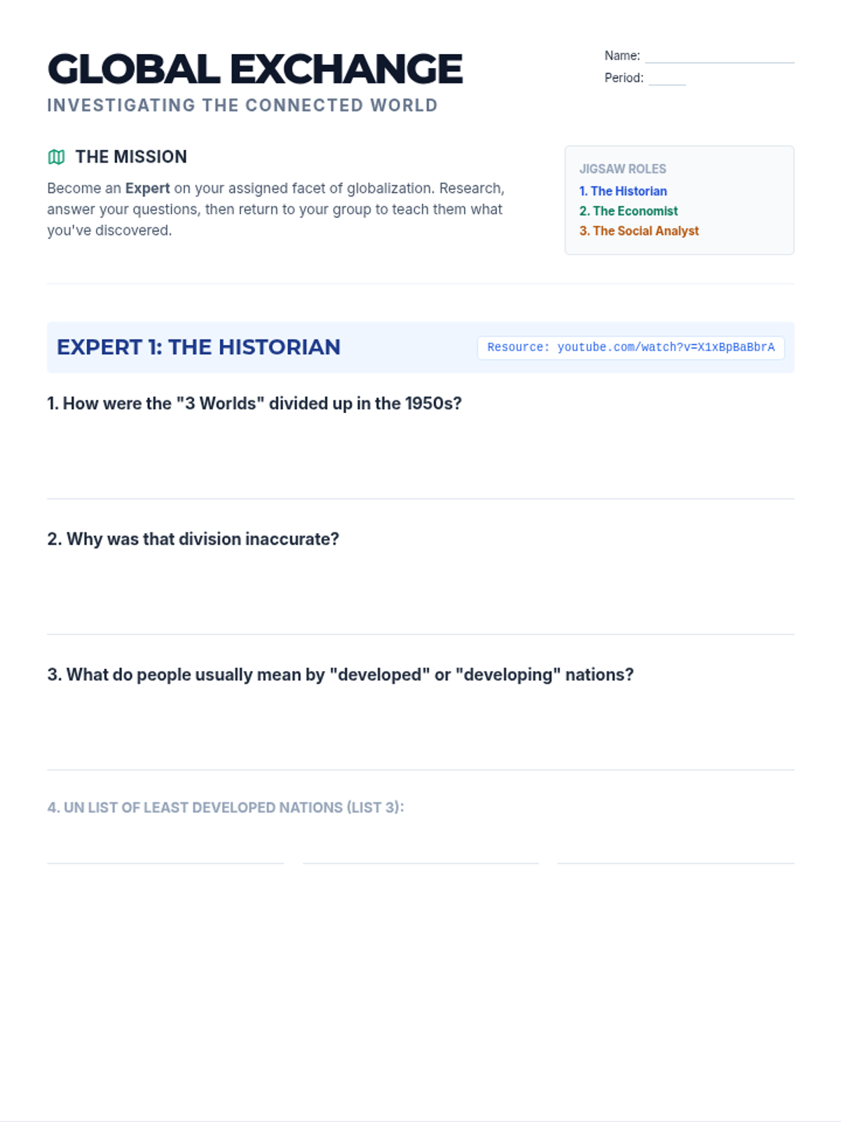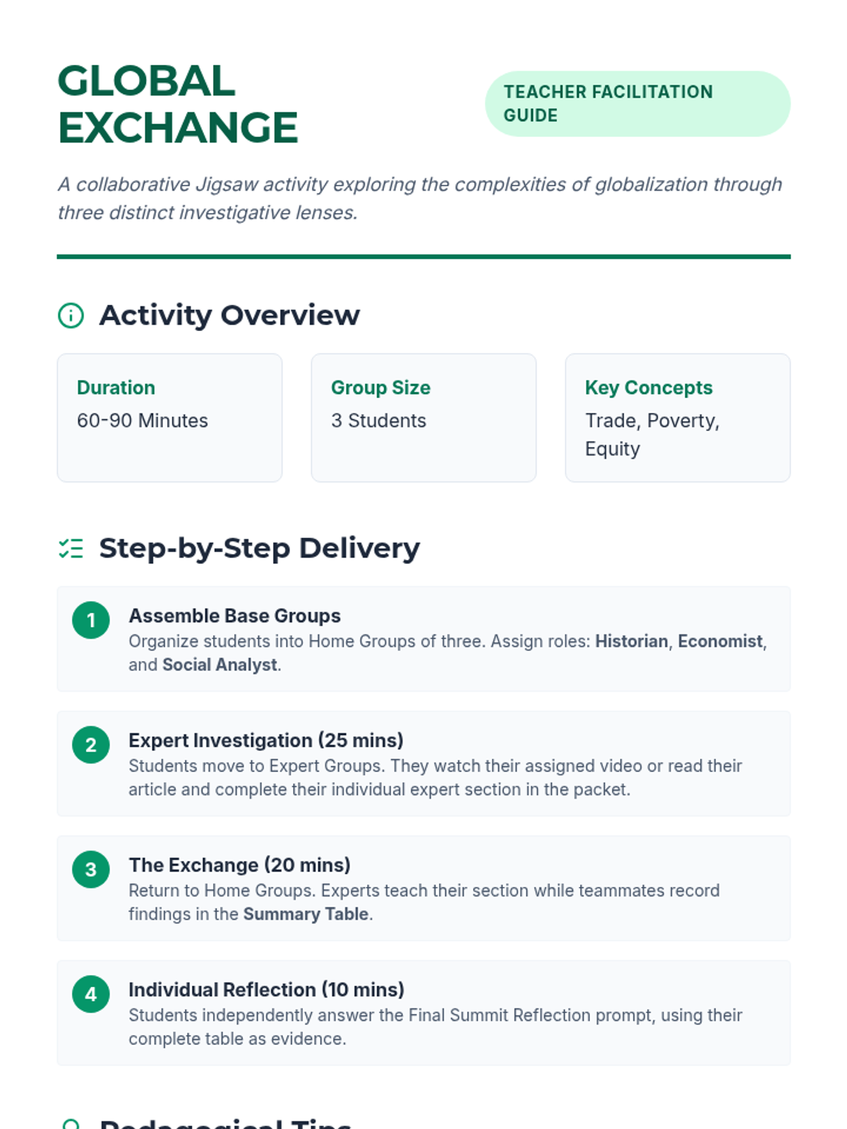 A jigsaw activity where students become experts on specific facets of globalization—definitions, drivers/impacts, and economic consequences—before sharing their findings with peers to form a complete understanding of the topic.