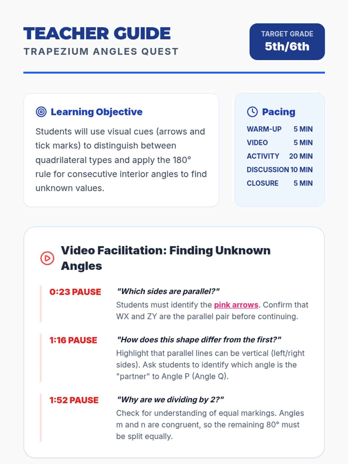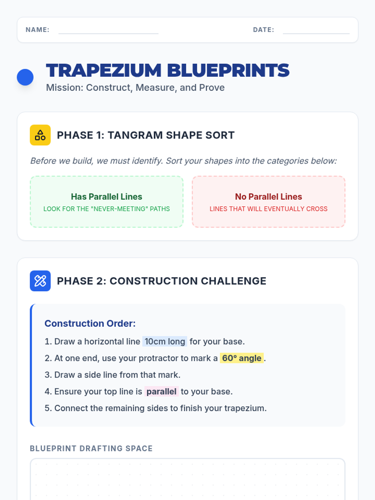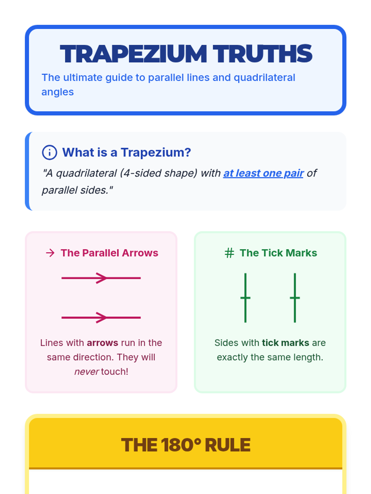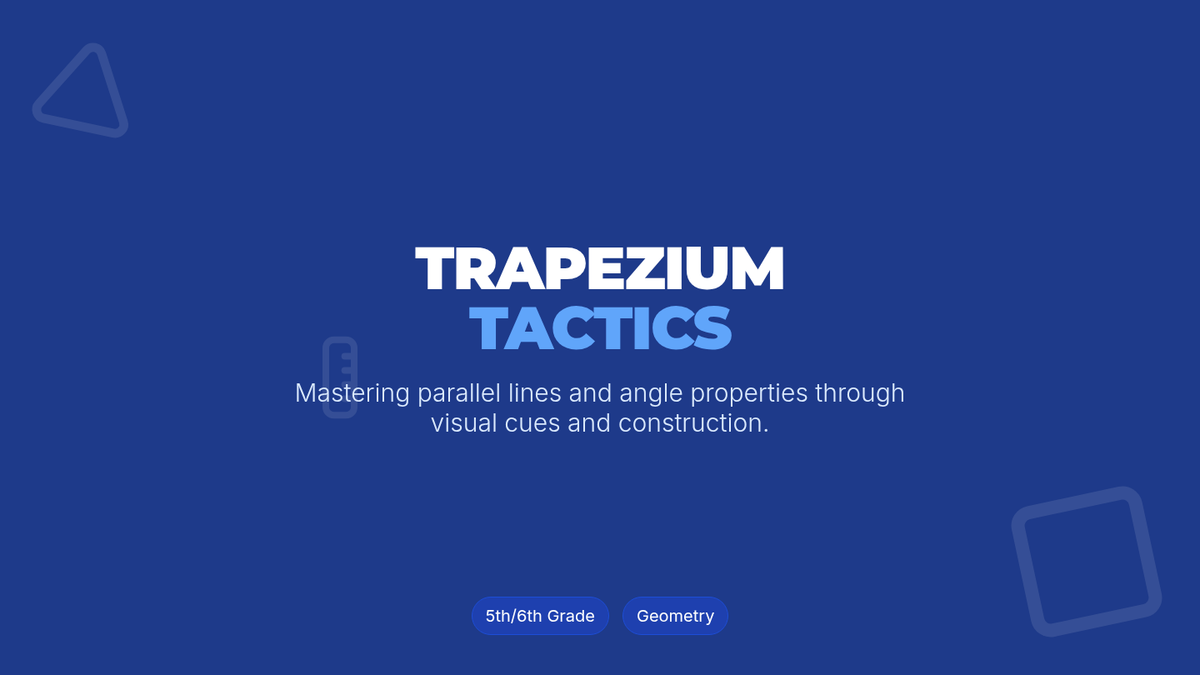 A geometry lesson for 5th and 6th graders to identify trapezium properties and calculate missing angles between parallel lines using visual cues and hands-on construction.