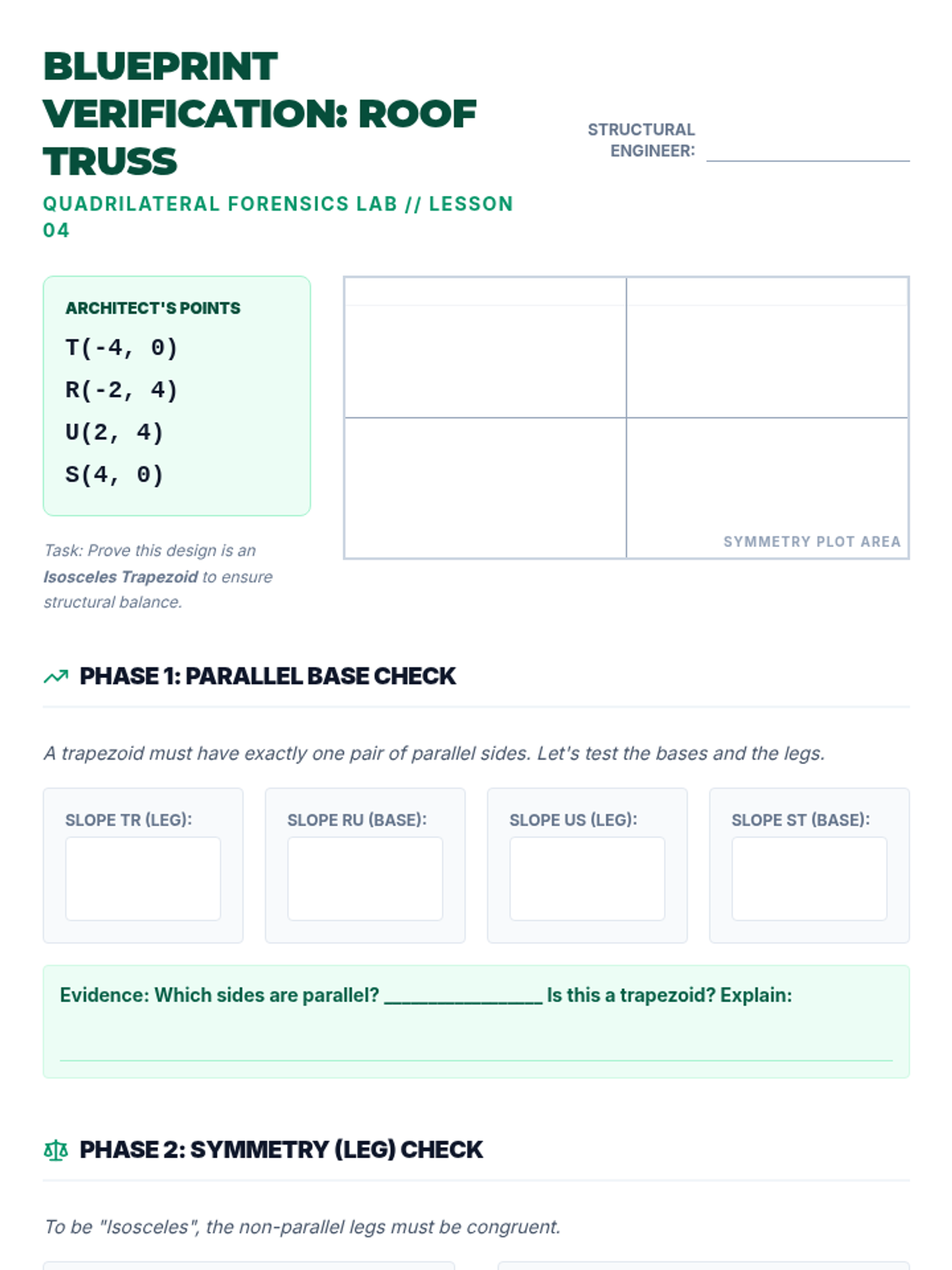 Students distinguish trapezoids from other quadrilaterals by identifying exactly one pair of parallel sides and verifying isosceles properties.