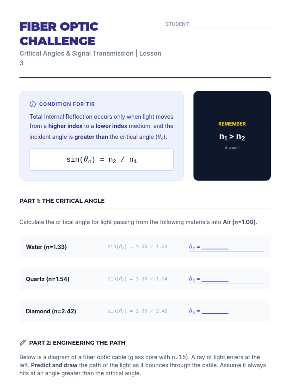 Students study Total Internal Reflection (TIR) and the critical angle. They explore how this phenomenon is used in modern technology like fiber optics and medical endoscopes.