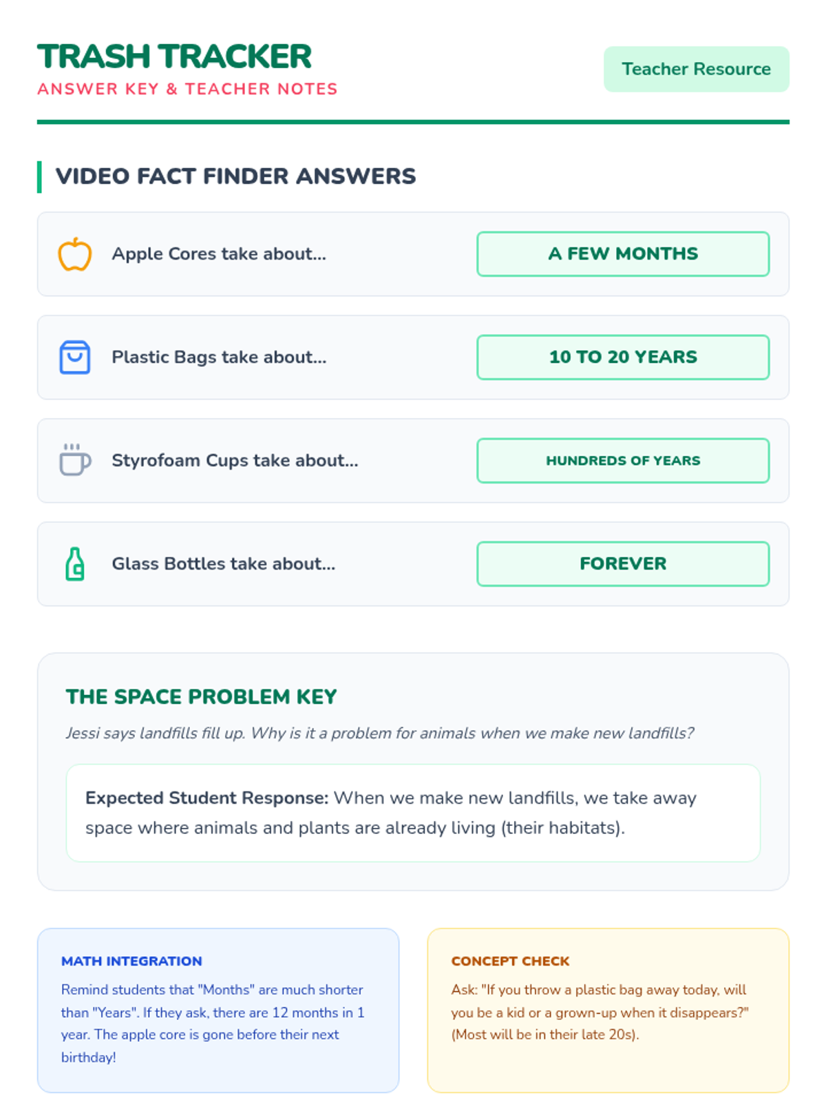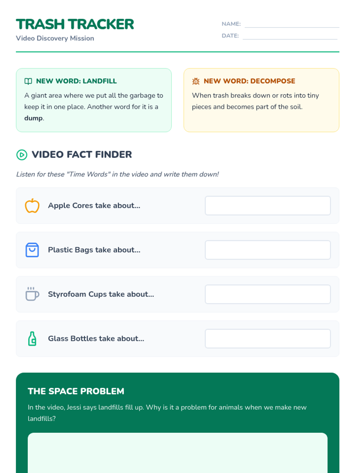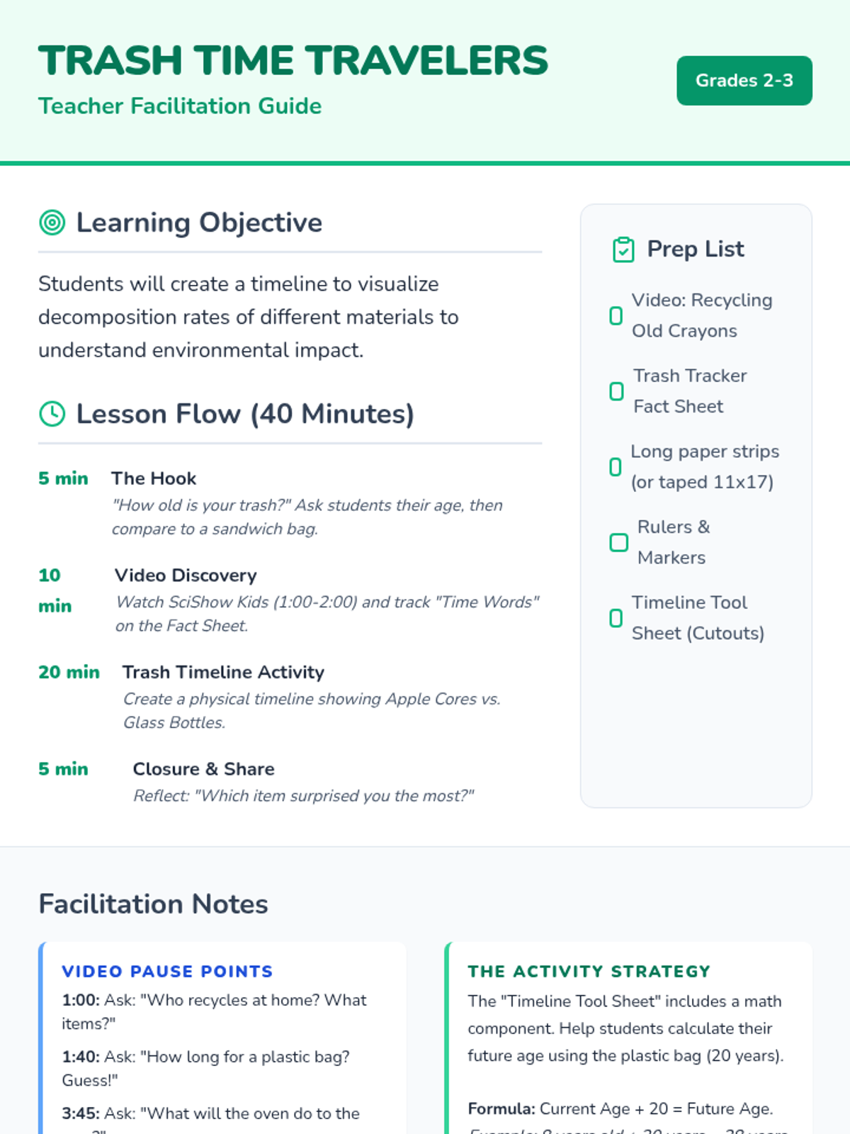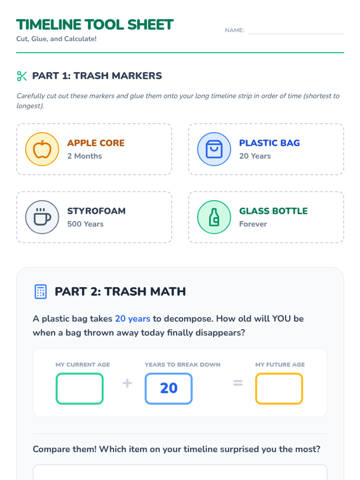 Students will investigate decomposition rates by watching a SciShow Kids video and creating a scale timeline of common trash items, calculating their own age when certain materials finally disappear.