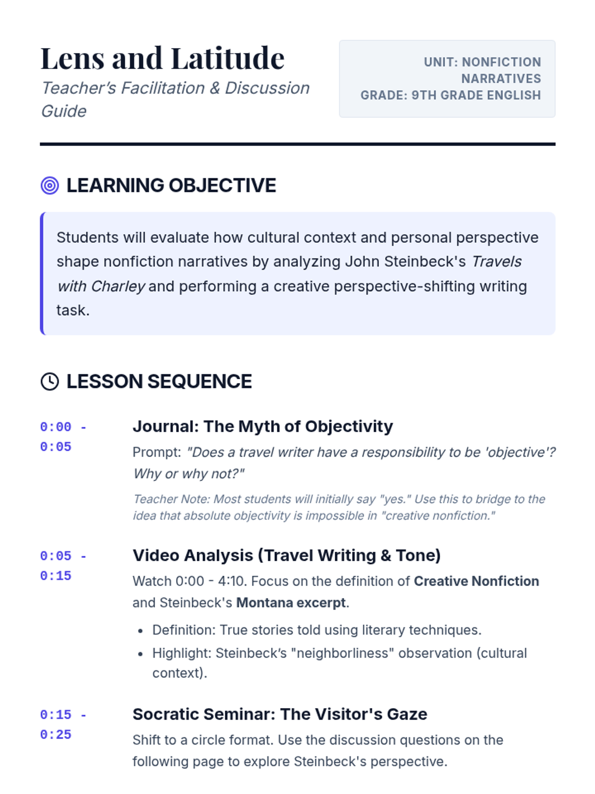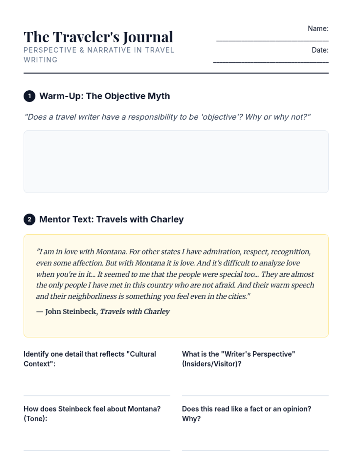 Students evaluate how cultural context and personal perspective shape travel writing through an analysis of John Steinbeck's Montana excerpt and a creative persona-shifting activity.