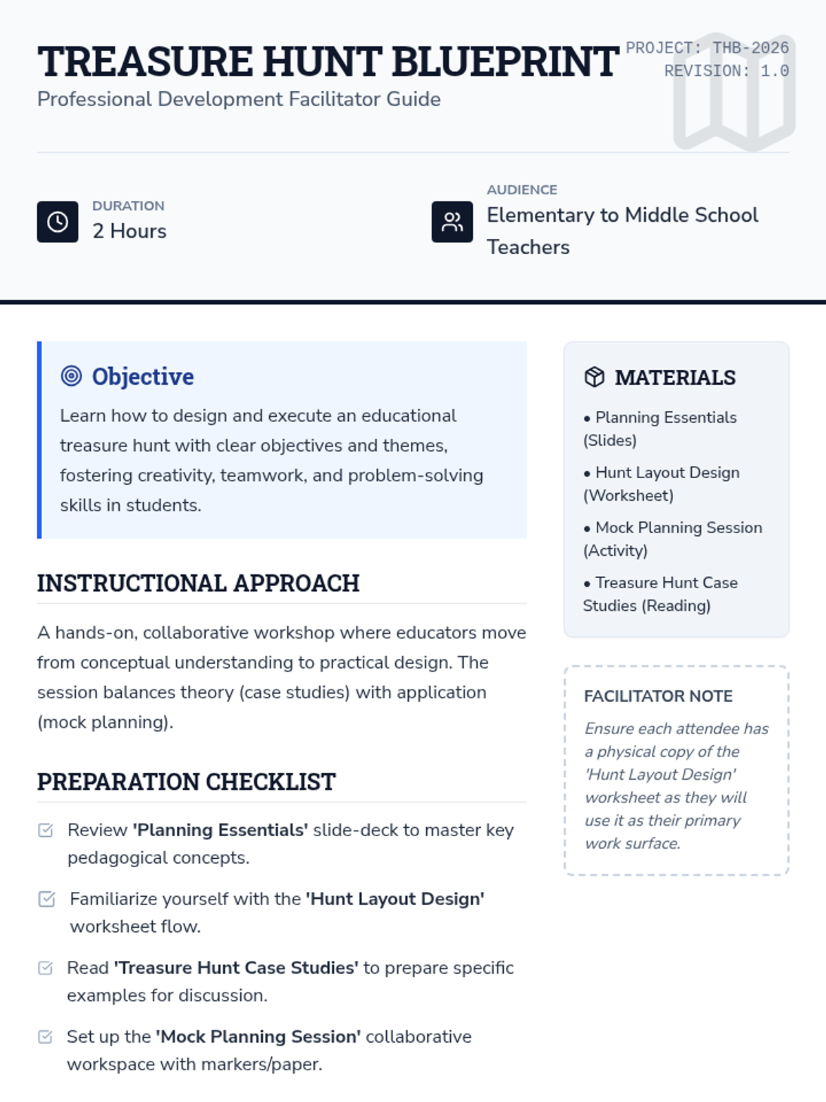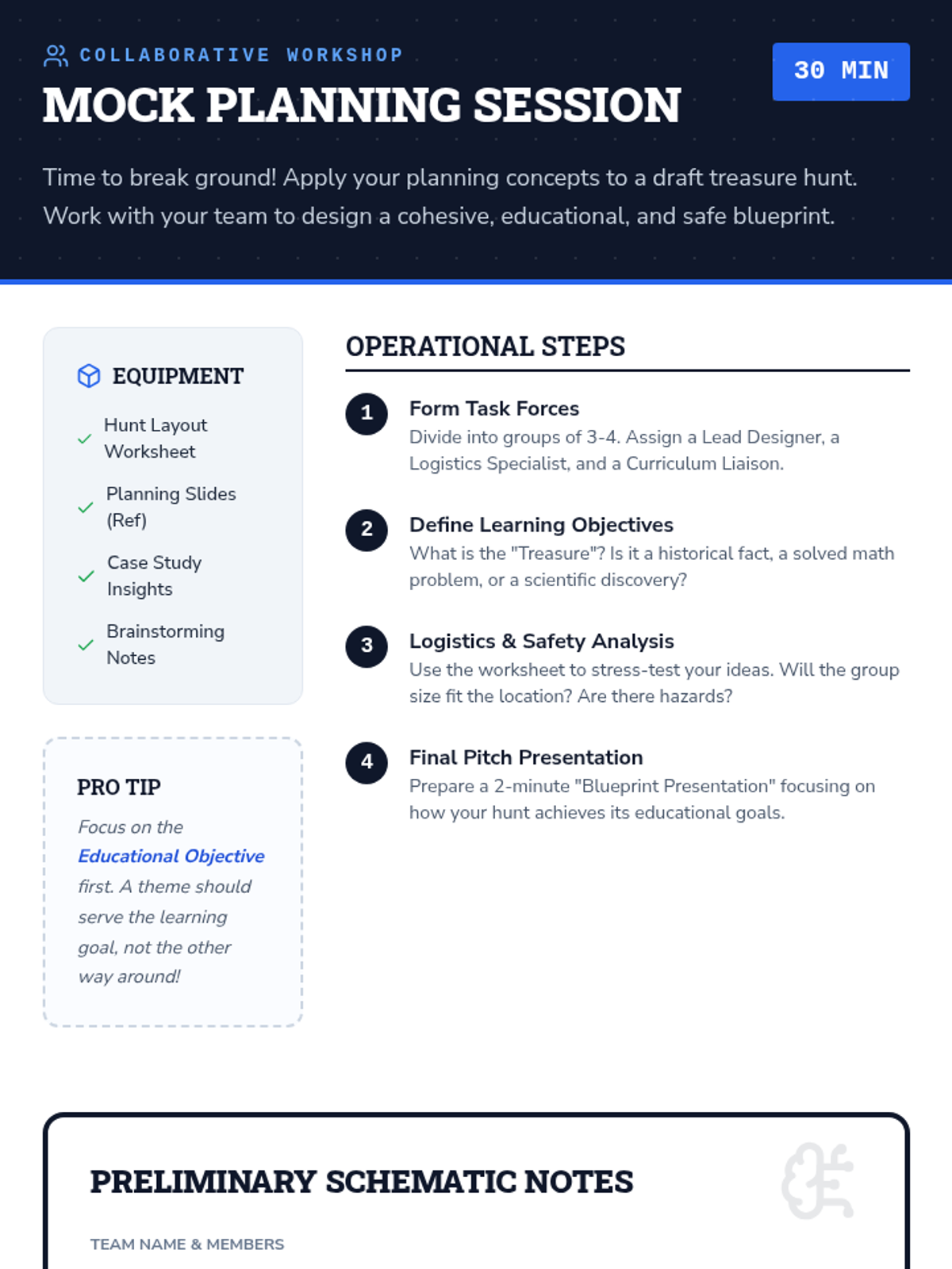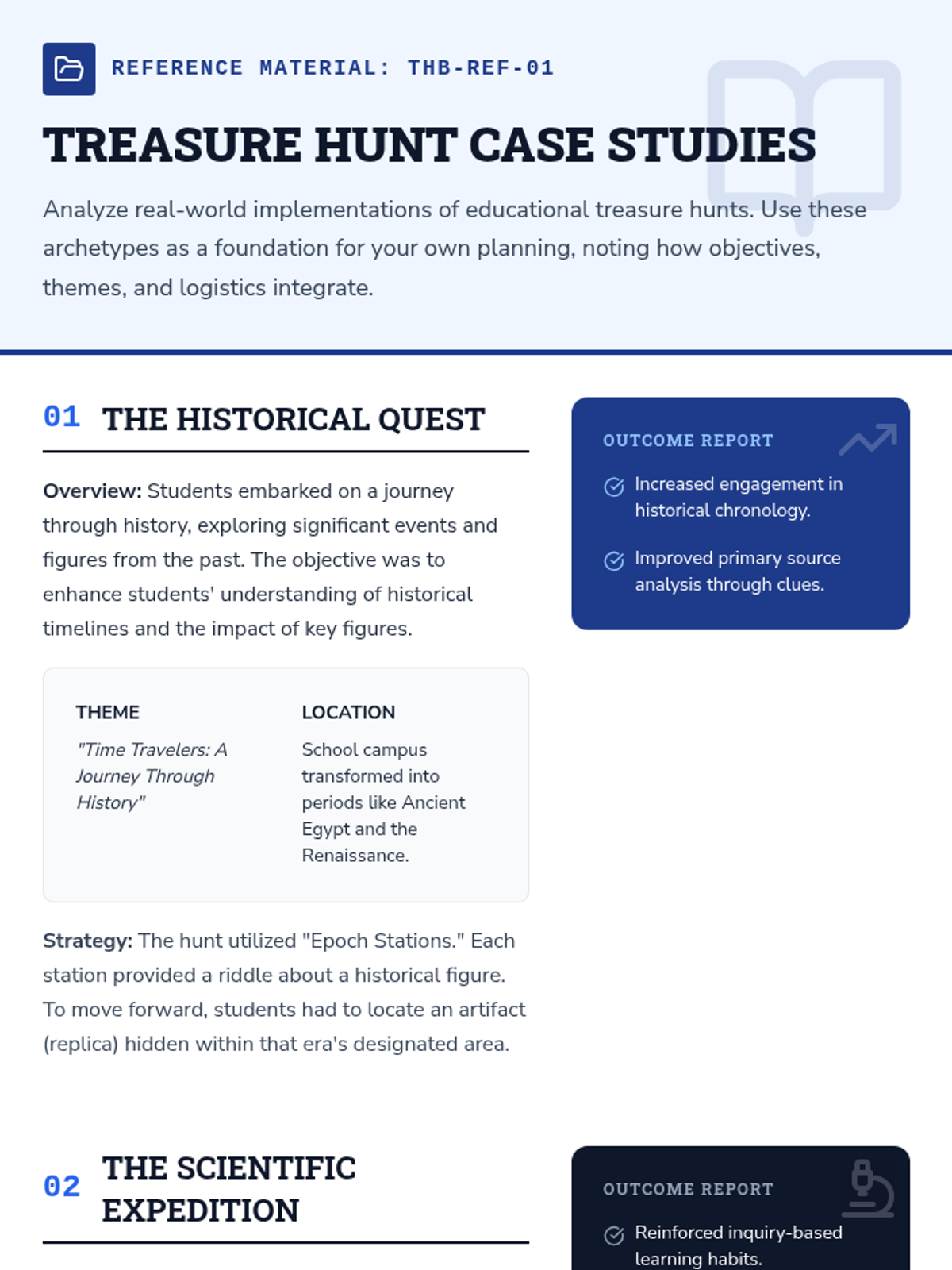 A comprehensive guide for teachers to design, plan, and execute educational treasure hunts, covering everything from objective setting to logistical execution.