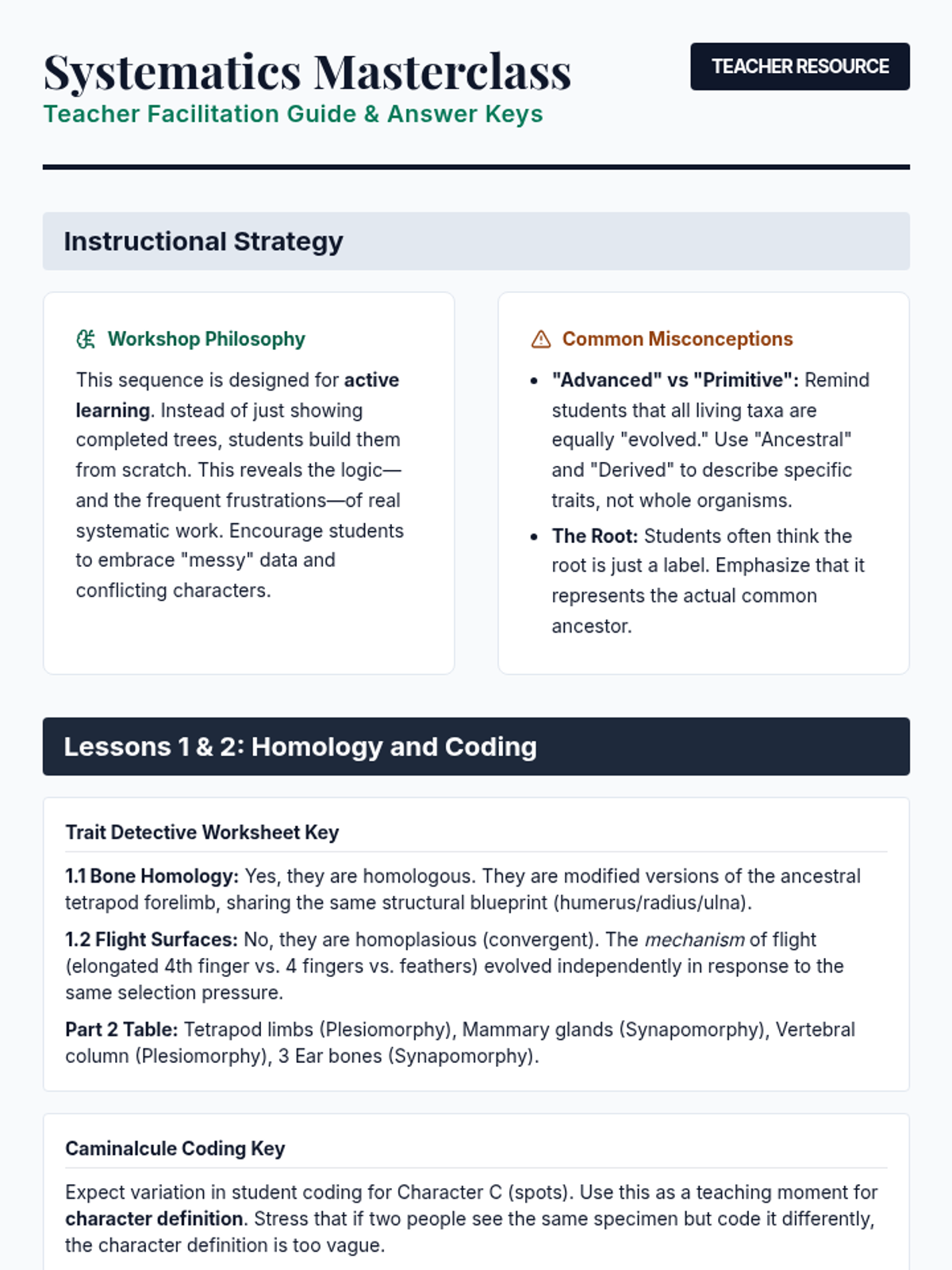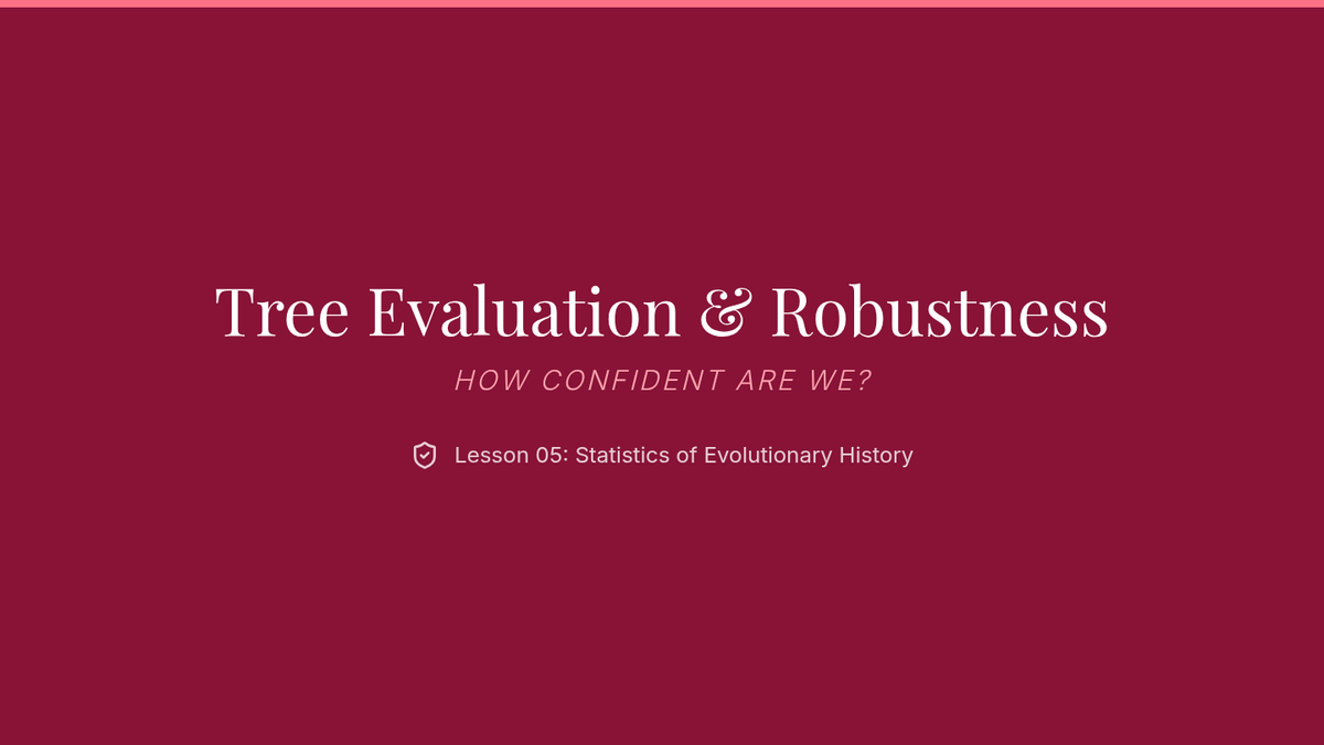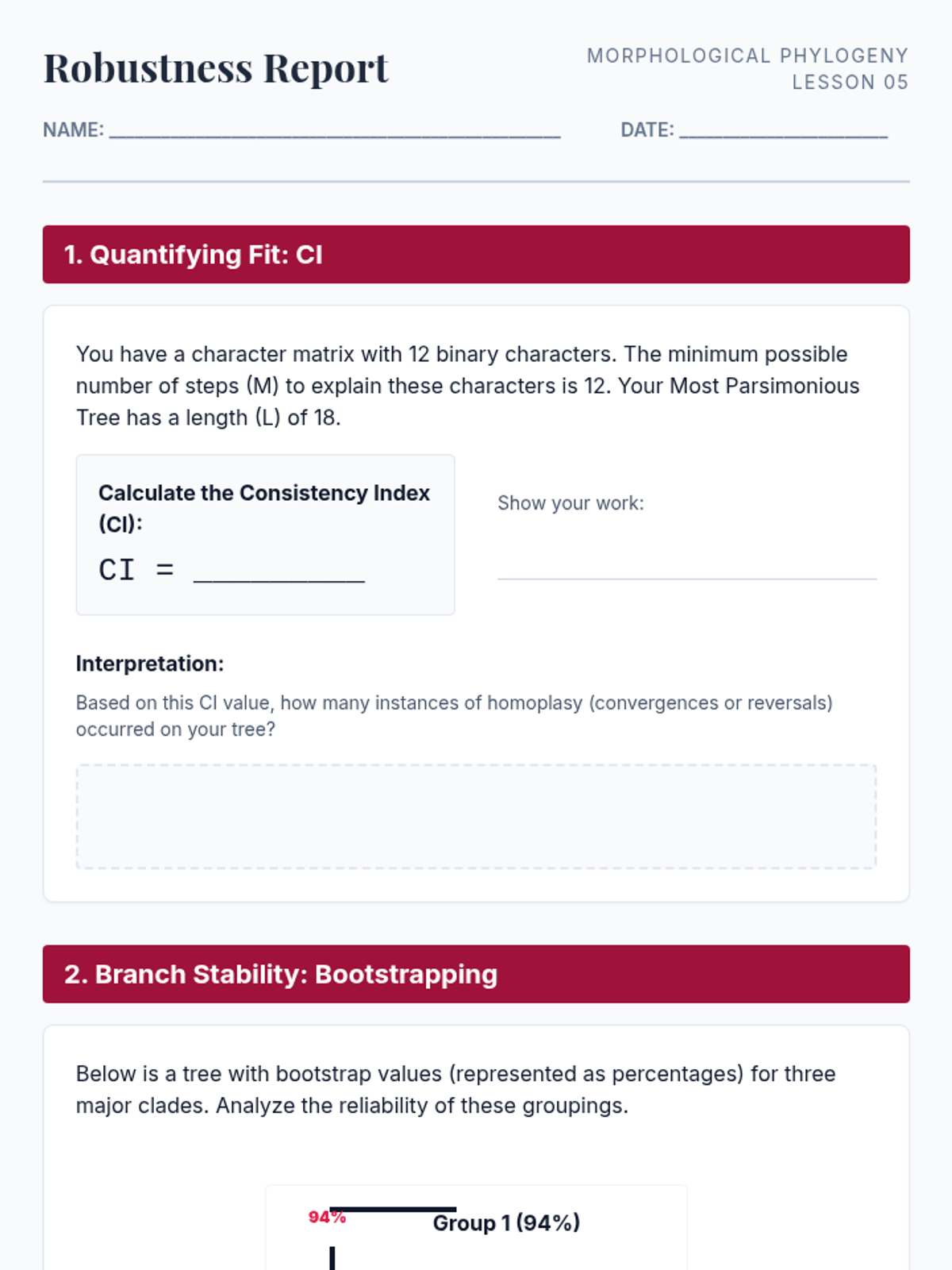 Students learn statistical methods to evaluate the robustness of their trees, including Consistency Index (CI) and Retention Index (RI). The lesson touches on consensus trees when multiple equally parsimonious trees exist.