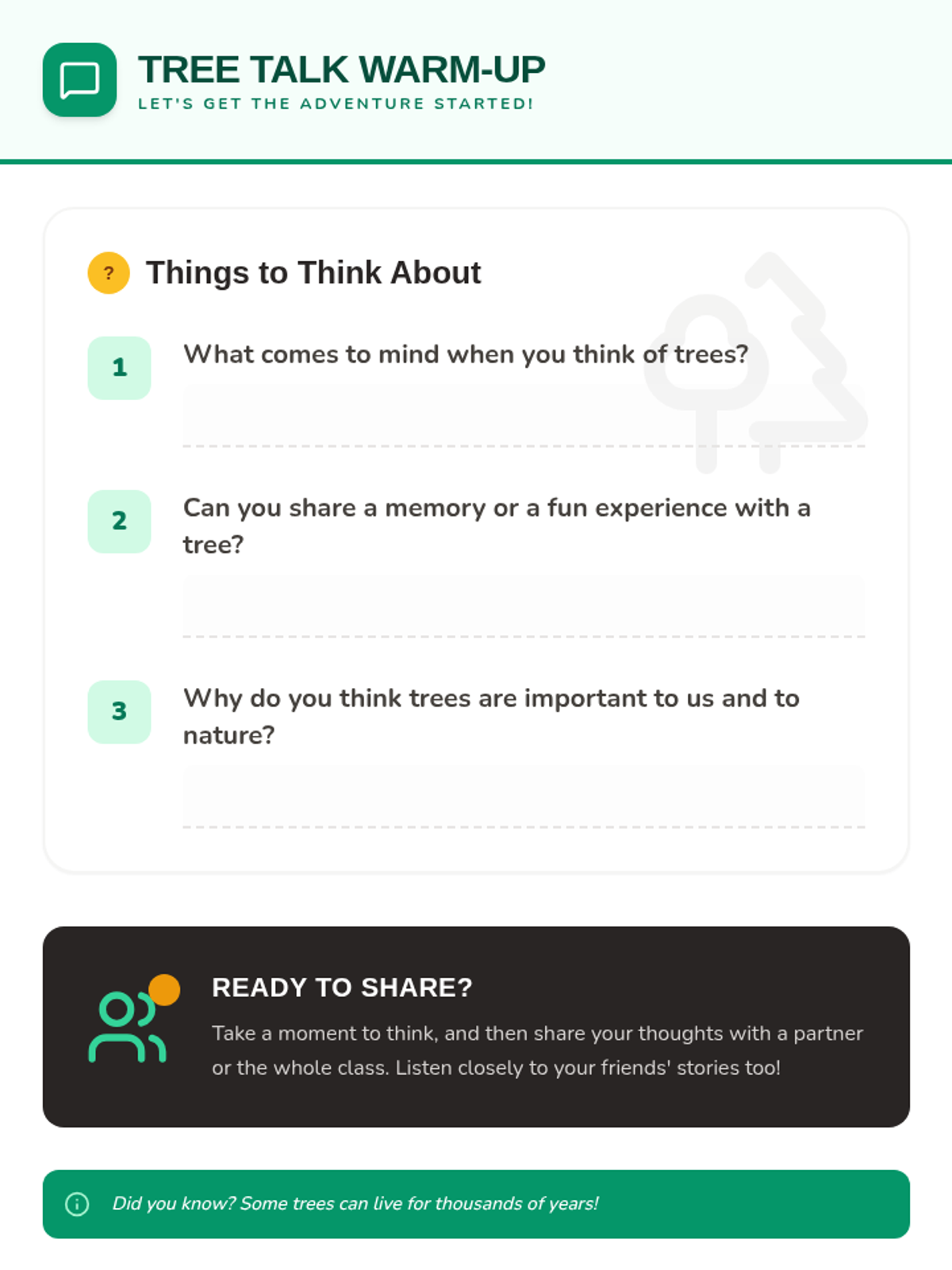 In this engaging 30-minute session for Grades K-5, students explore the fascinating world of trees, their anatomy, and their vital role in the environment through interactive discussion, games, and a creative project.