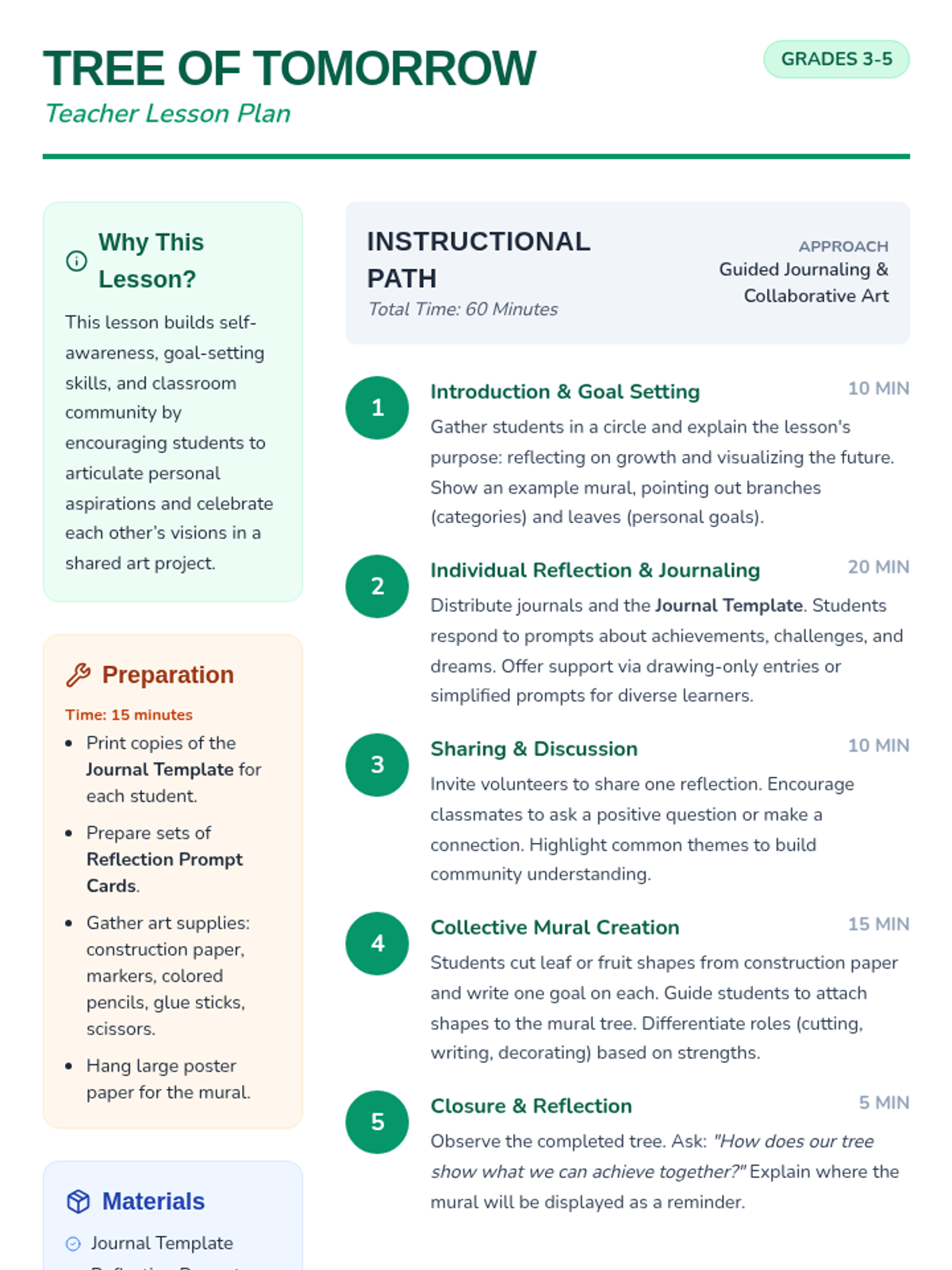 A growth-focused lesson for Grades 3-5 where students reflect on personal progress and set aspirations through journaling and a collaborative mural project.
