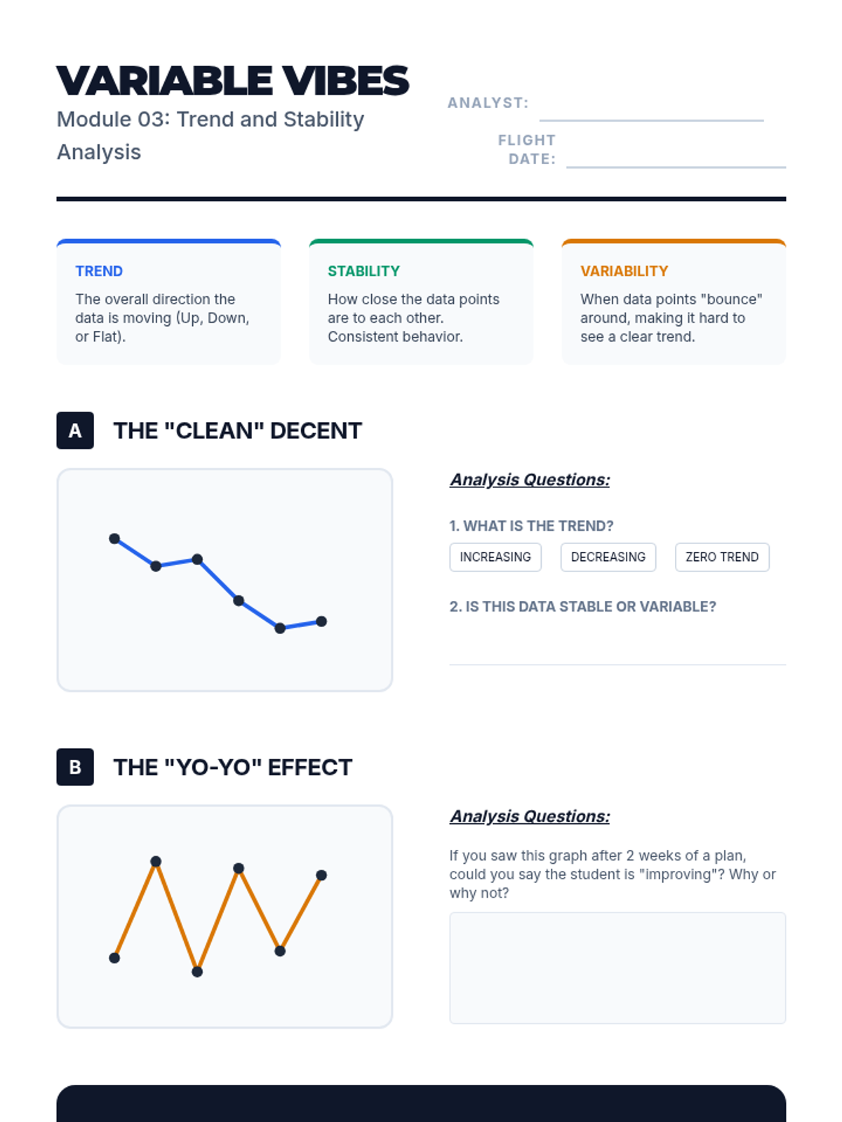 Students examine graphs to identify trends and data stability, discussing the impact of variability on decision-making.