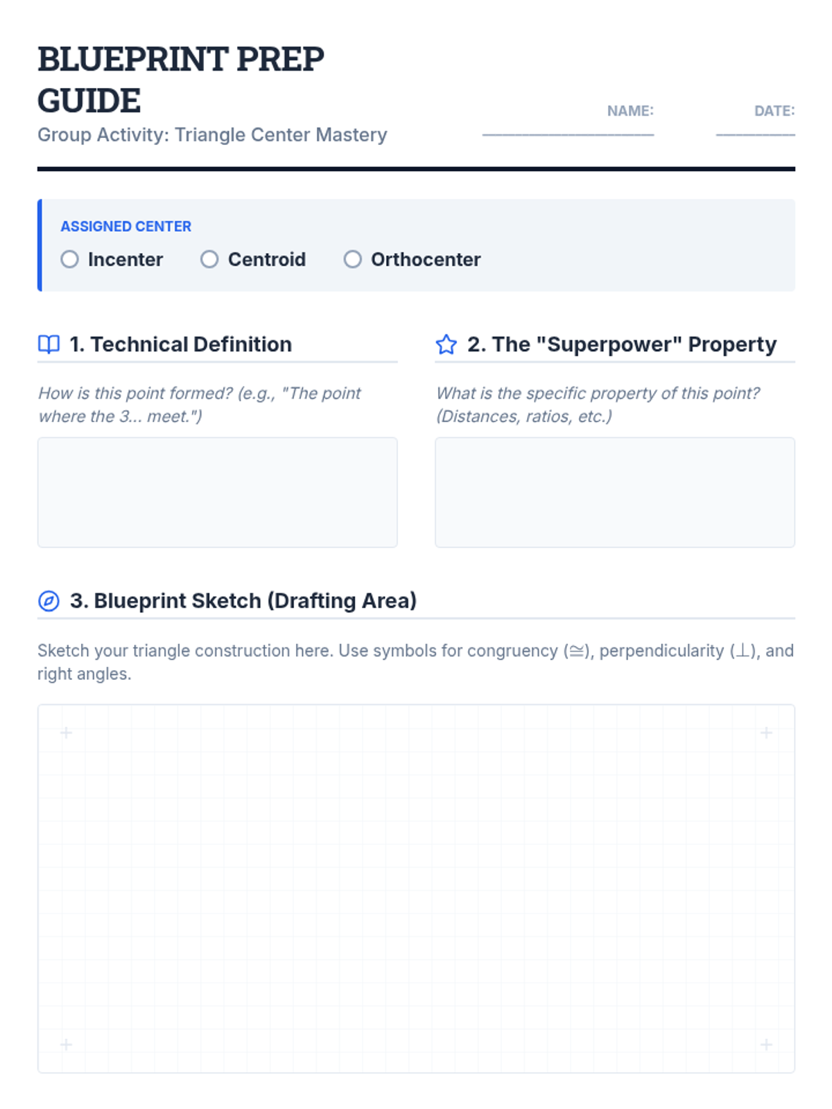 A high-energy review lesson where students synthesize their knowledge of triangle centers (Incenter, Centroid, and Orthocenter) by creating technical 'Blueprint' posters and teaching their peers.