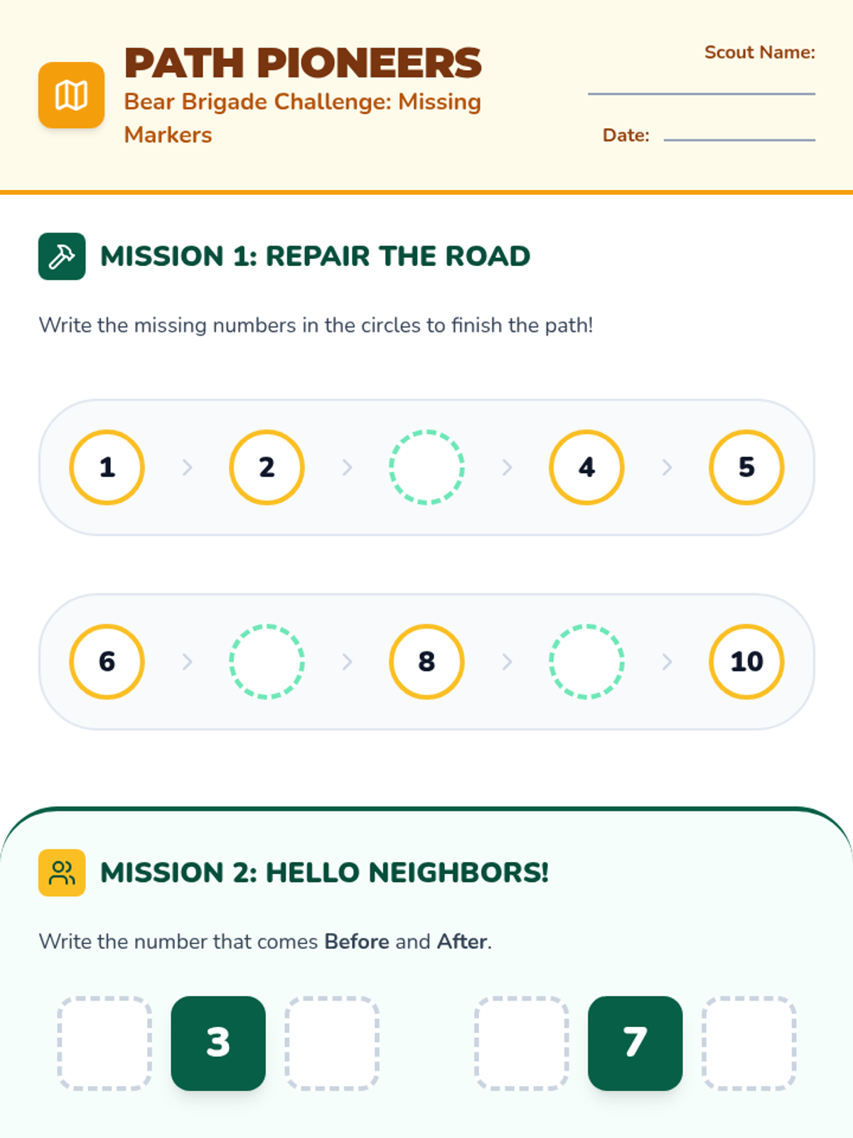 Students explore the concept of number order and number lines from 1 to 10, helping lost bears find their way back to camp by filling in missing numbers on a forest path.