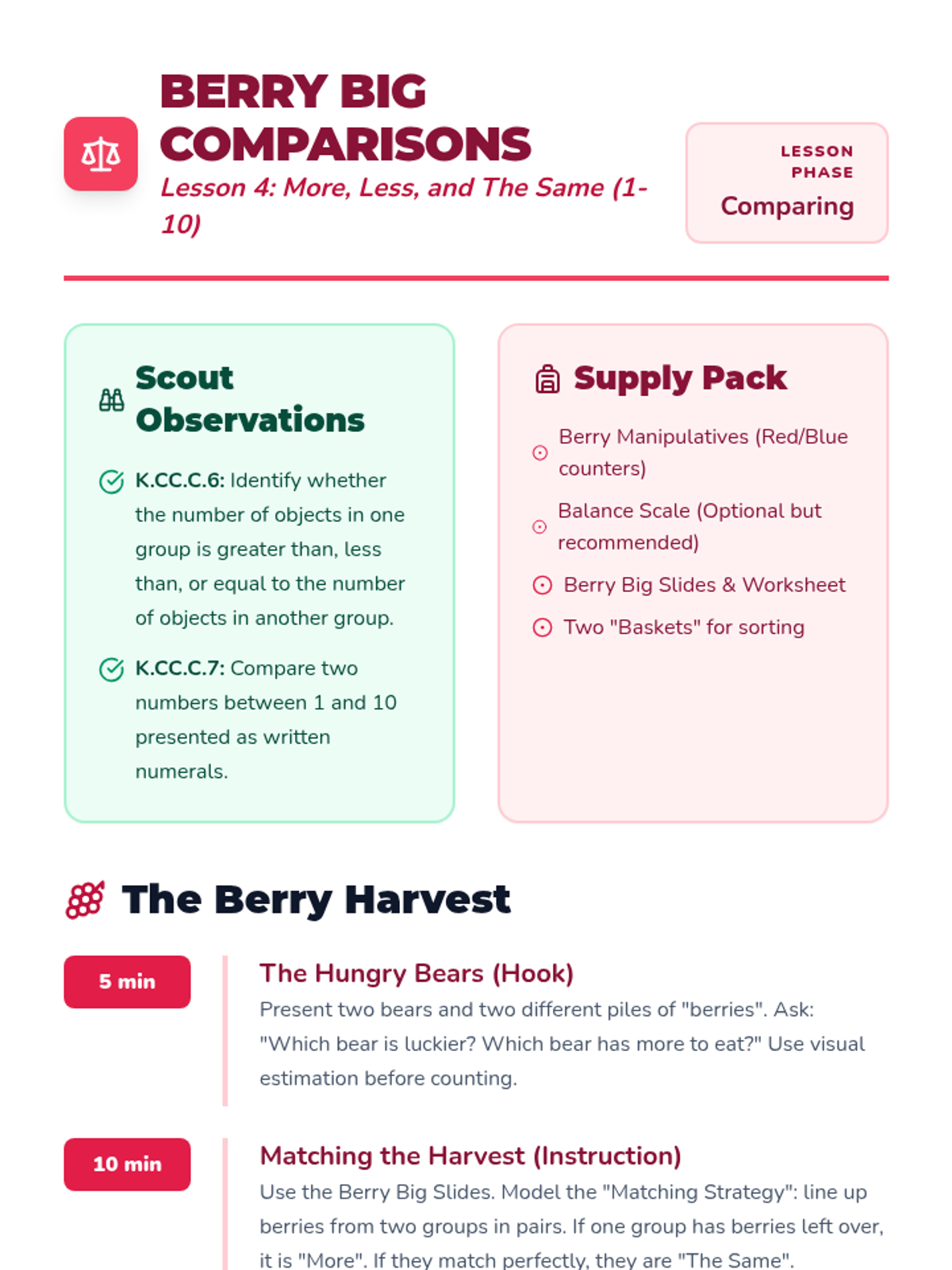 The introductory lesson of the Bear Brigade Math sequence, focusing on mastering counting and one-to-one correspondence for numbers 1-5 using counting bears and nature-themed visuals.