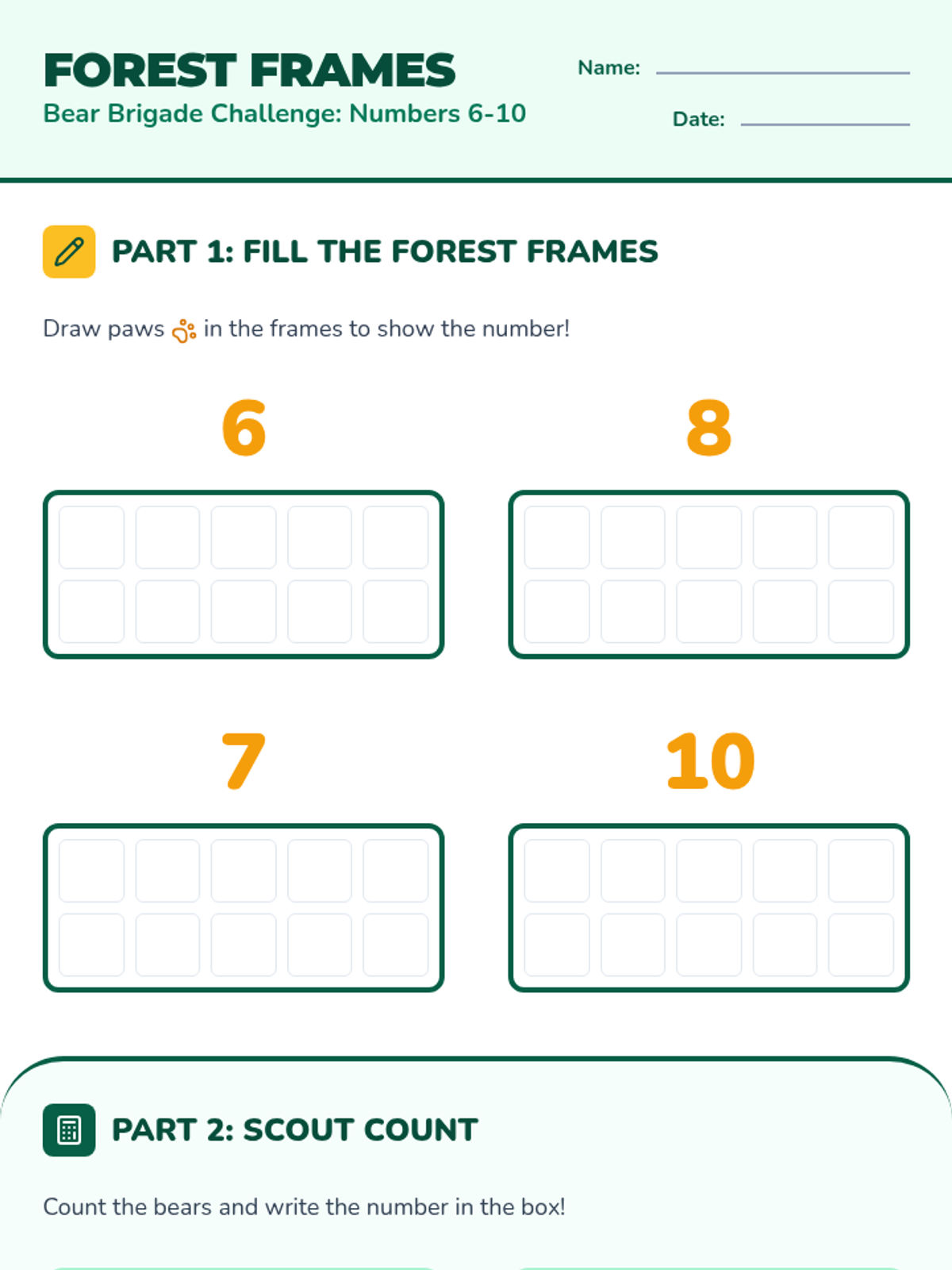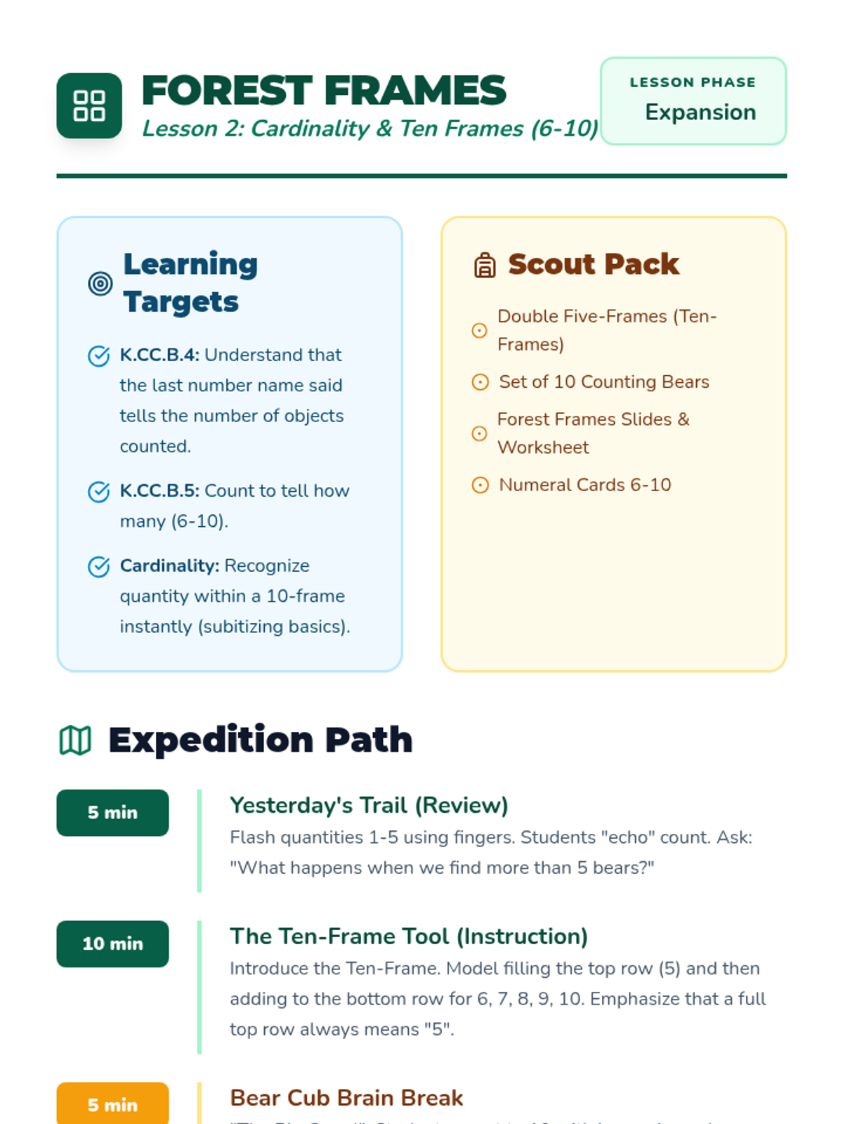 A lesson focusing on counting from 6 to 10, introducing ten frames to help students visualize quantities and understand the concept of cardinality in a woodland forest setting.