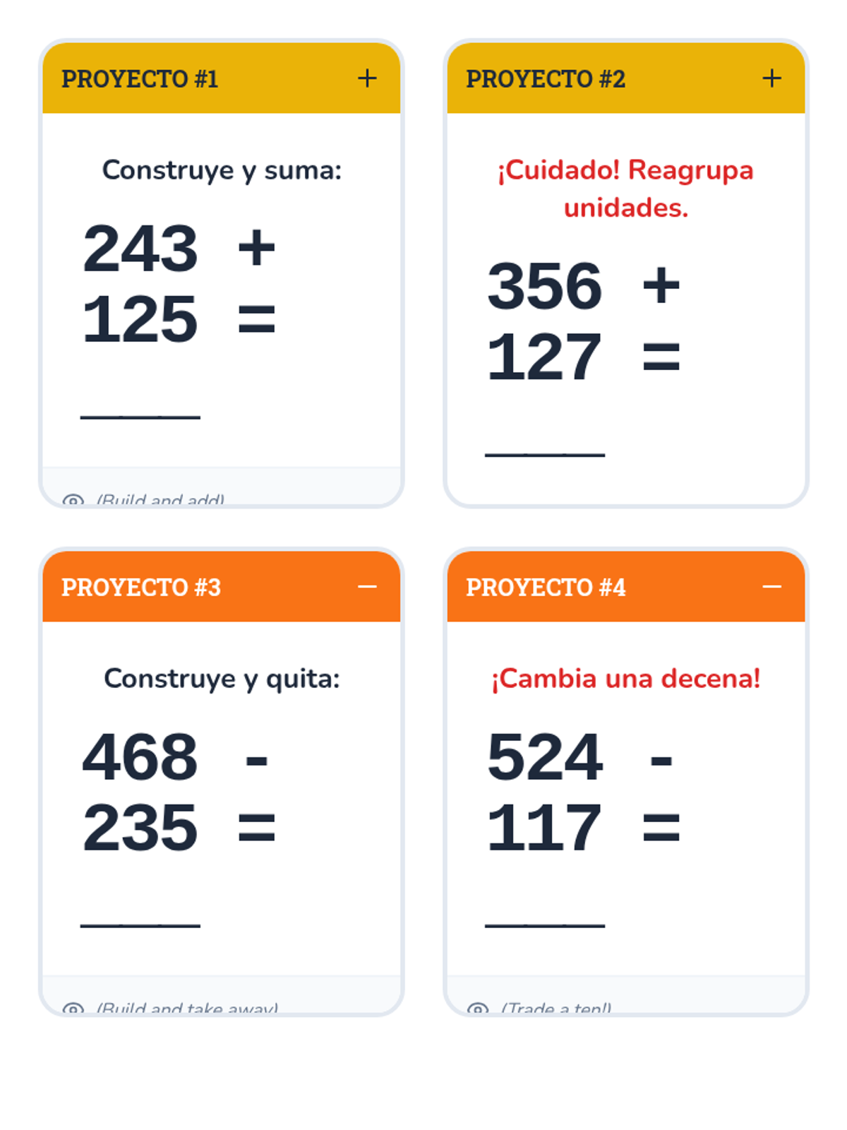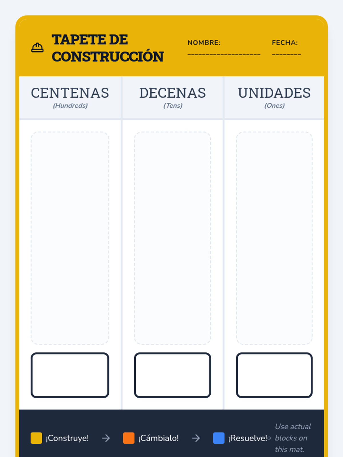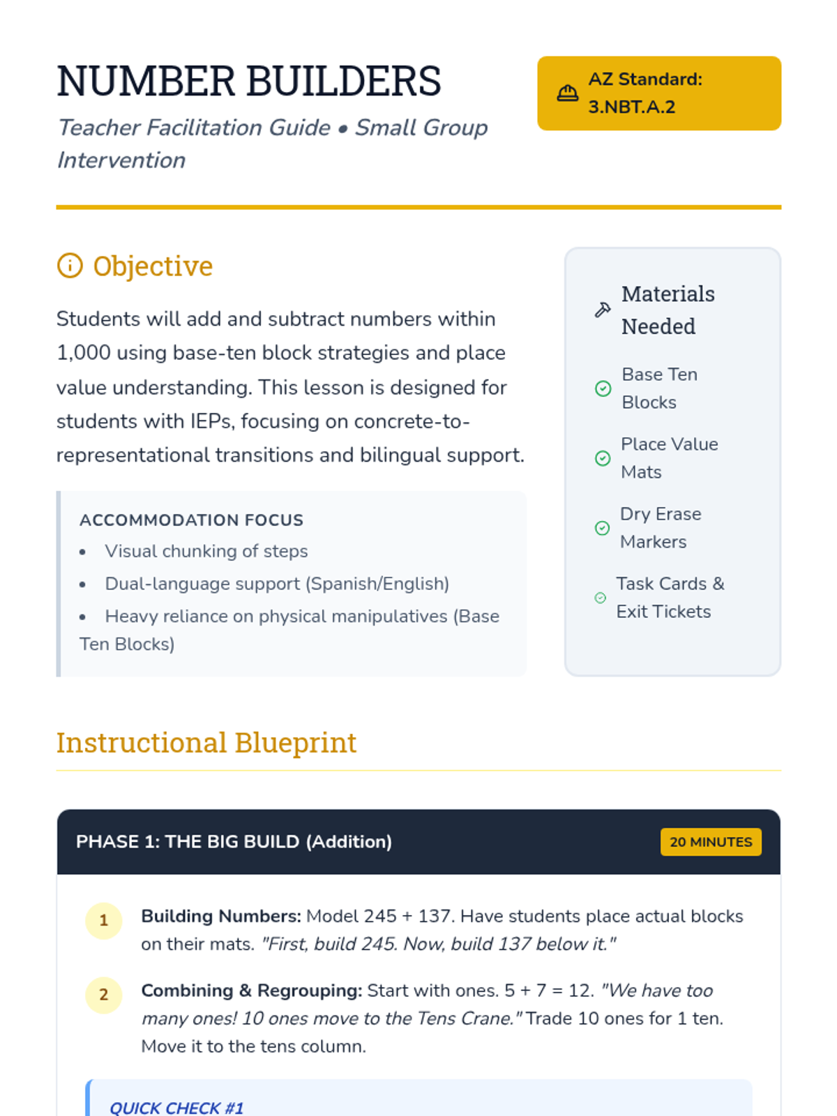 A targeted small-group lesson focused on adding and subtracting within 1,000 using base-ten strategies, designed for students with IEPs with a construction theme. Includes step-by-step chunking and Spanish translations for all student materials.