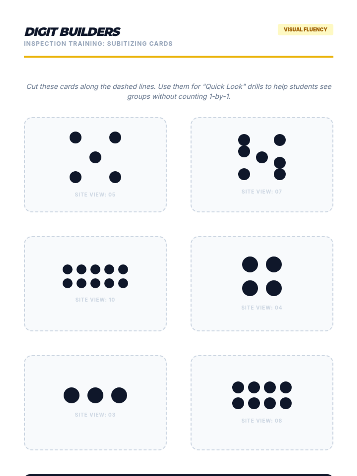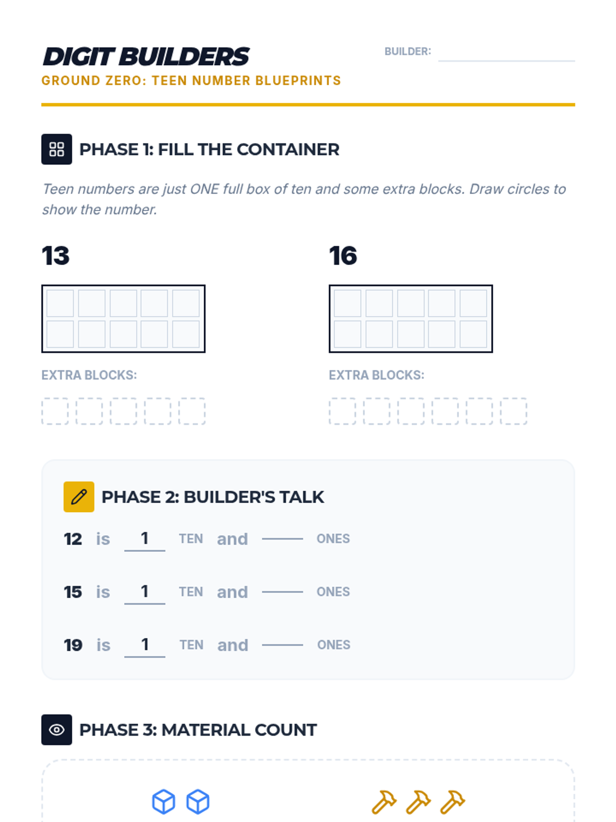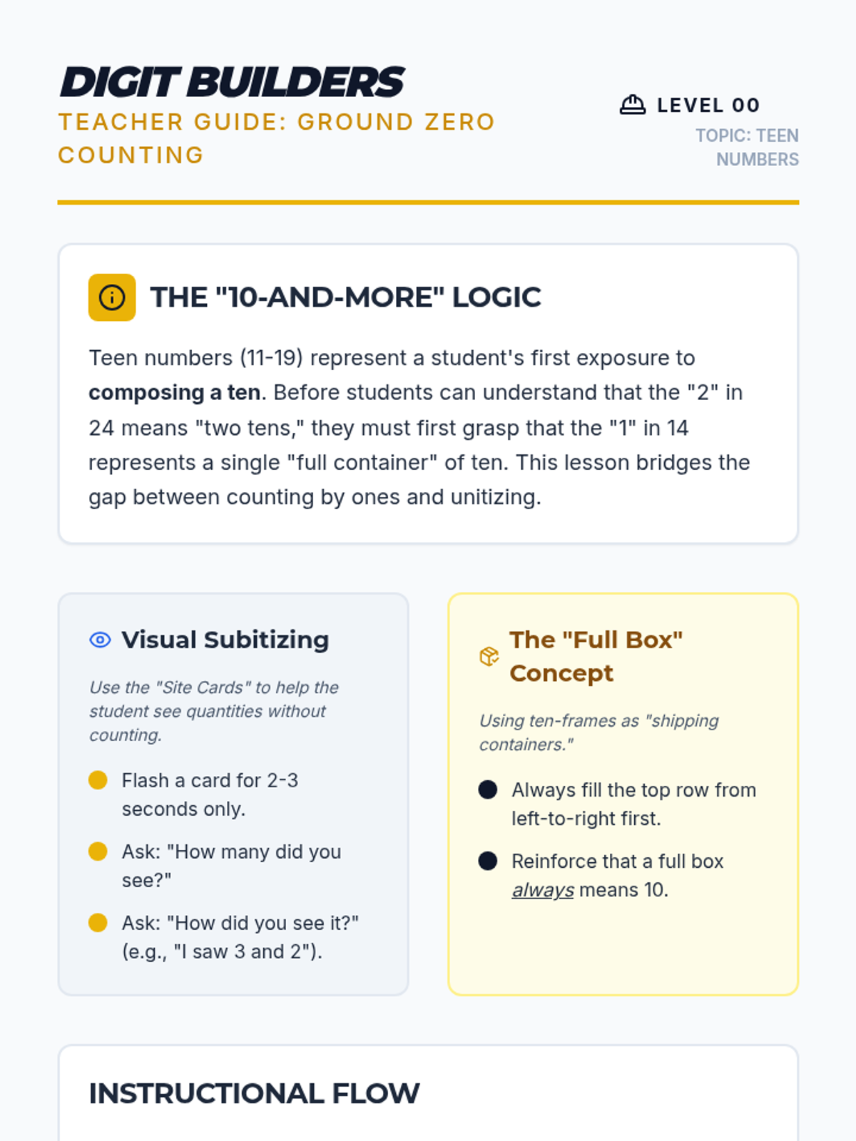 A foundational entry point for students working at a K-1 level. This lesson focuses on teen numbers (11-19) as a 'full container of ten' plus extra units, and reinforces 1-to-1 correspondence and subitizing.