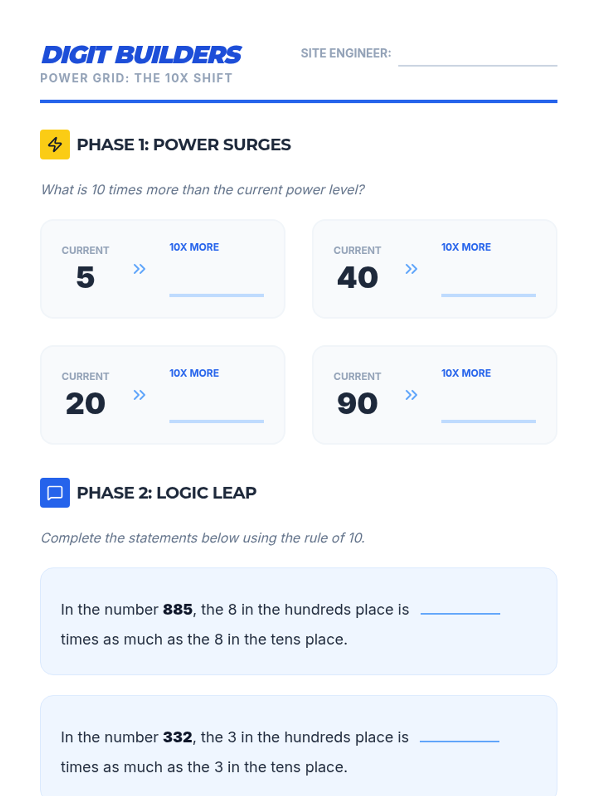 Exploring the 10x relationship between ones, tens, and hundreds. Students learn how digits shift and change value as they move across the 3-digit place value chart.