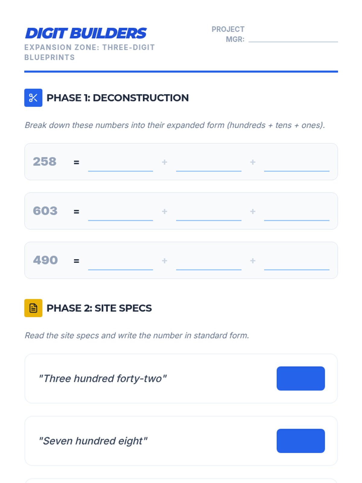 Expanding to three-digit numbers, focusing on hundreds and the relationship between standard form, expanded form, and word form. Students 'blue-print' numbers across three places.