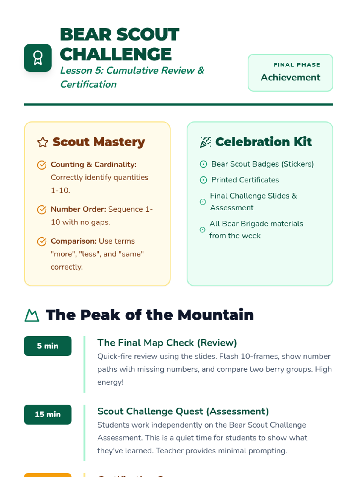 The final review and assessment for the week, where students demonstrate their mastery of counting, ordering, and comparing numbers 1-10 through a series of 'scout challenges'.