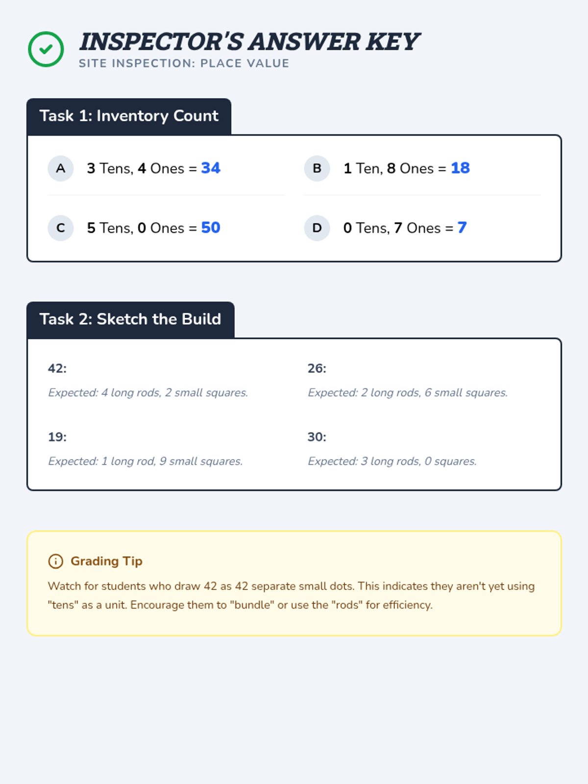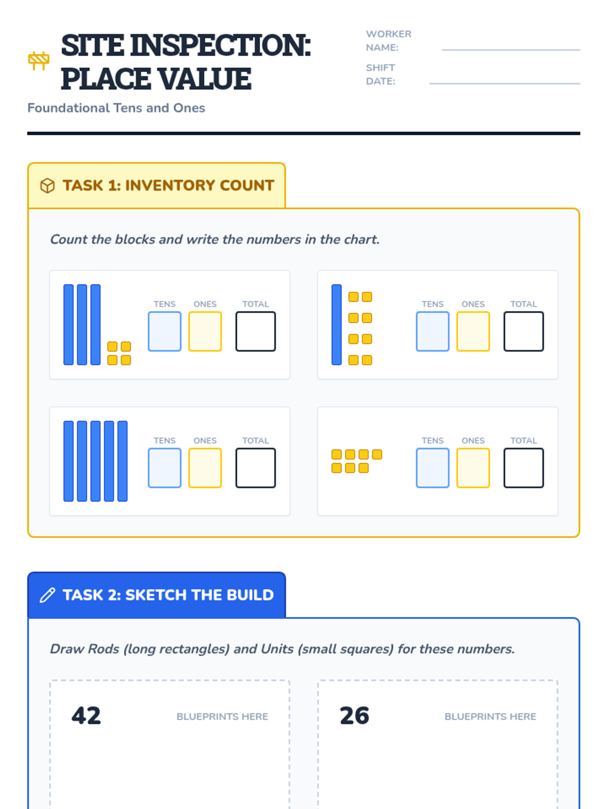 A foundational lesson on place value (tens and ones) using base-ten block visuals and construction-themed hands-on activities.