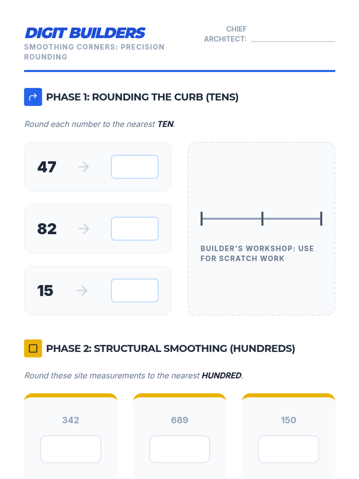 Applying place value knowledge to round 2-digit and 3-digit numbers to the nearest ten and hundred using number lines and visual benchmarks.
