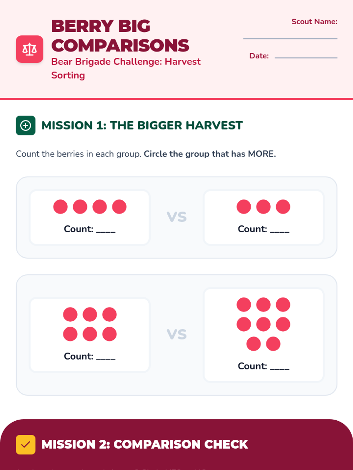 An introduction to comparing quantities up to 10, using groups of berries and bears to learn the language of 'more than', 'less than', and 'the same as'.