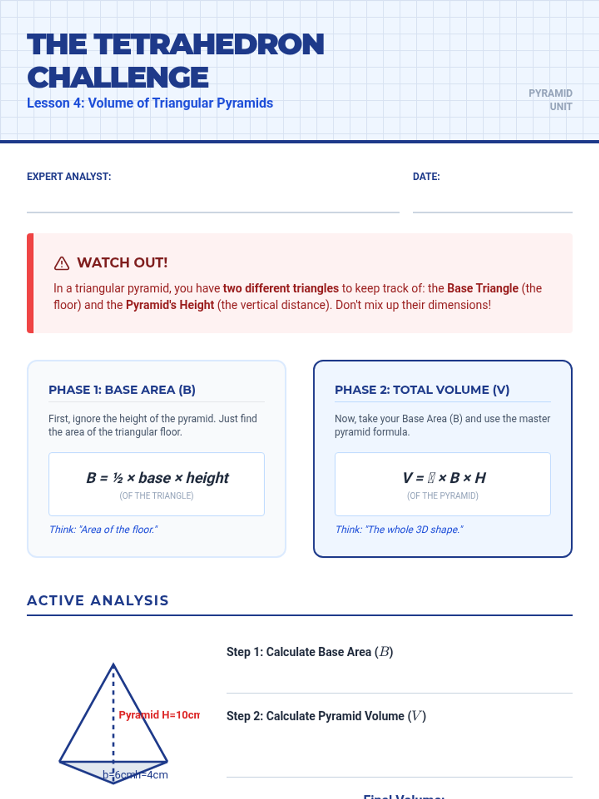 Students apply the 1:3 ratio to triangular bases, requiring multi-step calculations to find base area before finding pyramid volume.